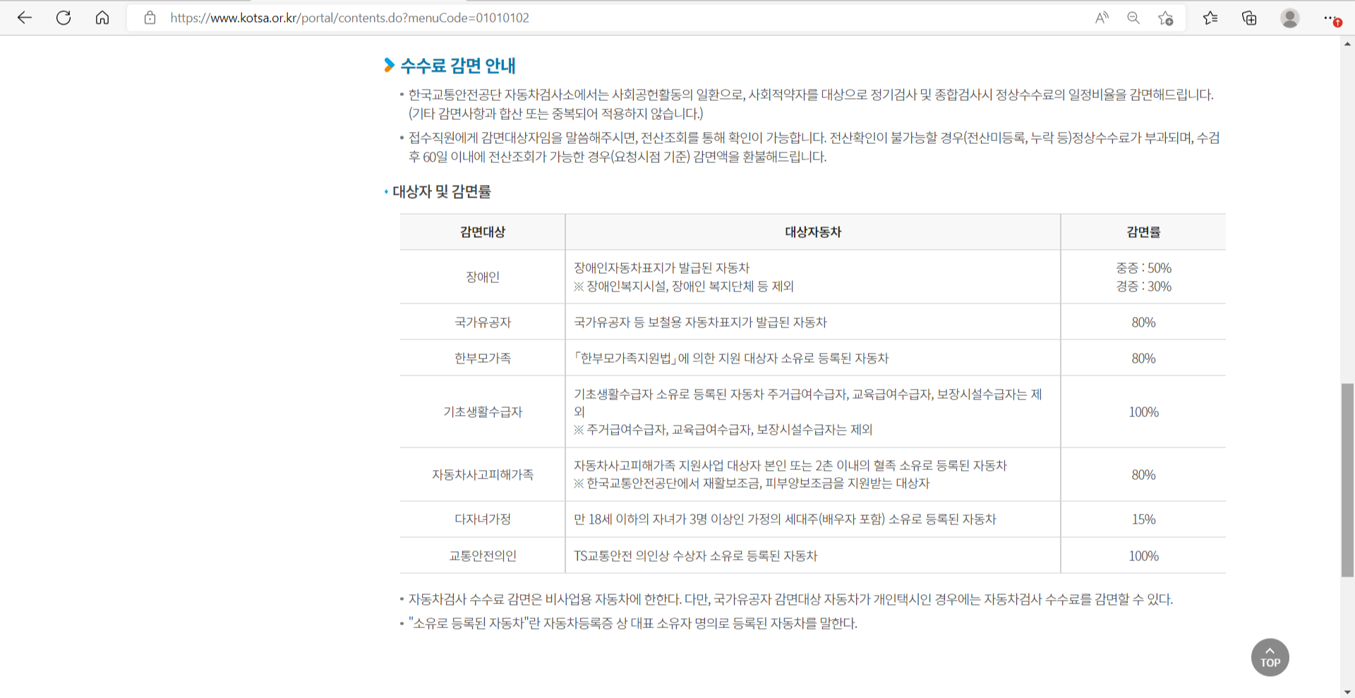 자동차 검사 할인대상 및 할인율은 위 표를 참조