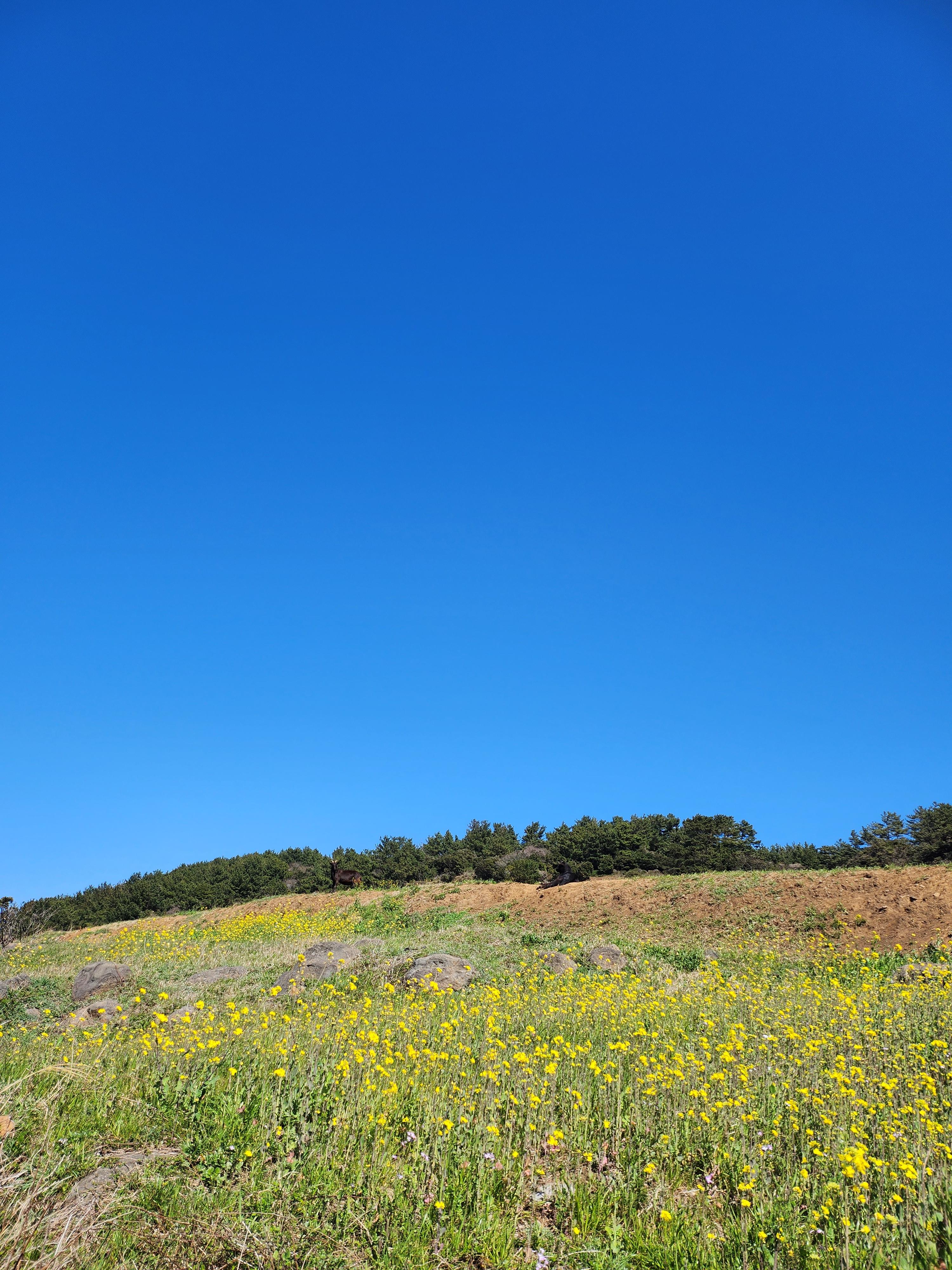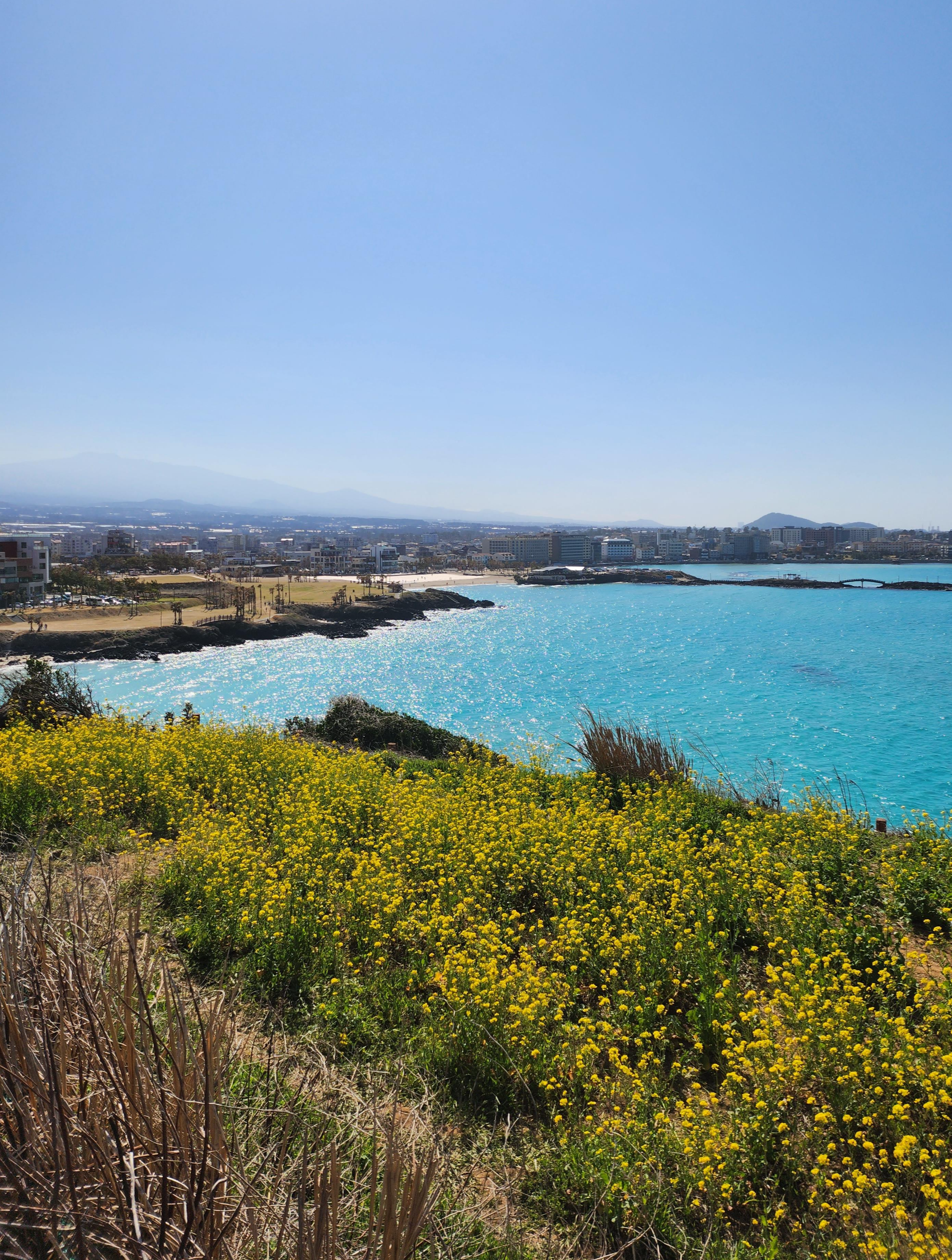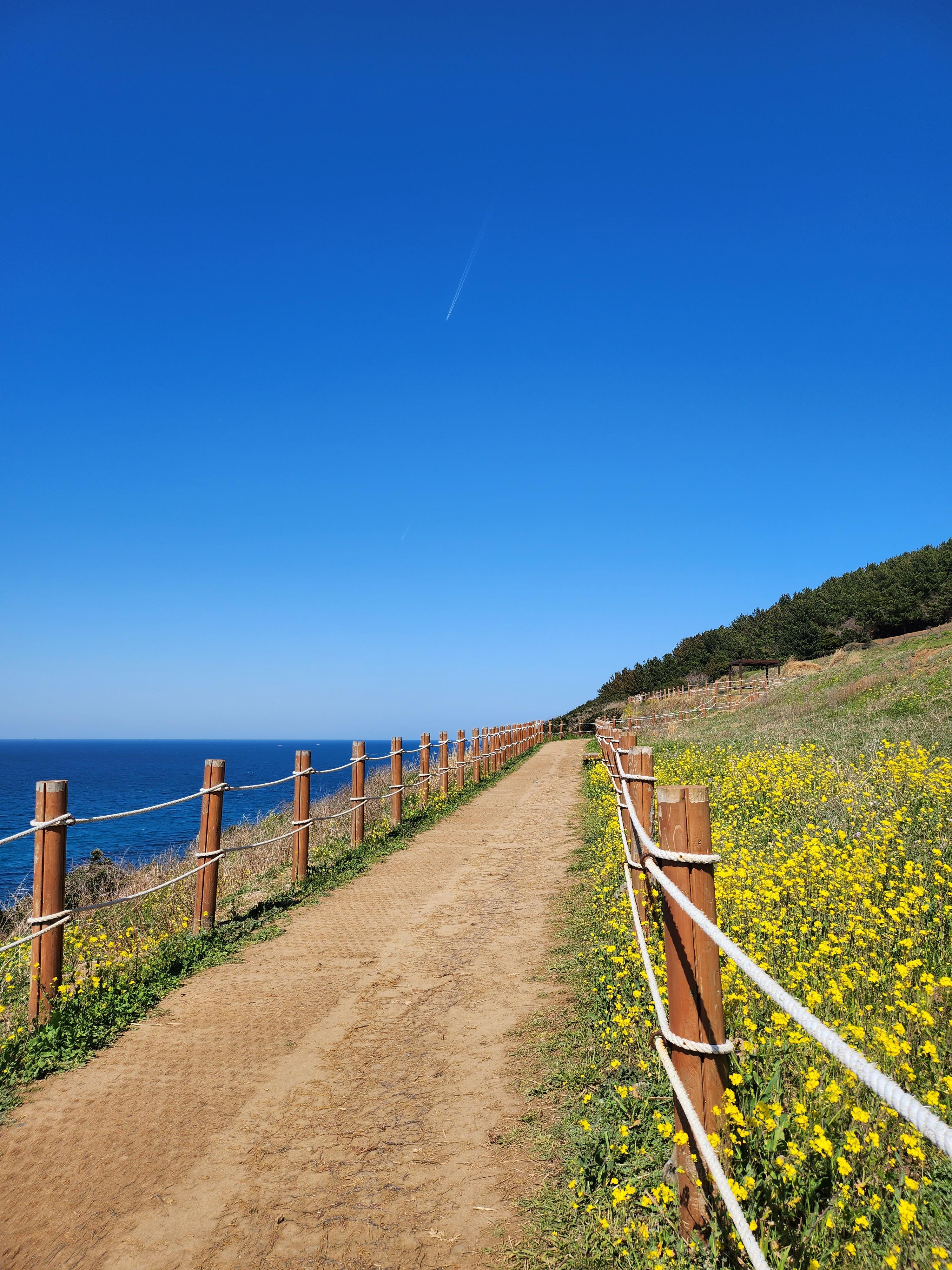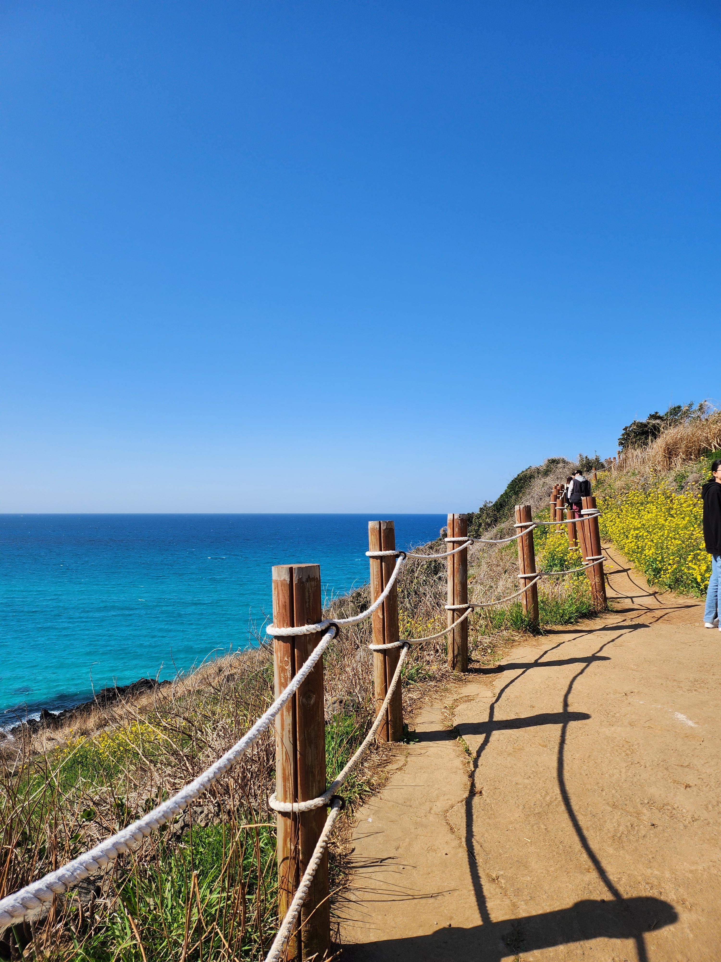 이날은 유독 햇볕이 좋아서 걷기에 좋은 날이었을뿐만 아니라 바다빛도 에메랄드로 너무나 아름다운 날이었어요. 오른쪽으로는 노랗게 피어난 유채꽃과 왼쪽으로는 에메랄드빛 바다가 끝없이 펼쳐진 서우봉 둘레길입니다.