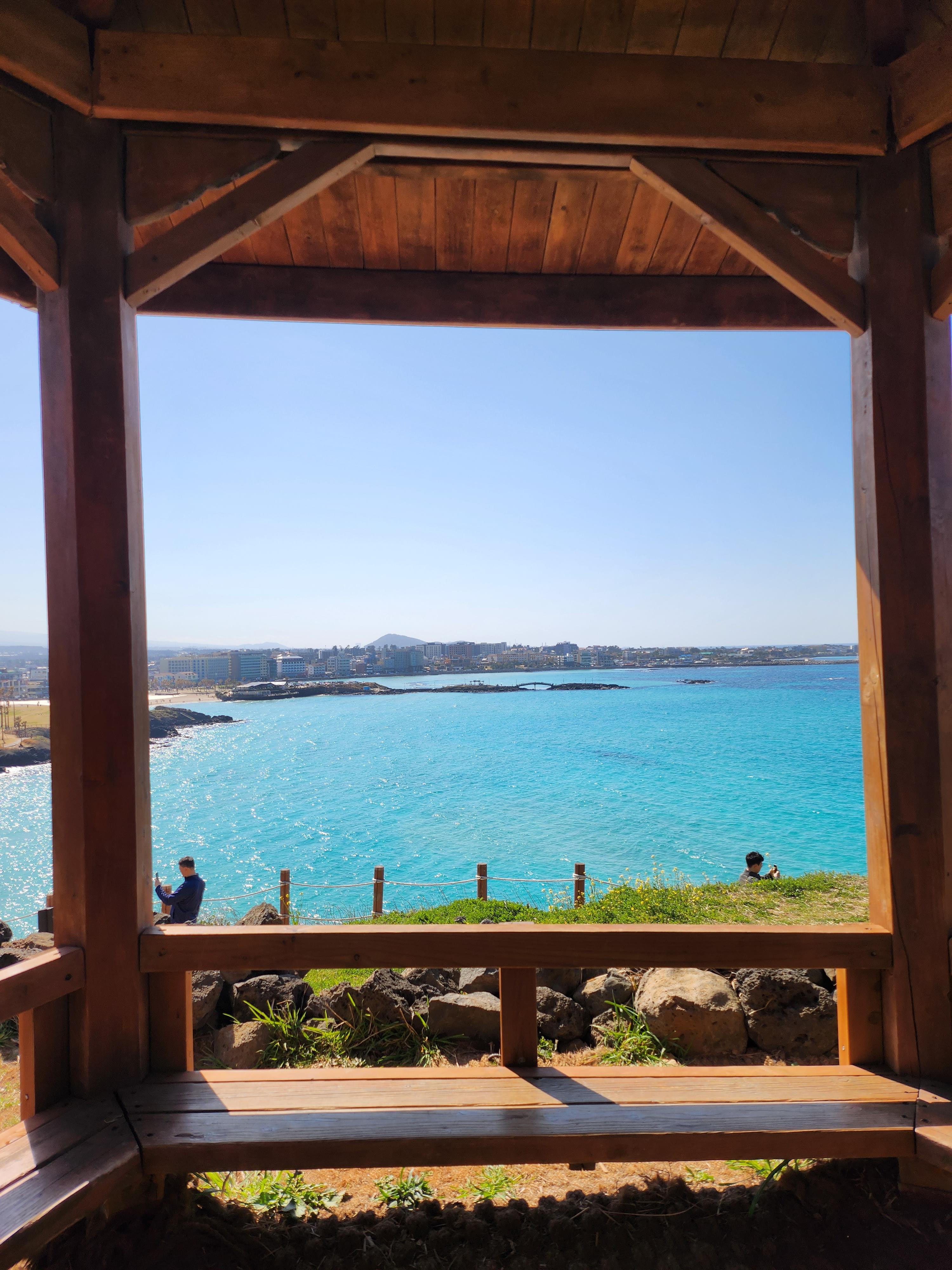 둘레길도 걸었고, 예쁜 꽃도 보았으니 정자에서 바다를 담은 액자 사진도 기념으로 한장 남겨줘야겠죠? 원래는 사람이 늘 끊이지 않는 곳인데 마침 다른 사람이 없어서 재빠르게 사진을 찍어보았어요.