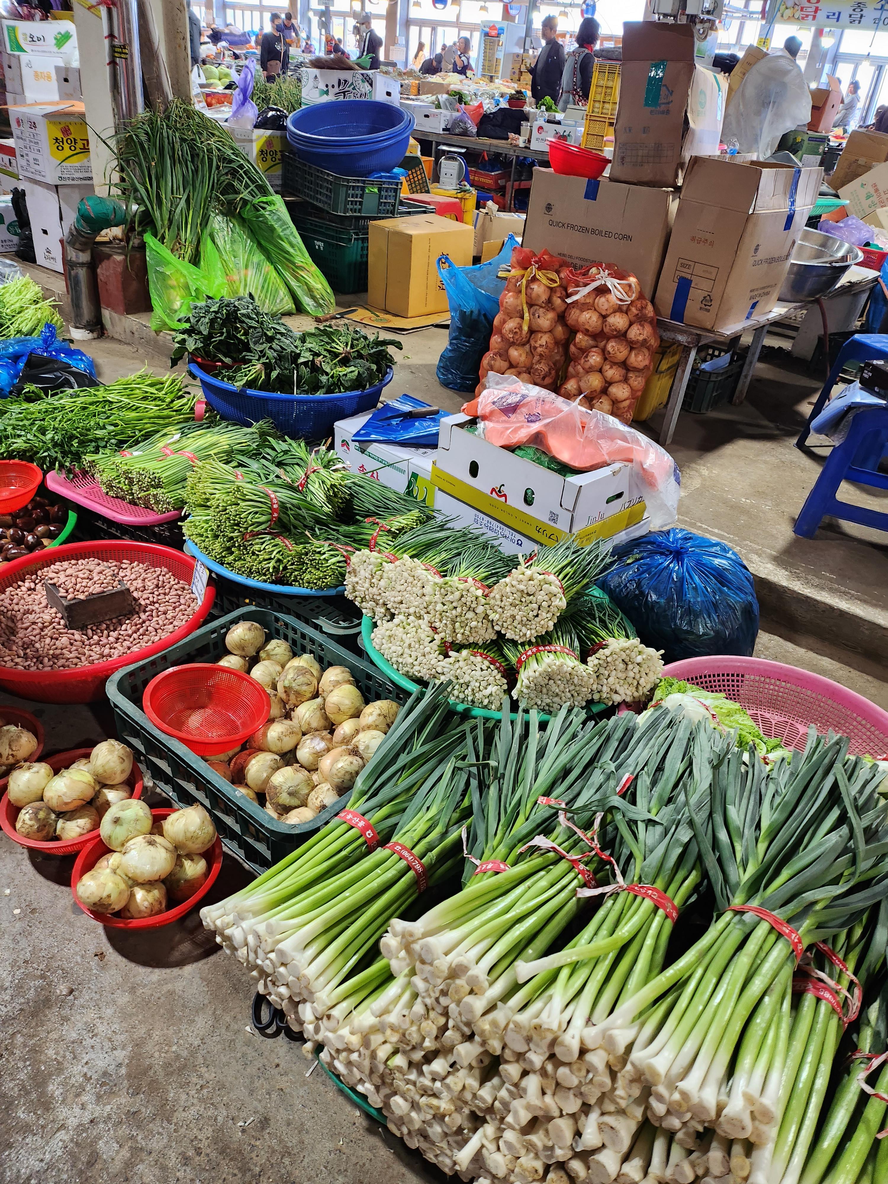 싱싱한 채소들도 있고 견과류 참기름, 과자, 밑반찬, 김치 등등 구석구석 돌아다니며 보는 재미가 있는 세화 오일장이다.