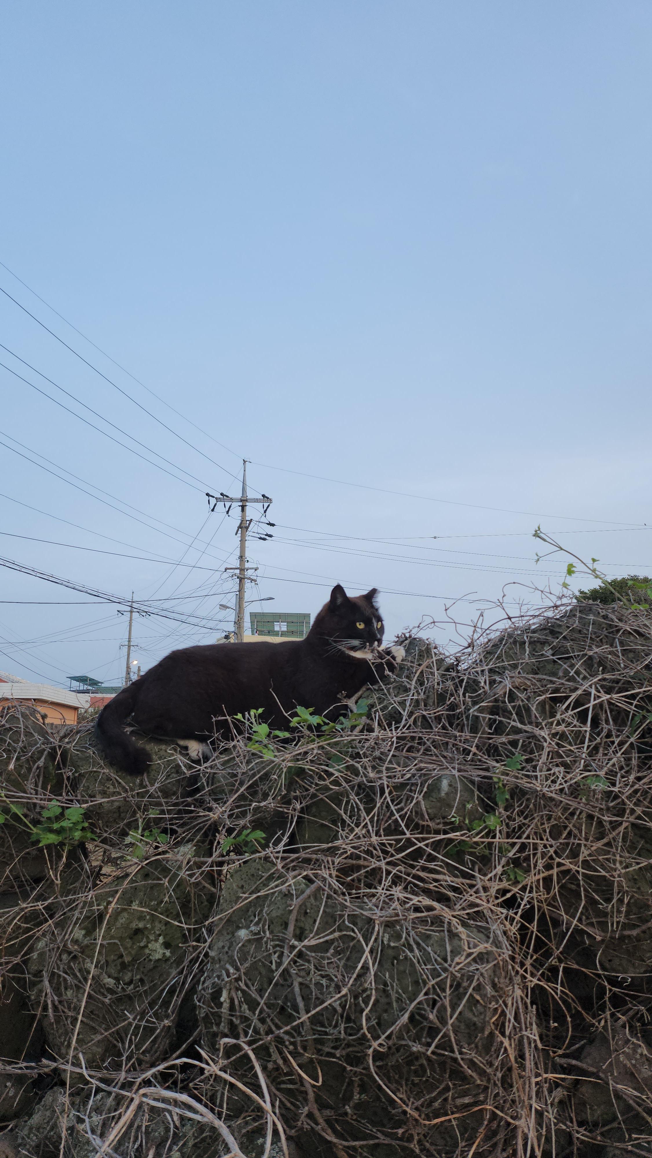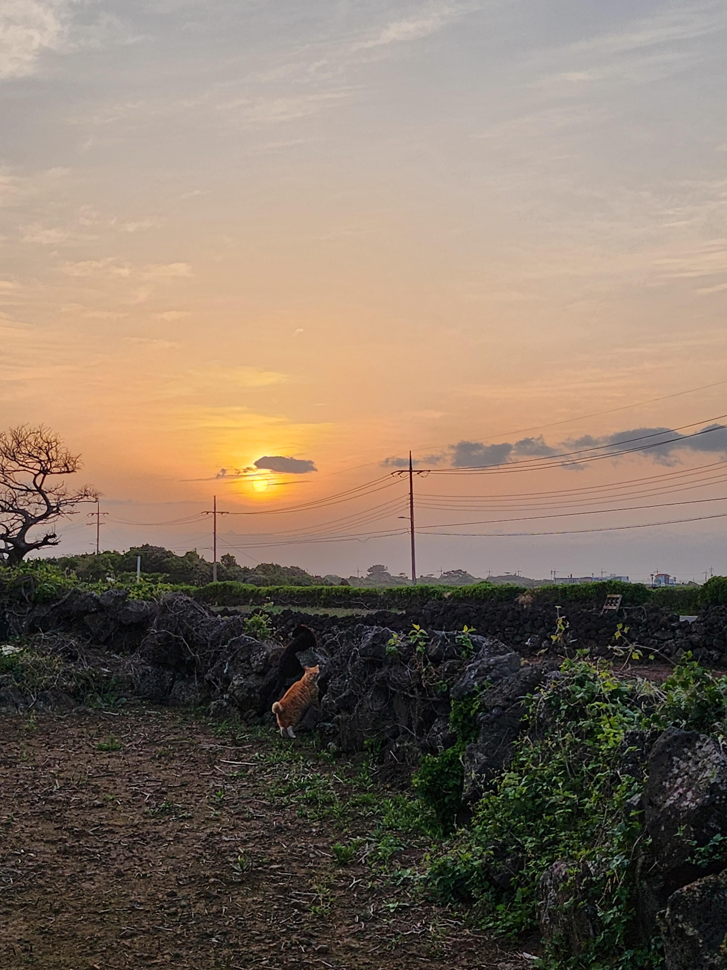 그리고는 다시 자리를 잡고 노을지는 모습을 바라보기 시작했다. 필통씨는 높은 돌담에 올라가 현무암인척하지만 하얀 양말 때문에 금방 눈에 띌 것 같다.