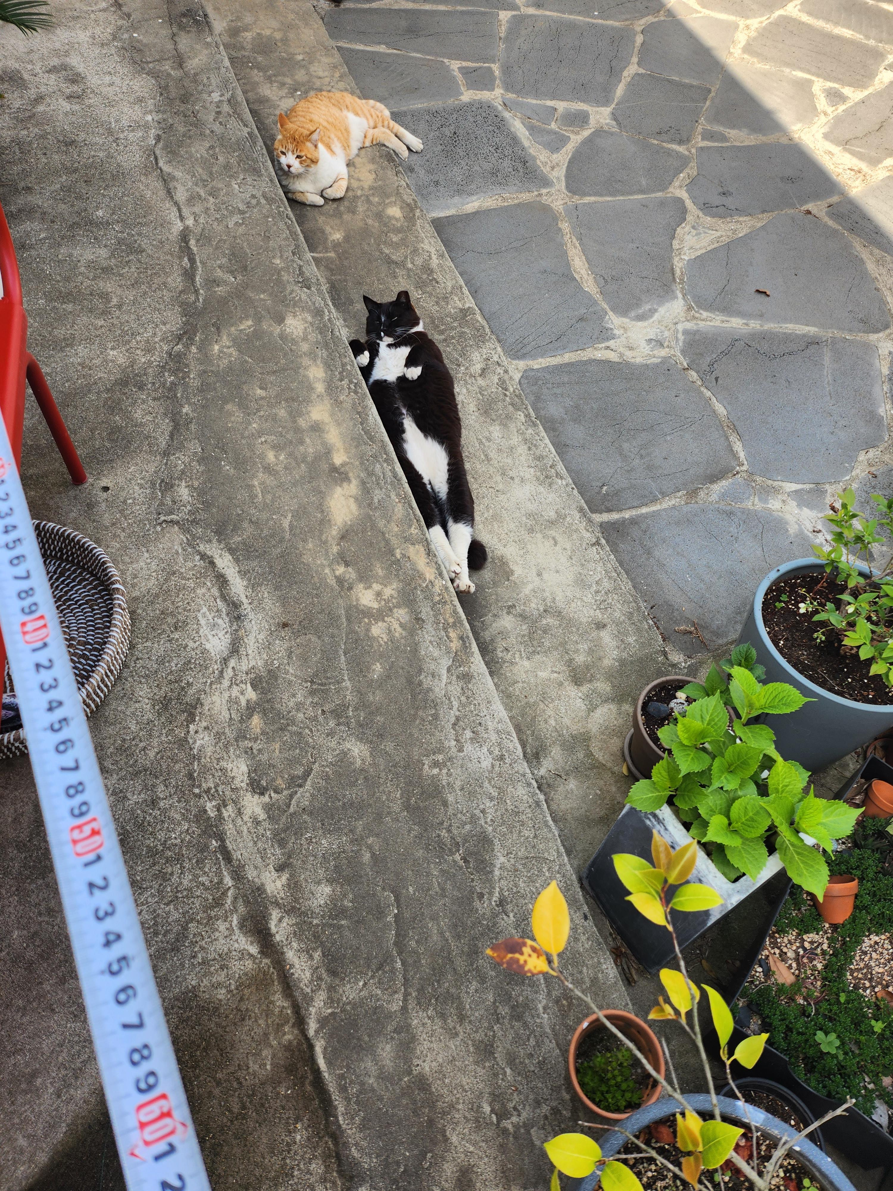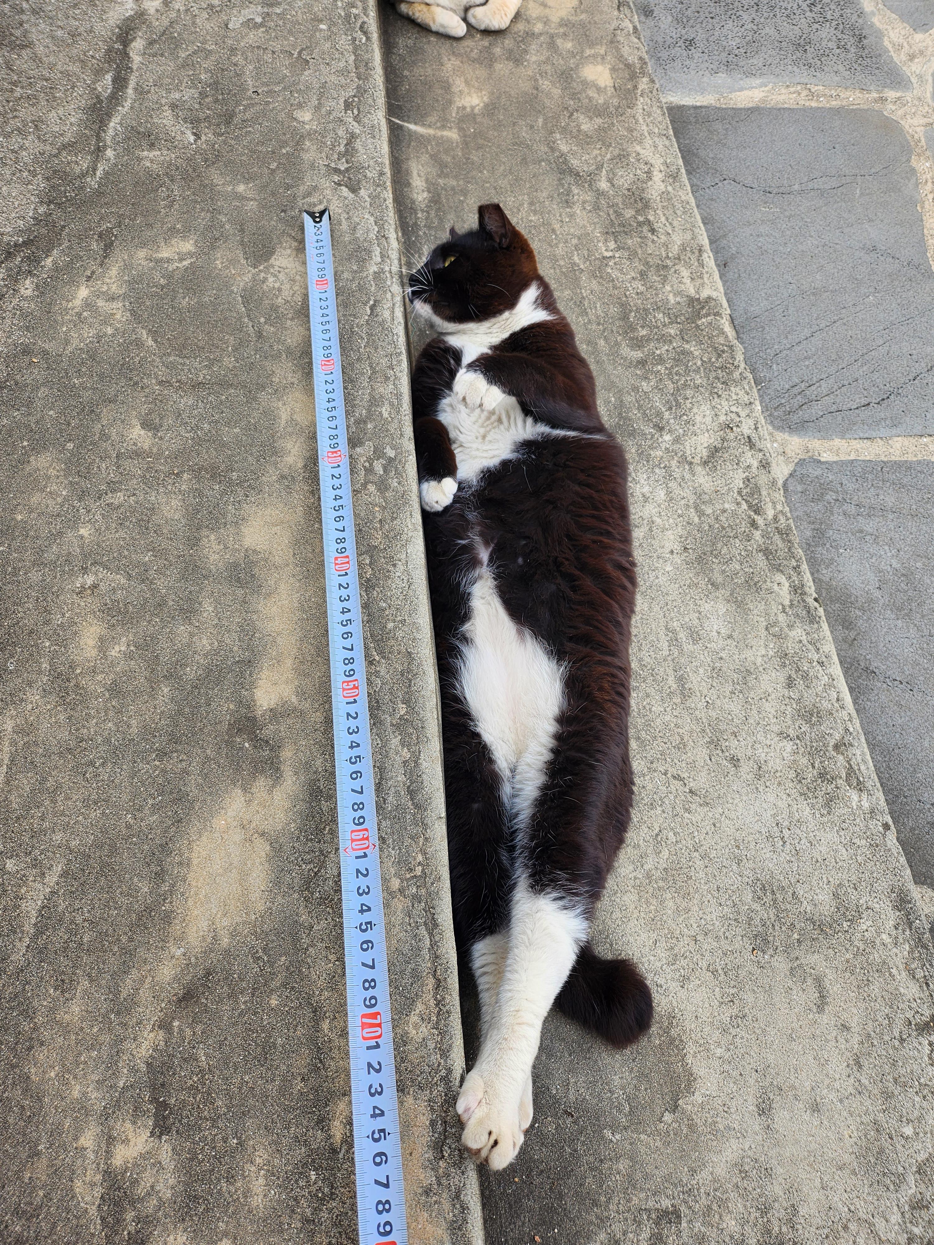 벌써 5살이나 되었으니 얼마나 자랐는지 좀 볼까? 마침 다리도 쭉 펴고 있길래 키를 재보기로 했다. 카페 고양이인 채영이에게는 종종하는 것인데 마당 고양이들에게는 처음 시도해보는 것이다.