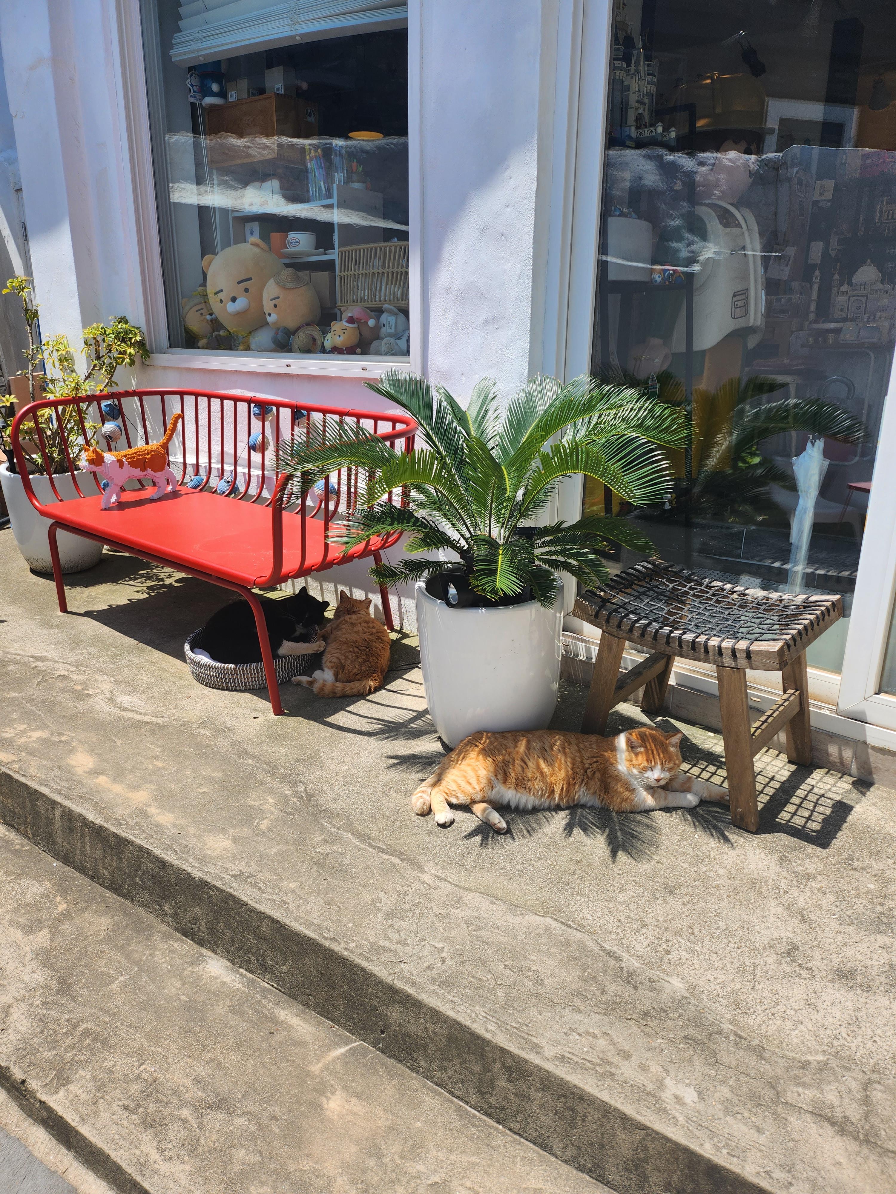 파란 대문을 지나 안으로 들어가면 귀여운 고양이들이 반겨준다. 편안한 모습으로 누워있는게 손님을 한두번 맞이해본 솜씨가 아니다.