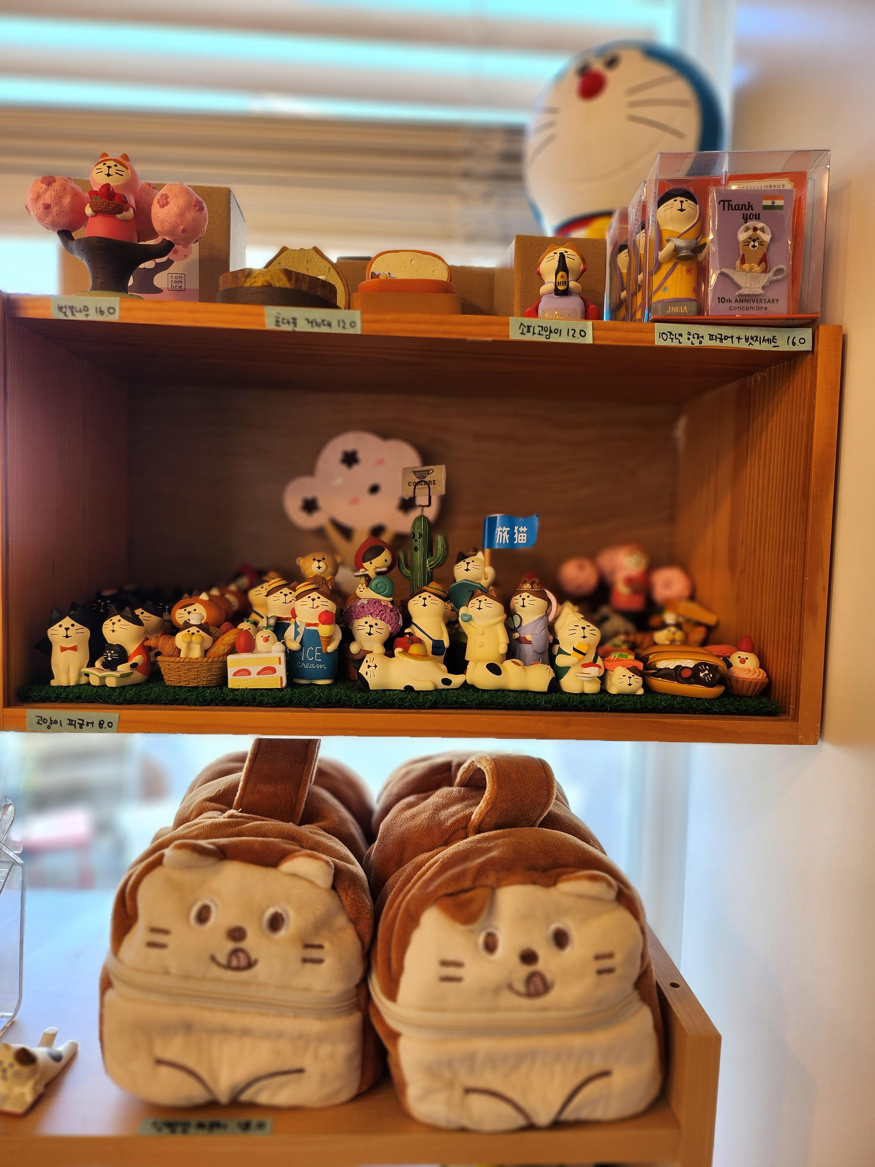 귀여운 고양이 캐릭터의 피규어와 가방, 파우치 등을 판매하고 있다.