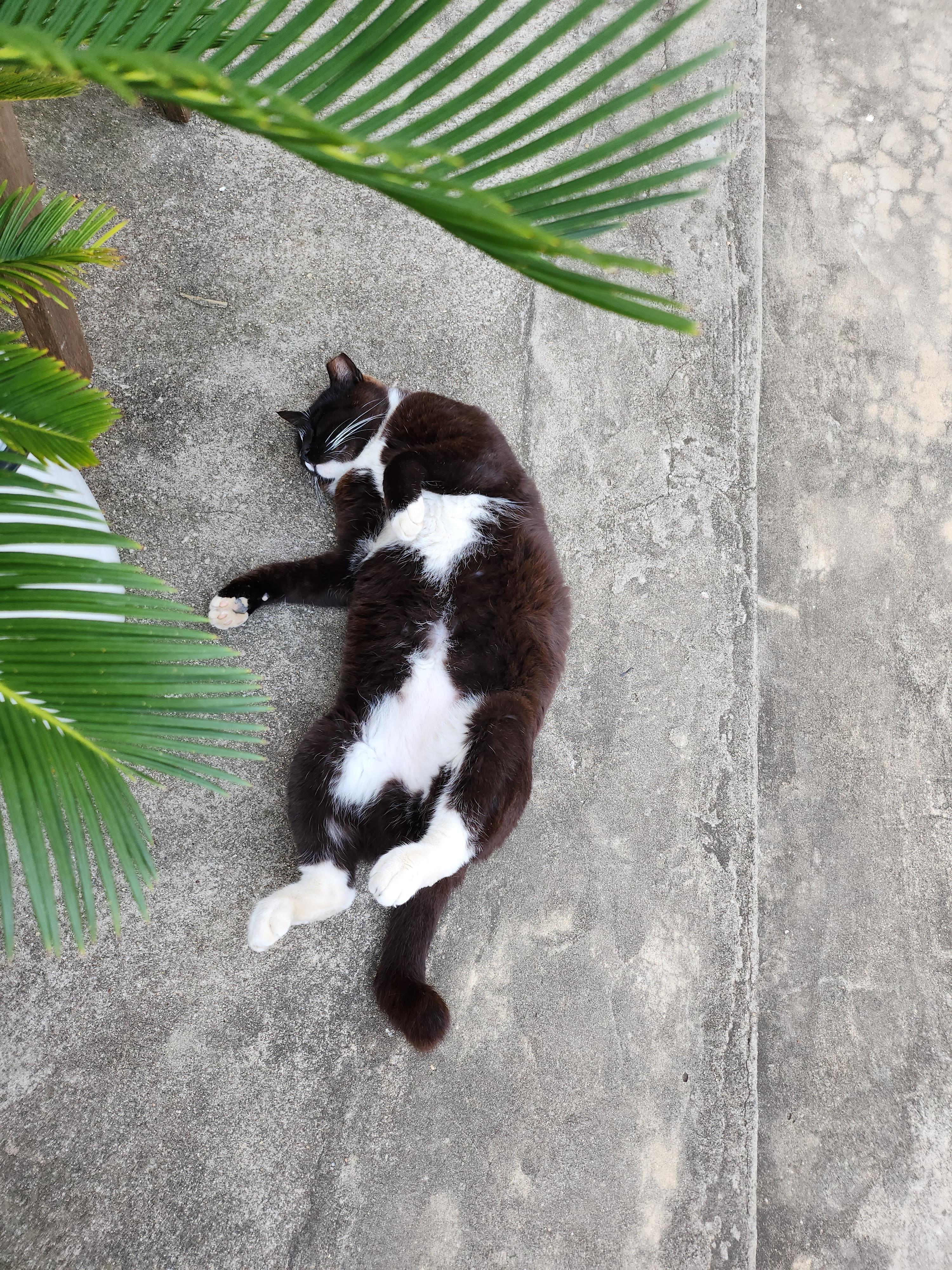 브릭스제주 카페 마당에서 유일하게 검은색 수트를 입고 있는 필통씨는 다른 고양이들보다 조금 더 더울 것 같다. 검은색이 햇볕을 더 많이 흡수하기 때문인데, 그래서인지 필통씨는 검은 부분이 많은 등은 바닥에 대고, 배를 위로 보이며 누워있을때가 많다.