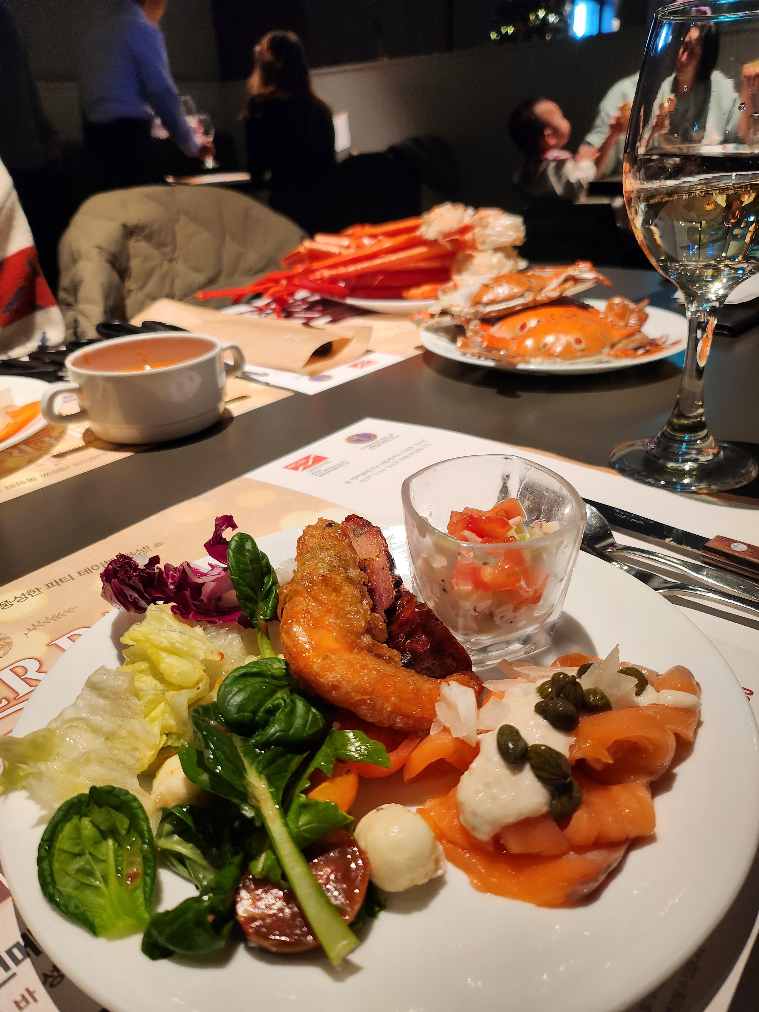 물론 저희 일행중에도 갑각류 킬러가 있어서 대게를 한접시 가져왔더라고요. 저는 첫접시로 새러드와 새우튀김, 치즈볼 샐러드와 훈제연어를 가져왔어요. 제주도는 야채가 비싸서.. 언젠가부터 제가 신선한 야채에 집착을 하게 되었더라고요. 그래서 신선한 야채를 먹을 기회가 있으면 꼭 챙겨먹는 편이예요.