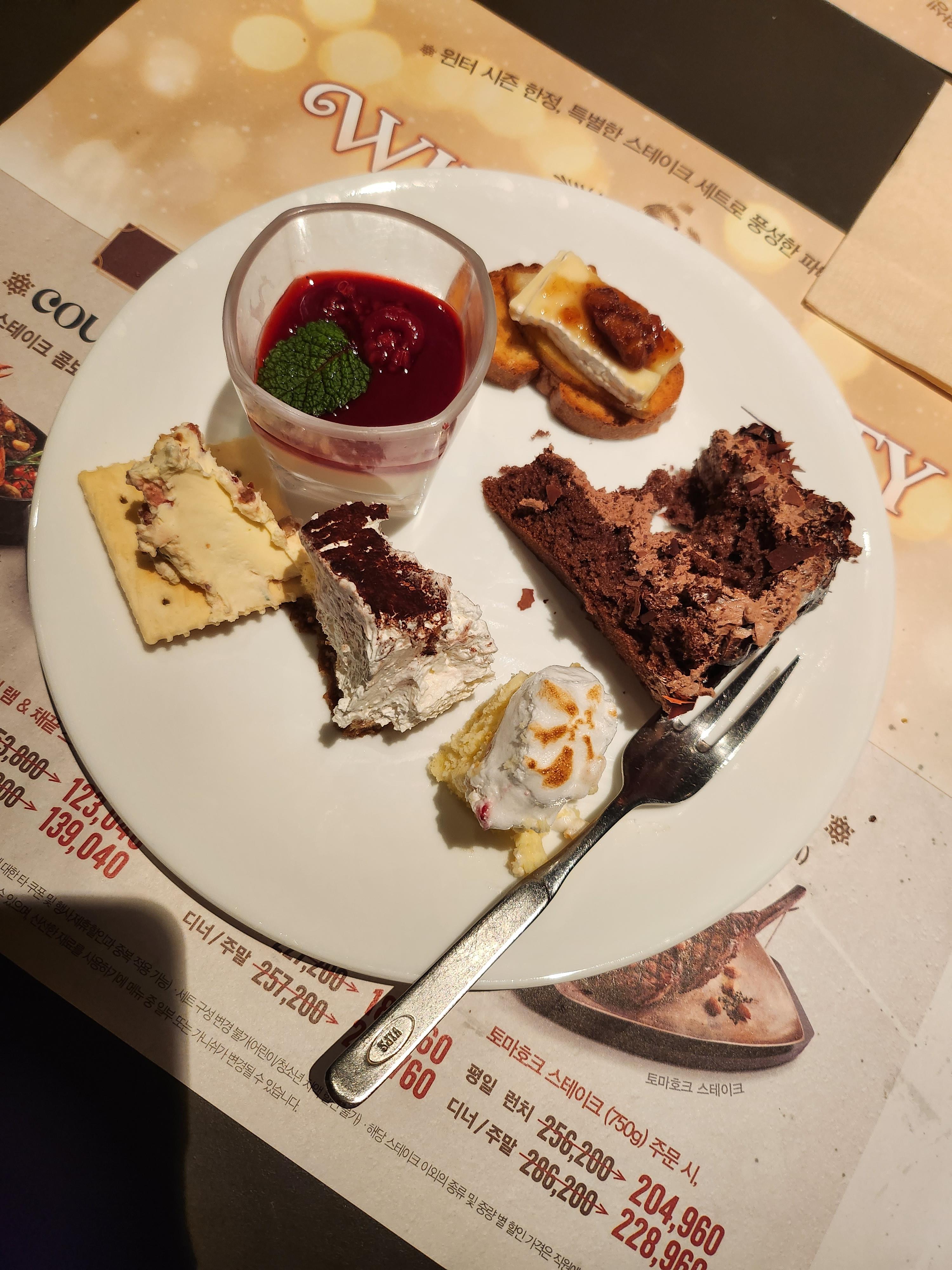 라즈베리 판나코타와 레몬머랭 케이크,초코케이크와 티라미스를 먹었어요. 배가 너무 불렀지만 맛이 궁금해서 조금씩 가져와서 맛보았는데, 초코케이크가 너무 맛있어서 깜짝 놀랐지요!