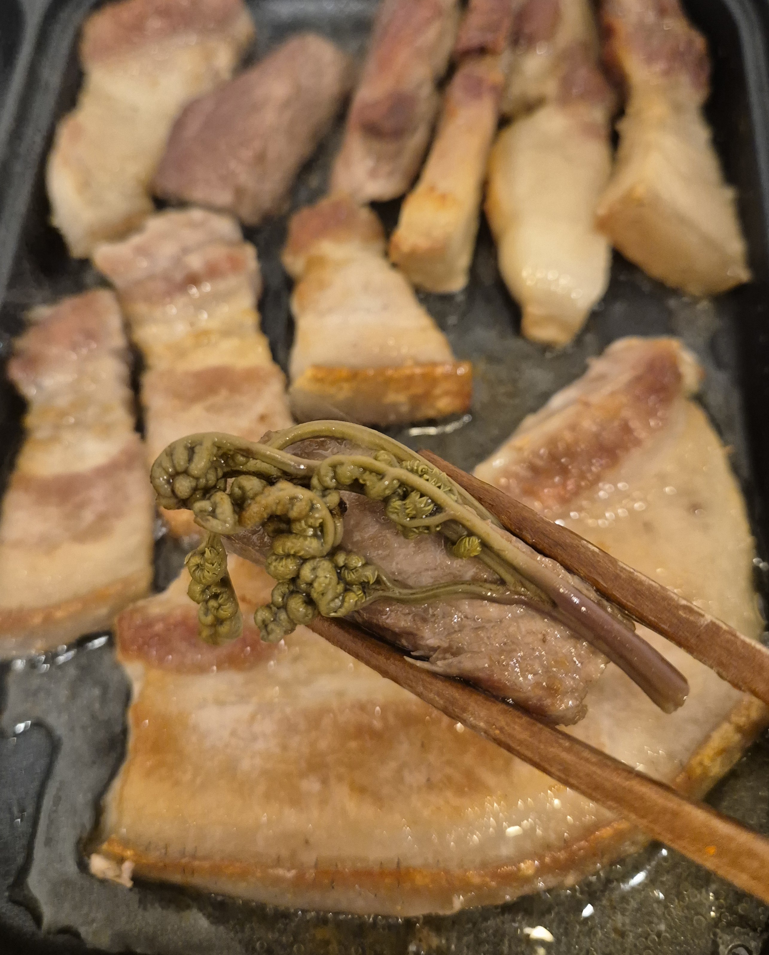 이렇게 좋은고기가 있으니, 아껴왔던 고사리 짱아찌를 꺼내어 곁들어봅니다. 하지만 고기 본연의 맛을 느끼시려면 소금이라는 거 꼭 알아두세요!