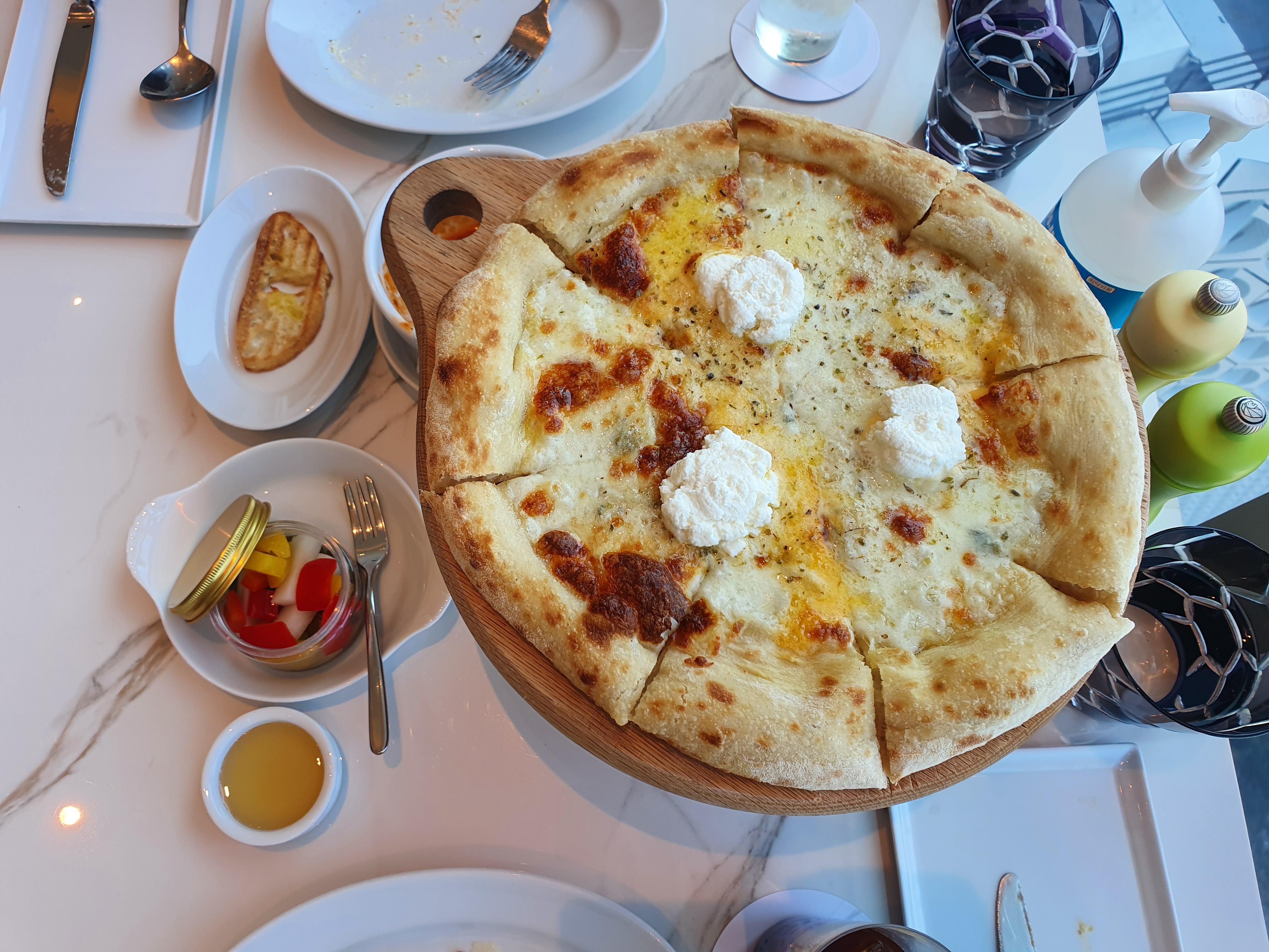 메인 메뉴 중 먼저 나온 것은 모둠 치즈 피자였다. 이 세팅이 참 뭐라고 말하기가 어려운데, 높이 약 12cm정도 되는 둥근 토마토 캔을 놓고 그 위에 피자를 올려준다. 음.. 고체 연료를 아래 놓고 식지 않게 데워주는건 봤어도 이 세팅은 뭐랄까.. 굳이? 라는 생각이 드는 플레이팅이었다. 하하..