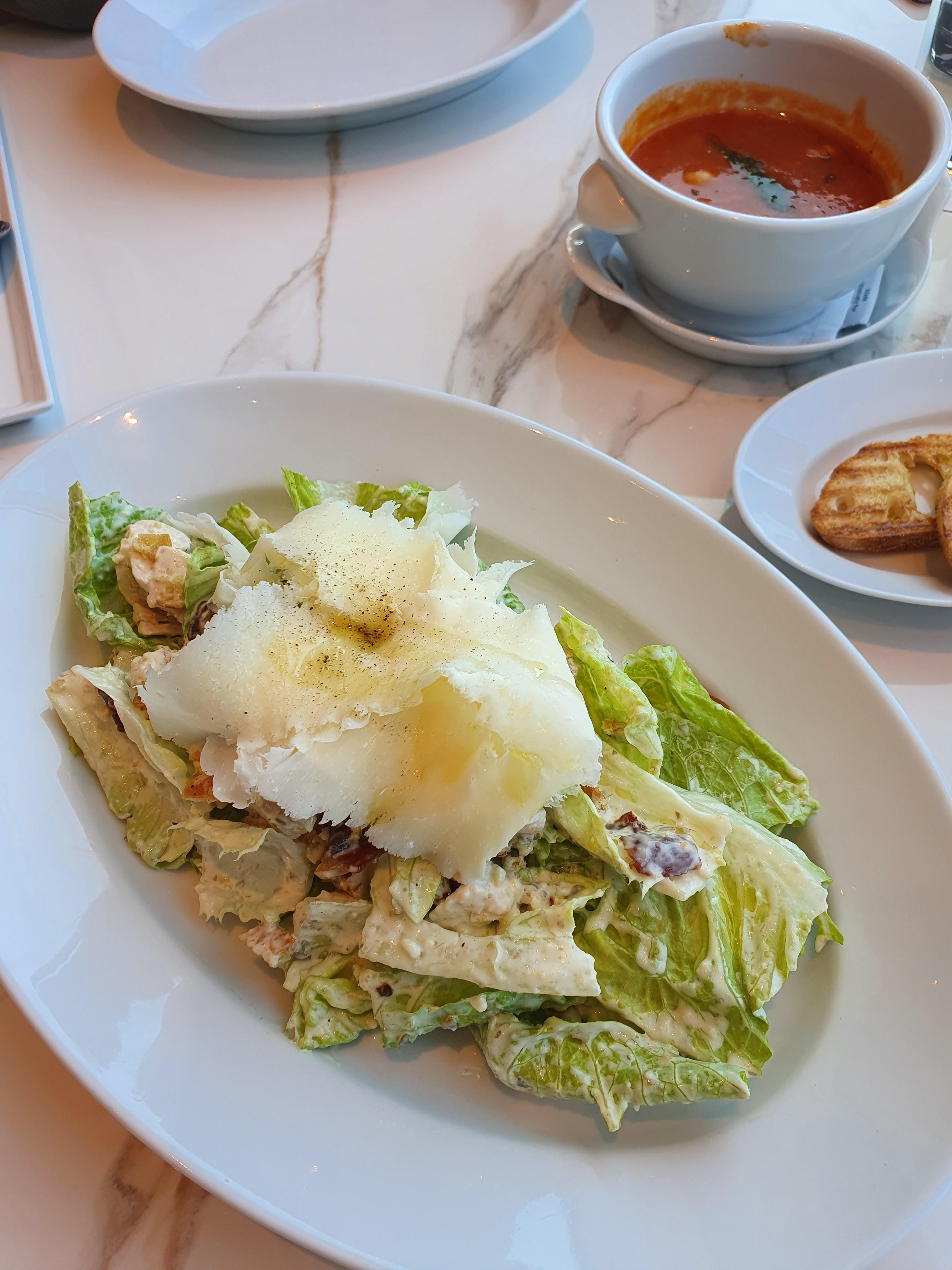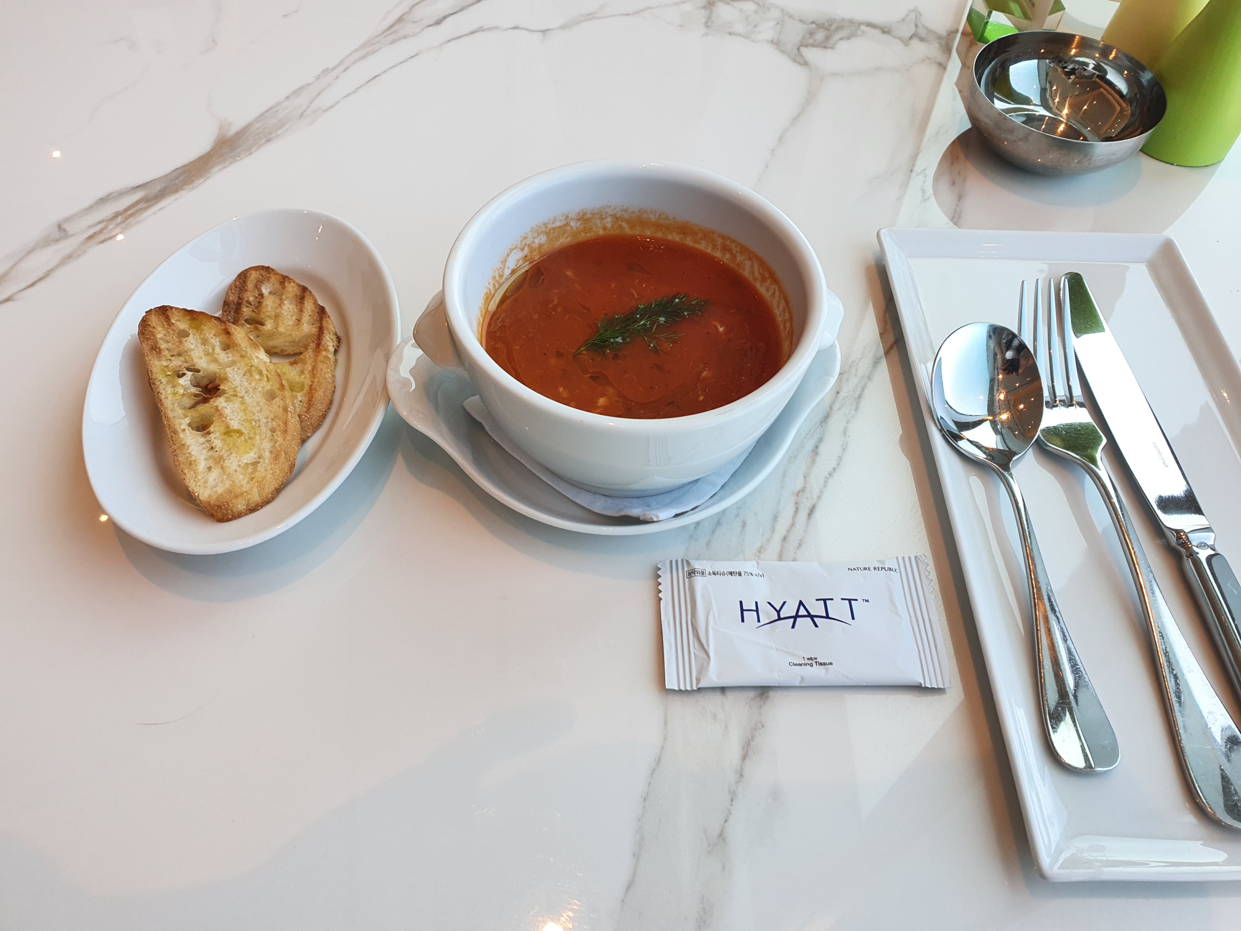 토마토스프와 식전빵이 먼저 나왔고 이날 식사 중에 가장 맛있었던 걸로 기억한다. 스프가 간단한 음식처럼 보여도 맛을 내기가 어려운 음식인데 식전에 속을 달래주는 자극적이지 않고 깔끔한 맛이었다. 따뜻하게 데워진 그릇에 담겨 나온것도 좋았다.