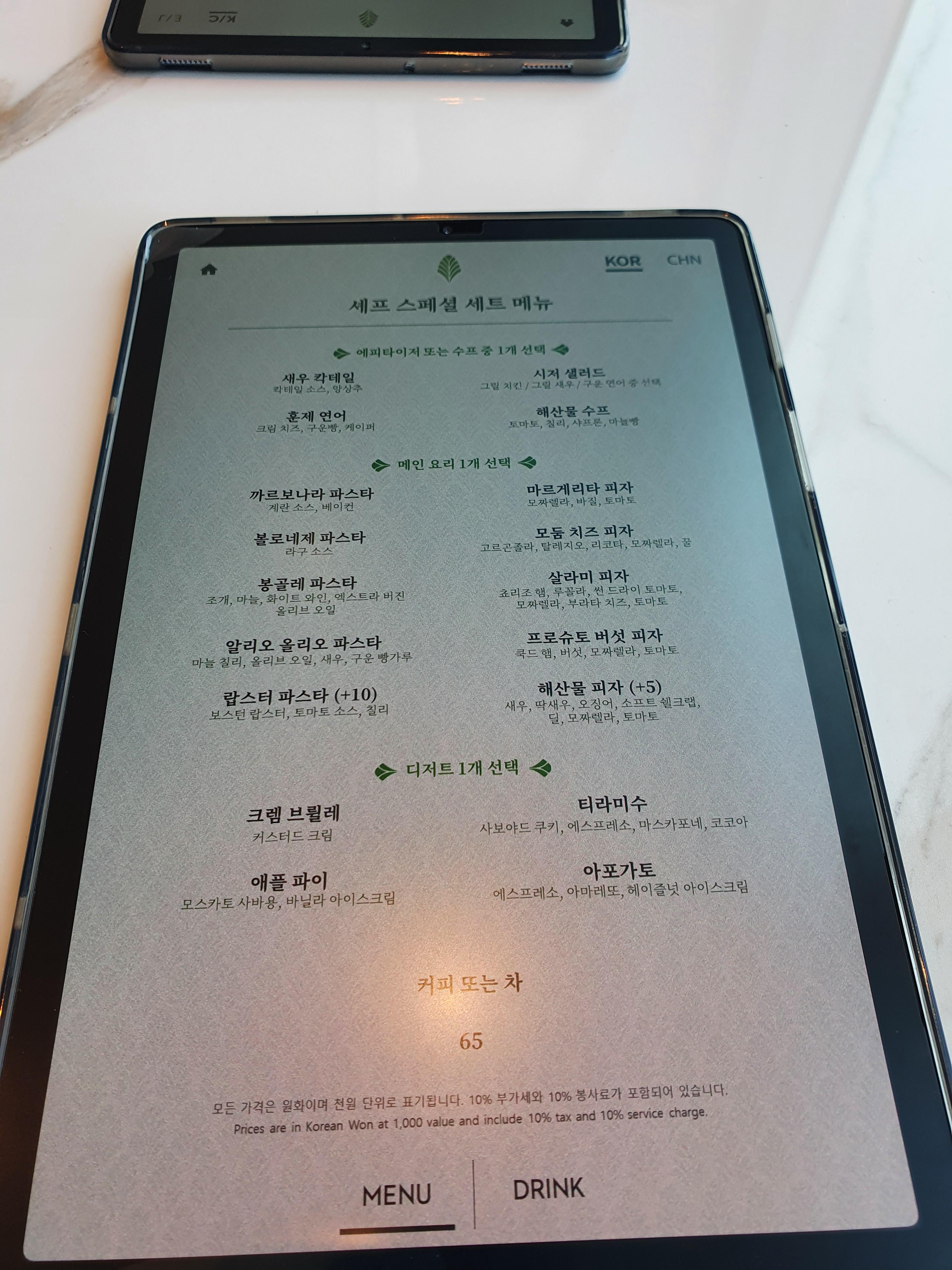 메뉴는 태블릿으로 볼 수 있고, 셰프 스페셜 세트 메뉴를 주문하면 에피타이저와 메인메뉴 디저트까지 조금 할인된 가격으로 즐길 수 있다. 우리는 세트 메뉴로 주문을 했다.