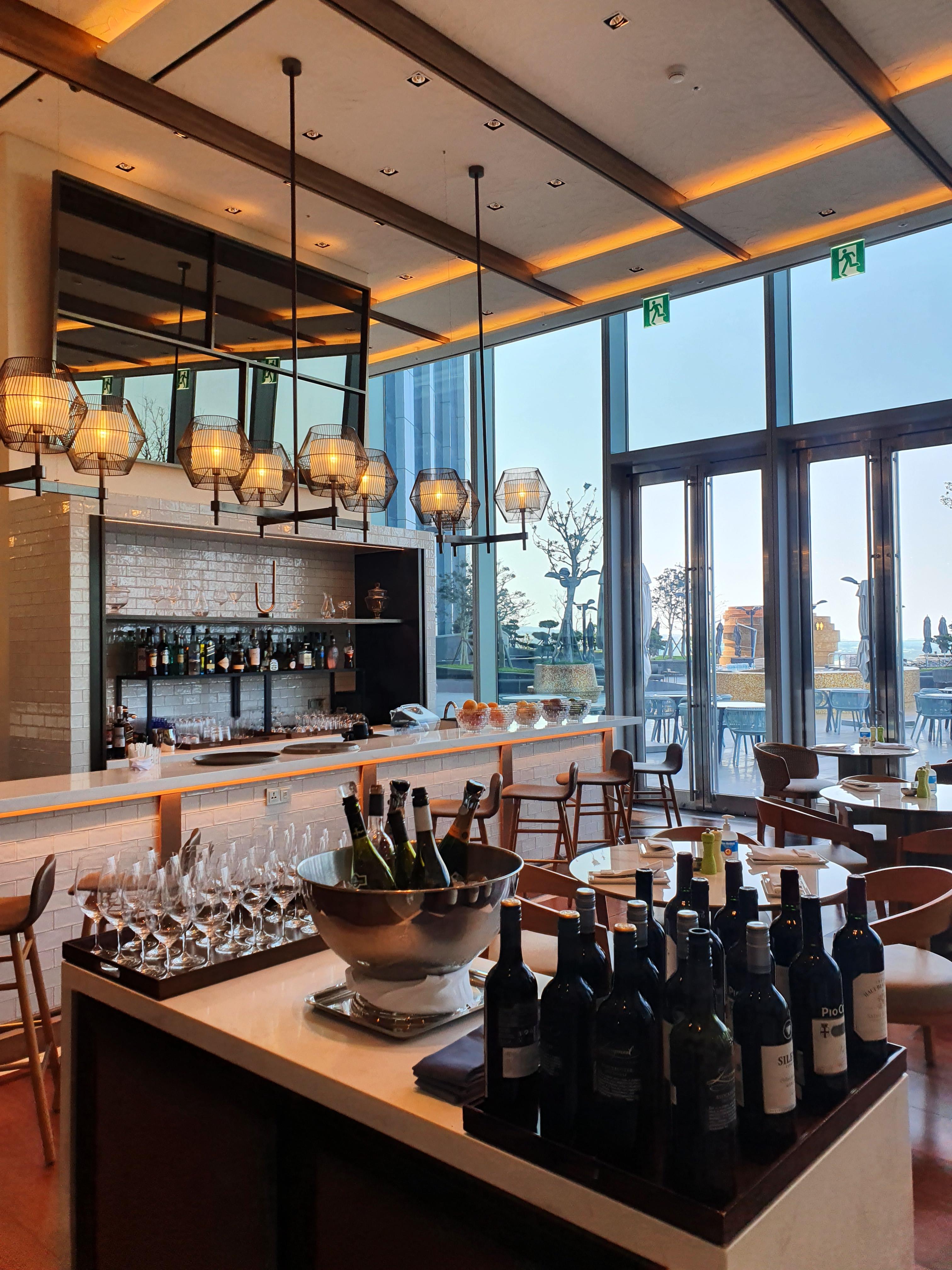 다양한 종류의 와인과 바 옆쪽으로 보이는 그랜드 햐앗트 제주 호텔 야외 수영장의 모습이다. 바 키친의 타일이나 조명, 다양한 와인까지 그랜드키친과는 인테리어 분위기가 많이 달라보였다. 하지만 또 다른 지역의 하얏트 호텔과 비교해보자면 인테리어의 퀄리티가 그렇게 높다고 볼수는 없을 것 같다.
