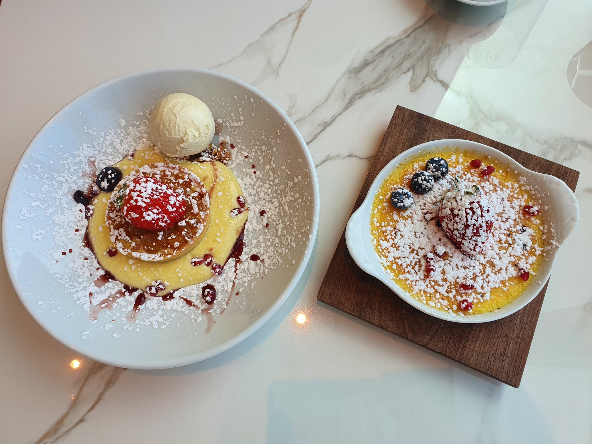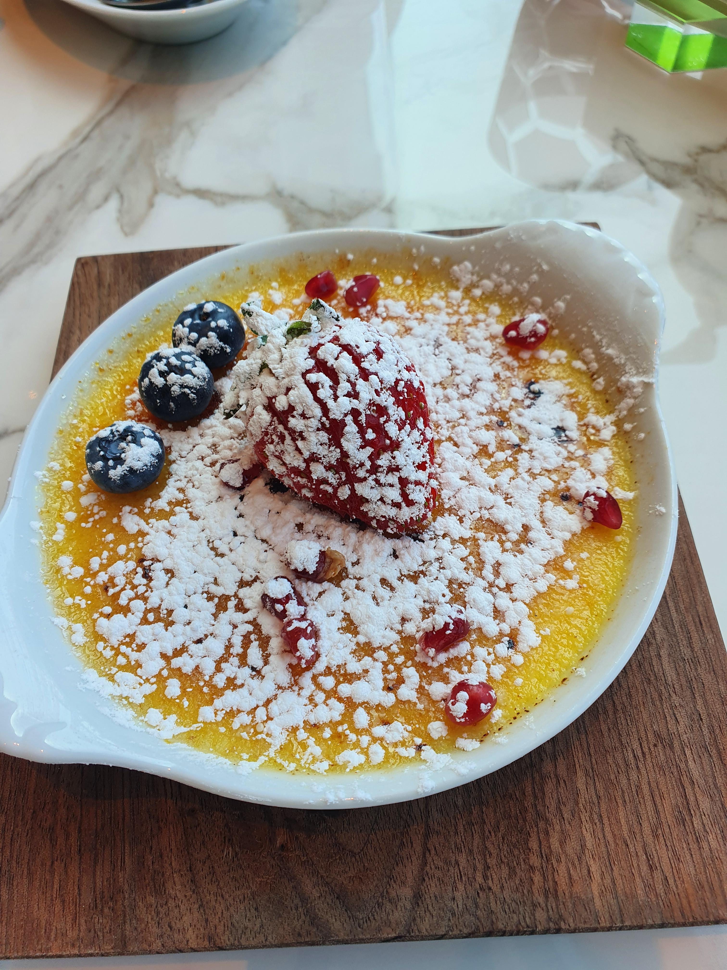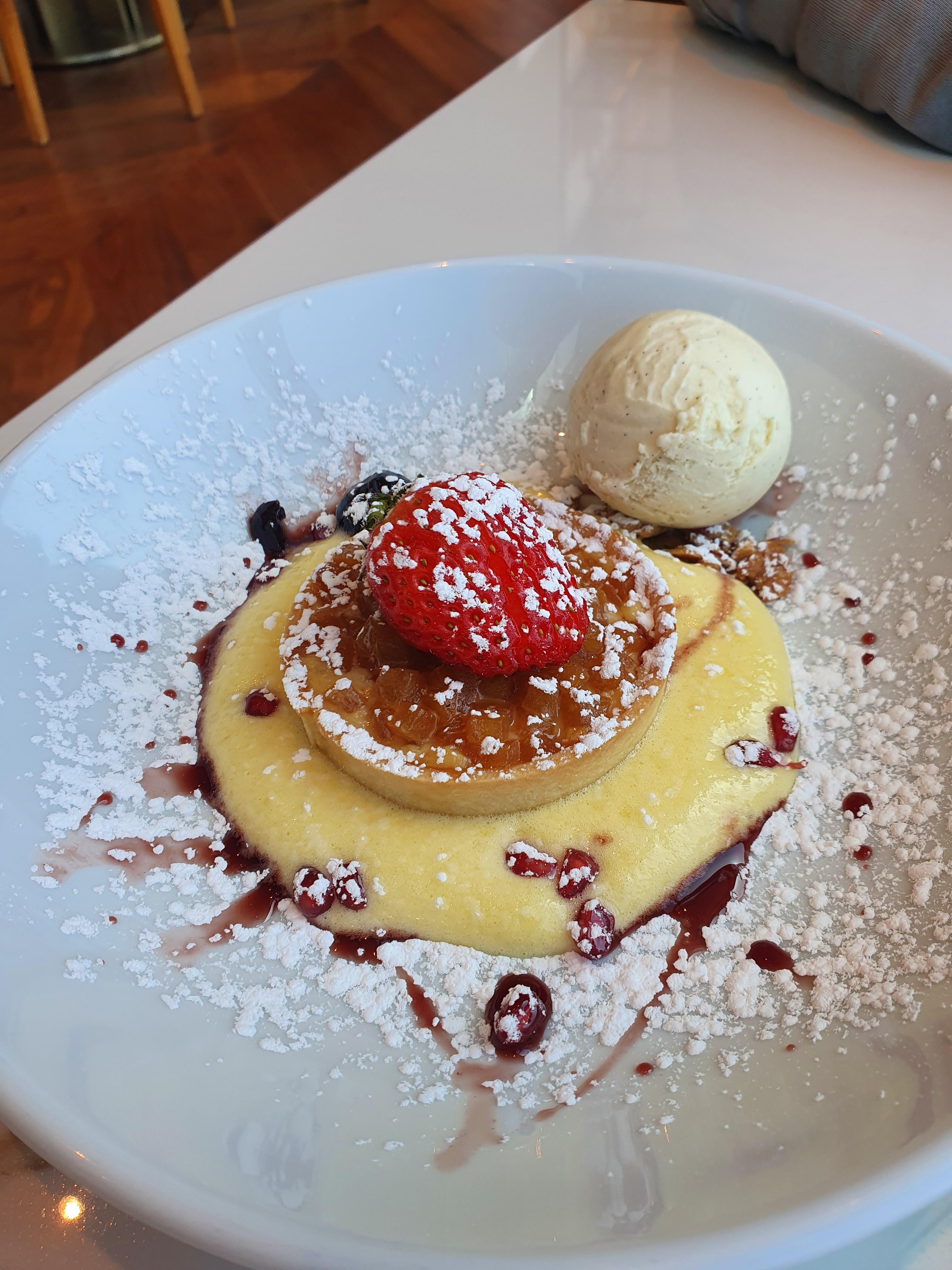 디저트는 애플파이와 크림브륄레. 이 디저트가 서빙되는 순간 일행이랑 눈이 마주치고 웃음을 참지 못하고 터져버렸는데.. 슈가파우더가 마치 스푼으로 떠서 올린 것처럼 나와서 너무 당황해버렸다. 보통은 체에 걸러 내리기때문에 굉장히 곱게 뿌려져나오는데 사진은 마치 스푼.. 그것이 틀림없어 보였다.