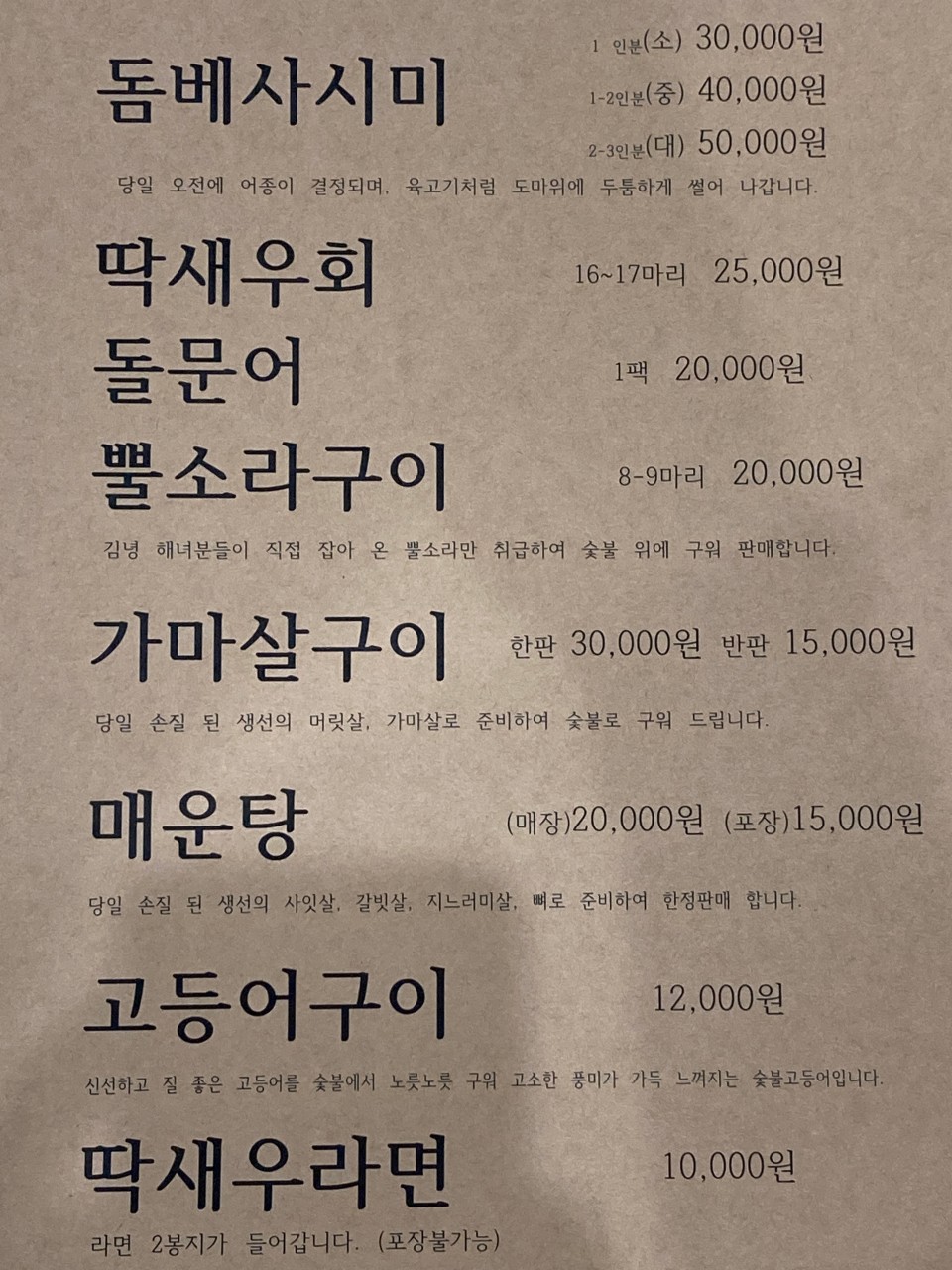 대표적인 메뉴는 돔베 사시미인데, 그날 오전에 어종이 결정되며 두툼하게 썰어 도마(돔베)에 올려 서빙된다.