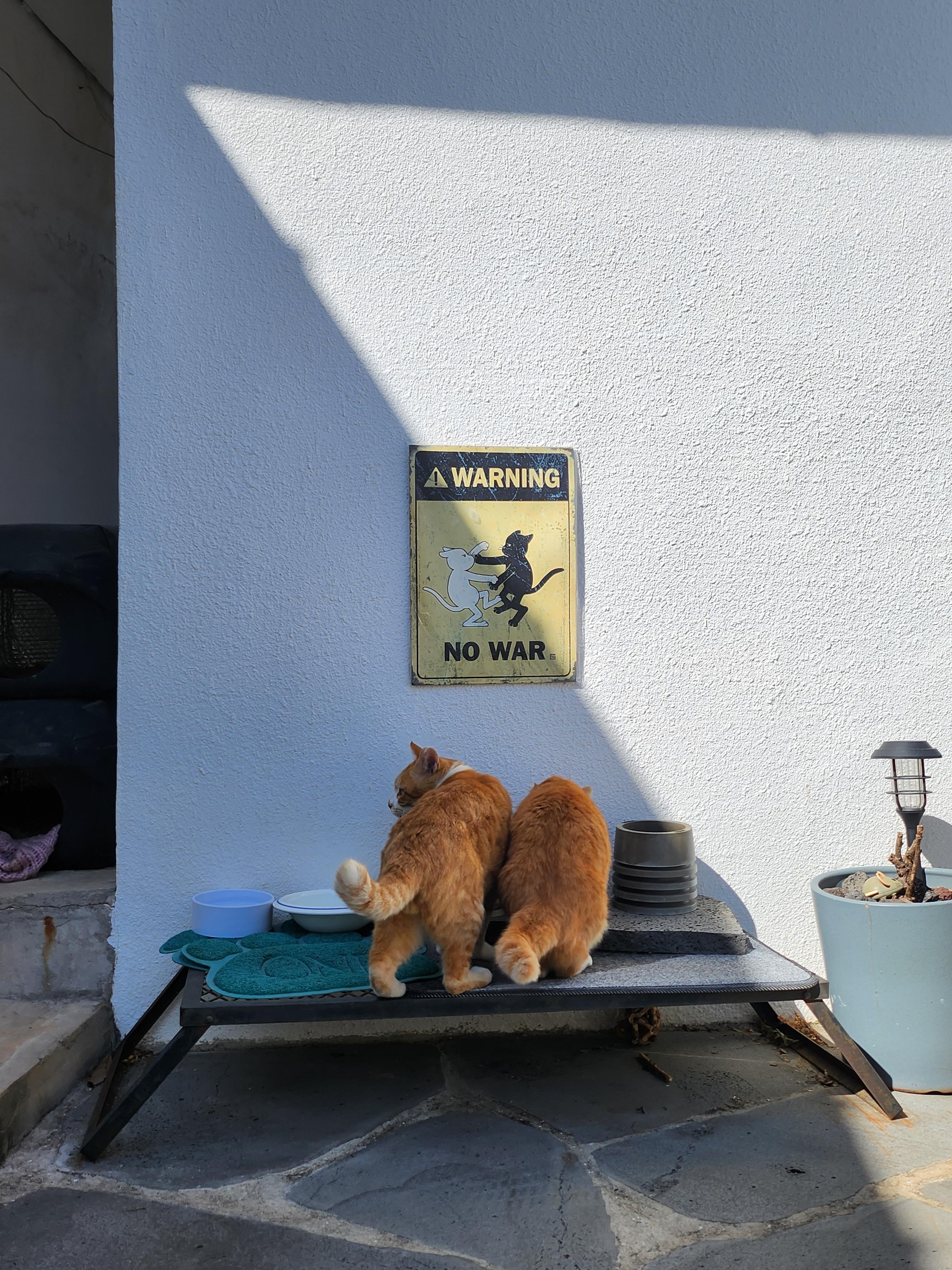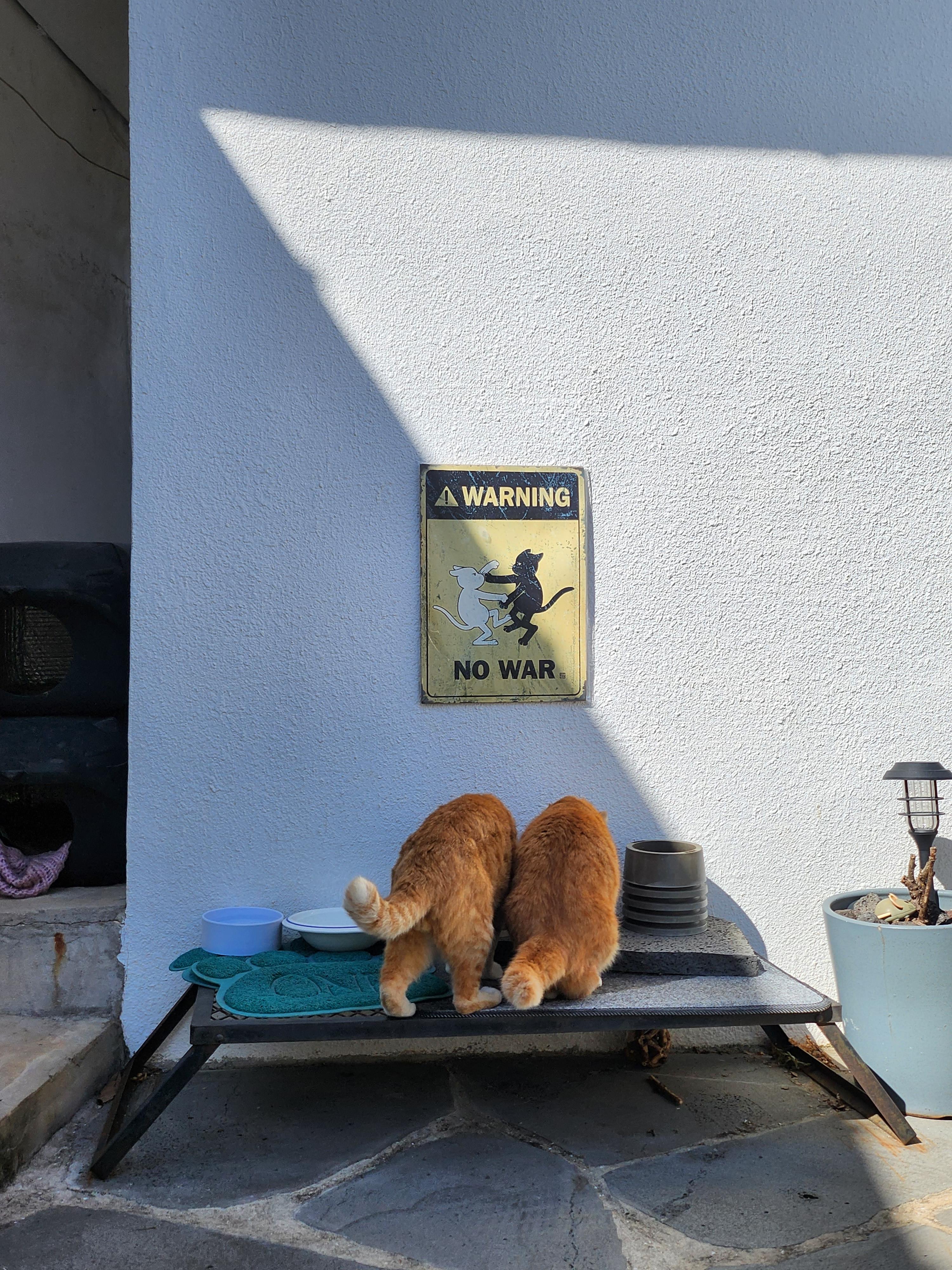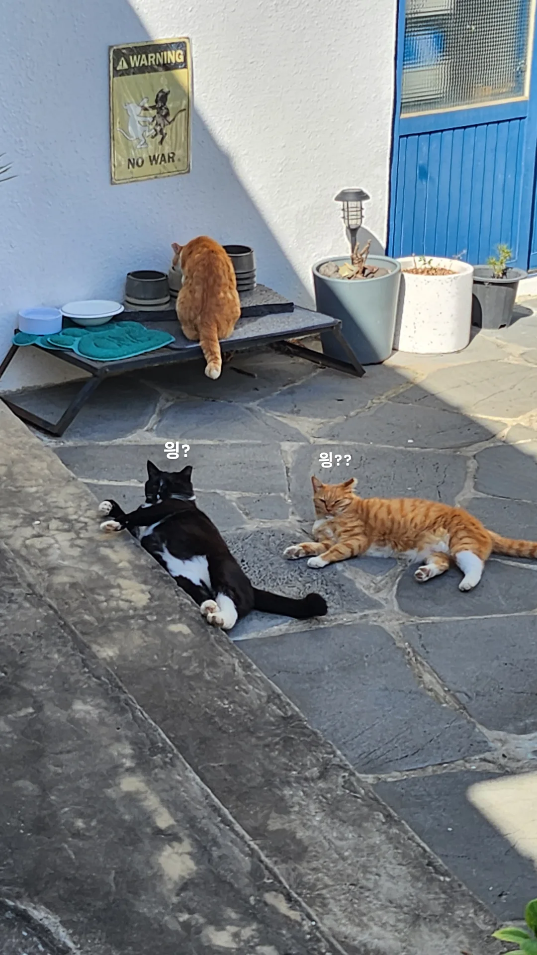 노란 옷 입은 고양이들끼리 식사하는 중. 털이 복슬복슬하게 쪄서 같이 밥 먹는 뒷모습이 얼마나 귀여운지 모르겠다.