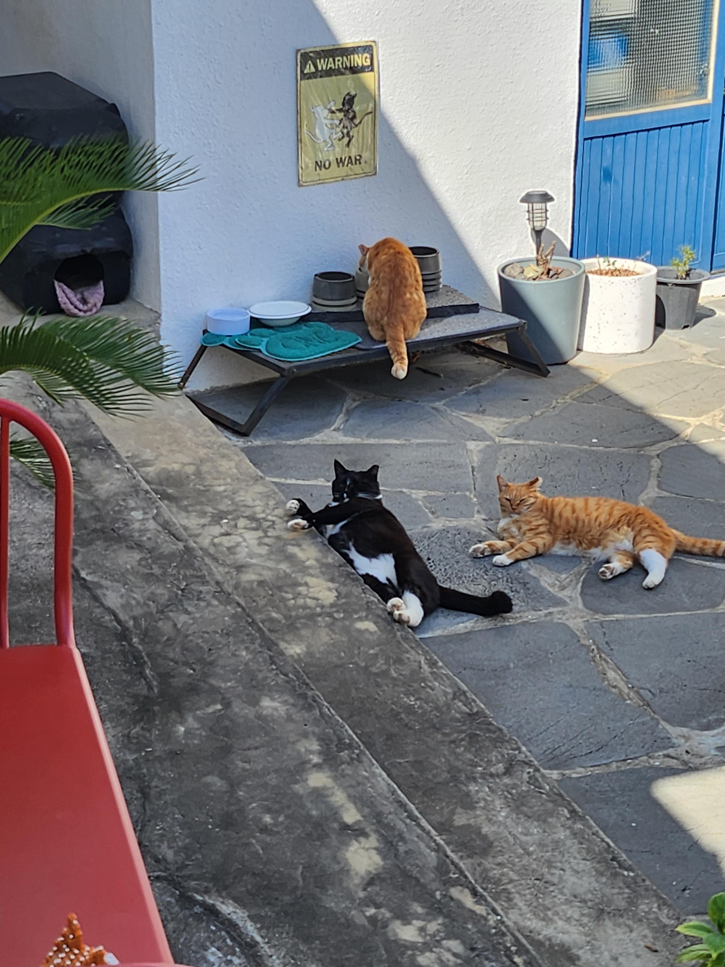 요즘 고양이들 소식이 뜸해서 오랜만에 카페 마당 고양이들의 사진을 올려본다. 더위가 조금 가시고 선선한 바람이 불어오는 덕분에 마당에 누워있는 시간이 더 많아진 마당고양이 삼총사 필통