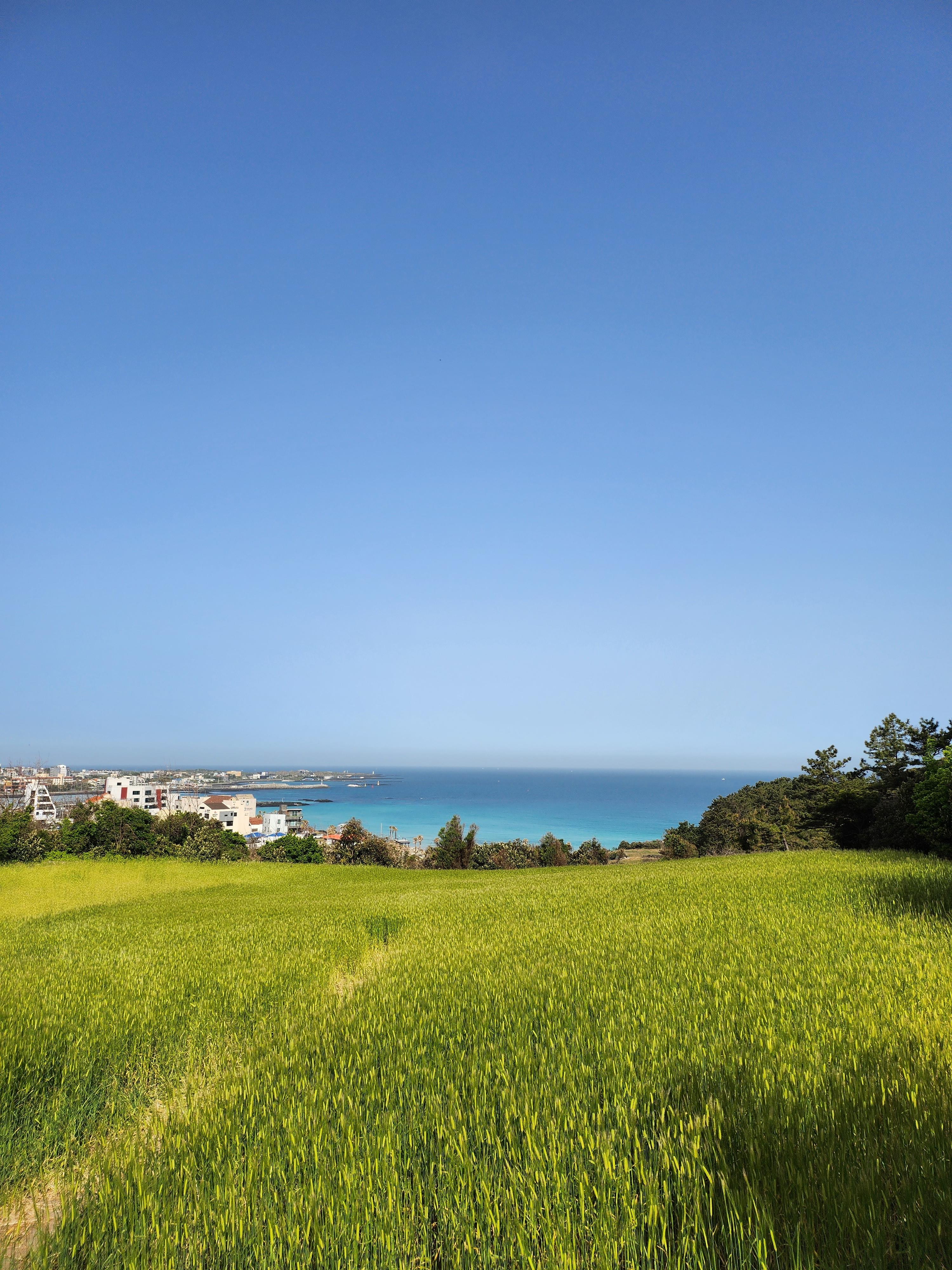 아름다운 연두색의 청보리와 멀리 넓게 펼쳐진 바다.