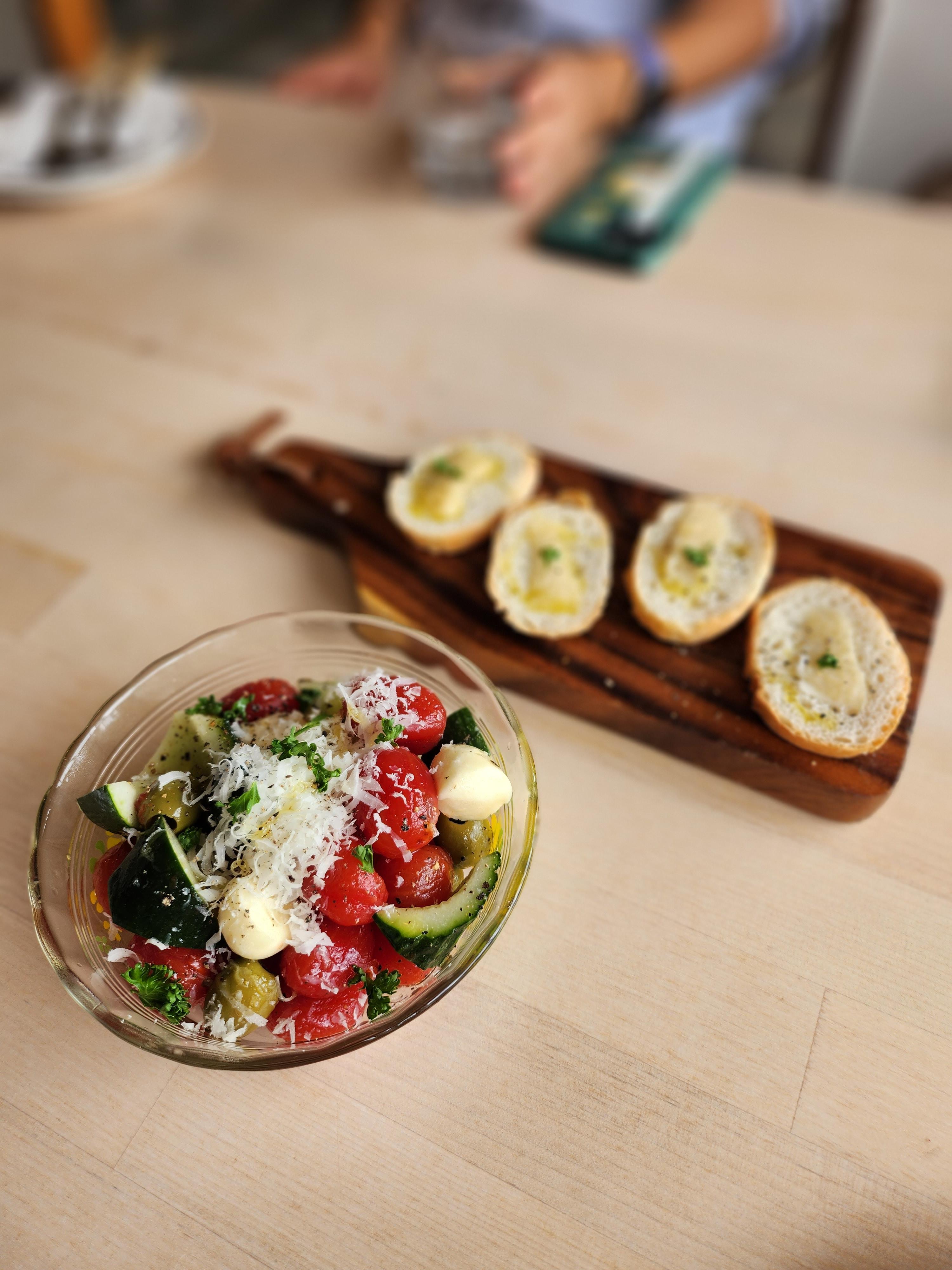 방울토마토 껍질을 일일이 벗겨 절임을 만들고, 오이도 속을 파내었다. 올리브와 보코치니 치즈를 넣고 상큼한 드레싱으로 버무려진 샐러드였는데, 한입 먹자마자 긴 기다림의 기억이 사라질만큼 상큼하고 맛있는 샐러드였다.