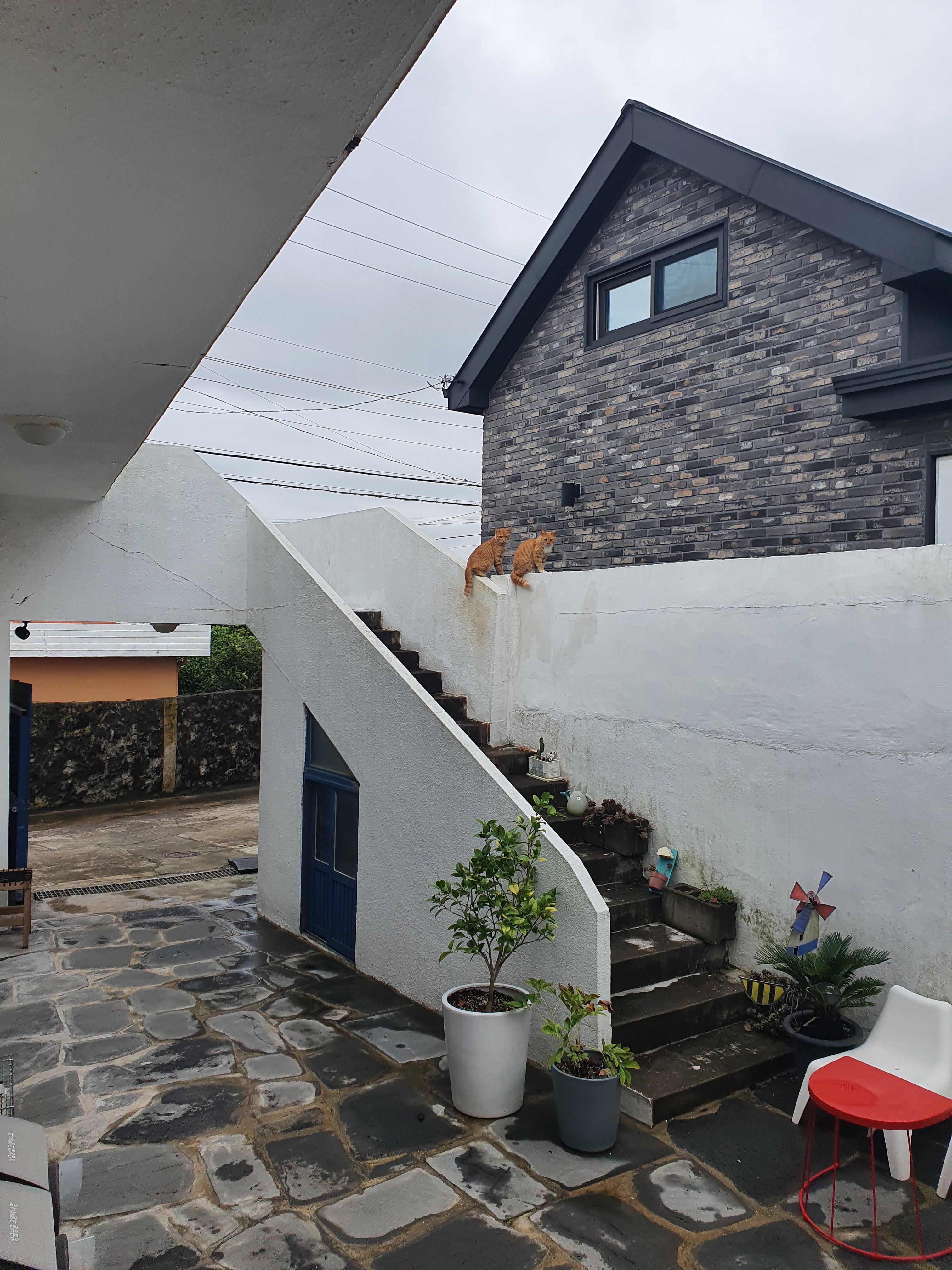 한계단 위에서 바라보는 수호신 필통씨