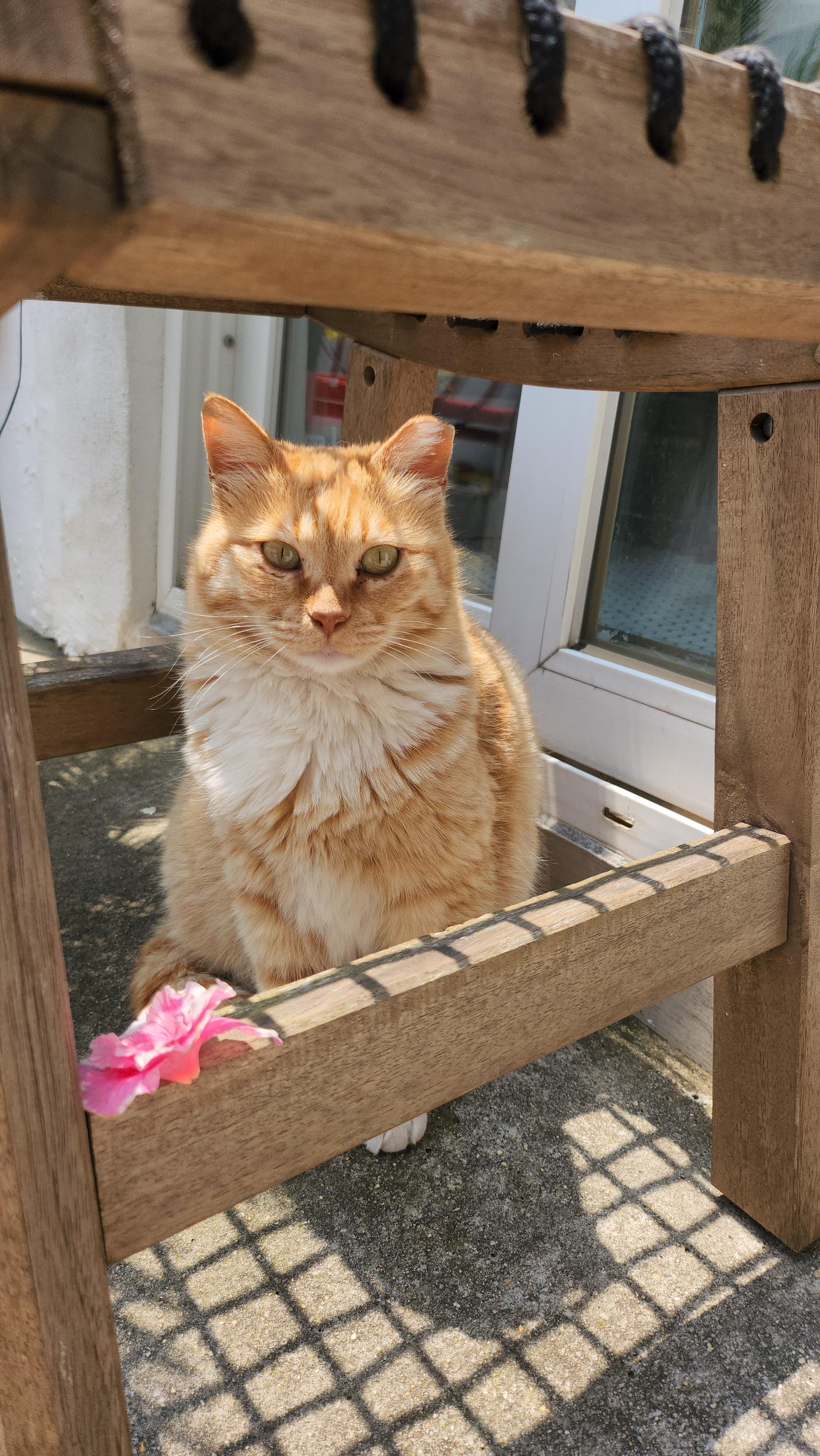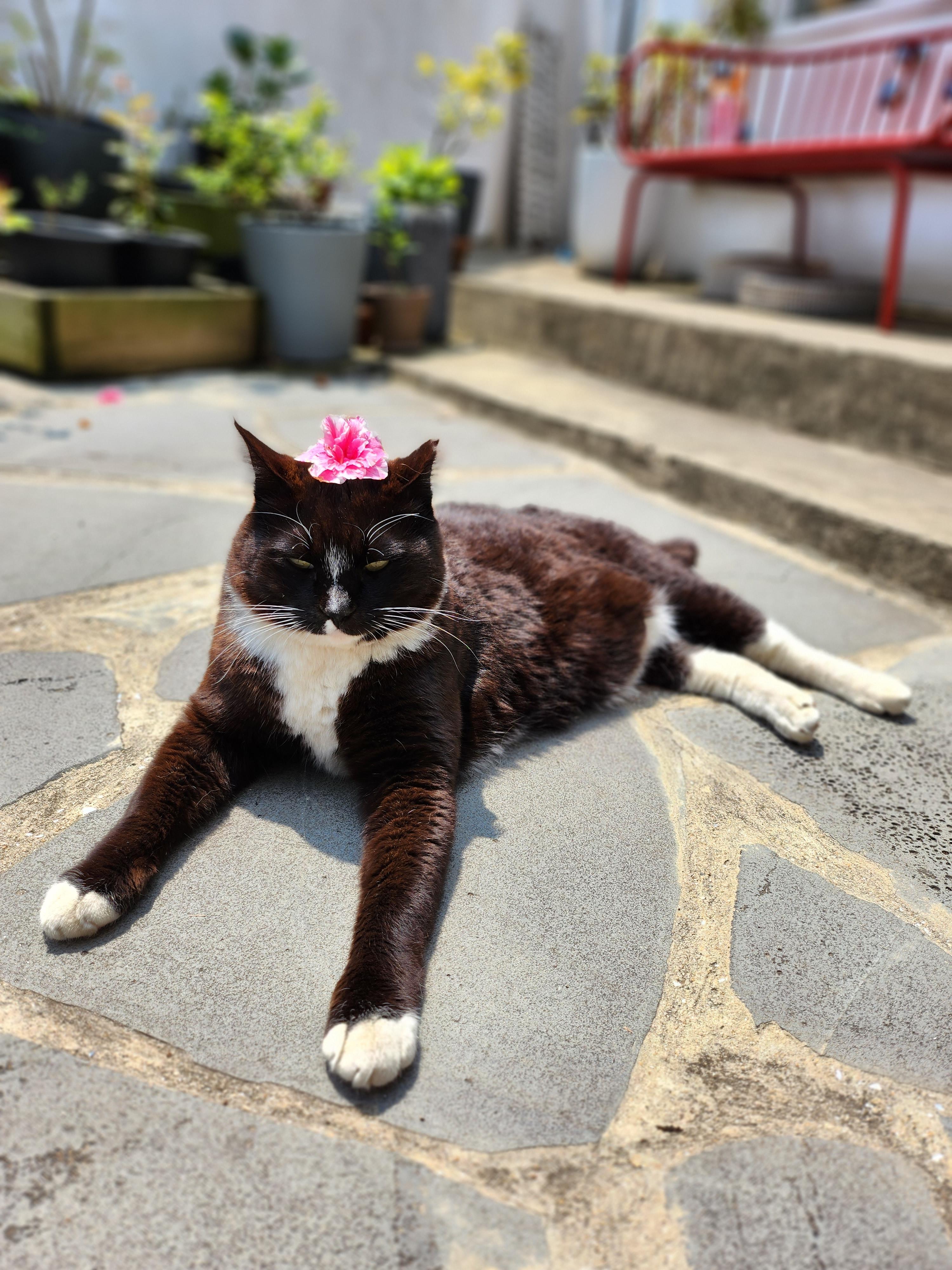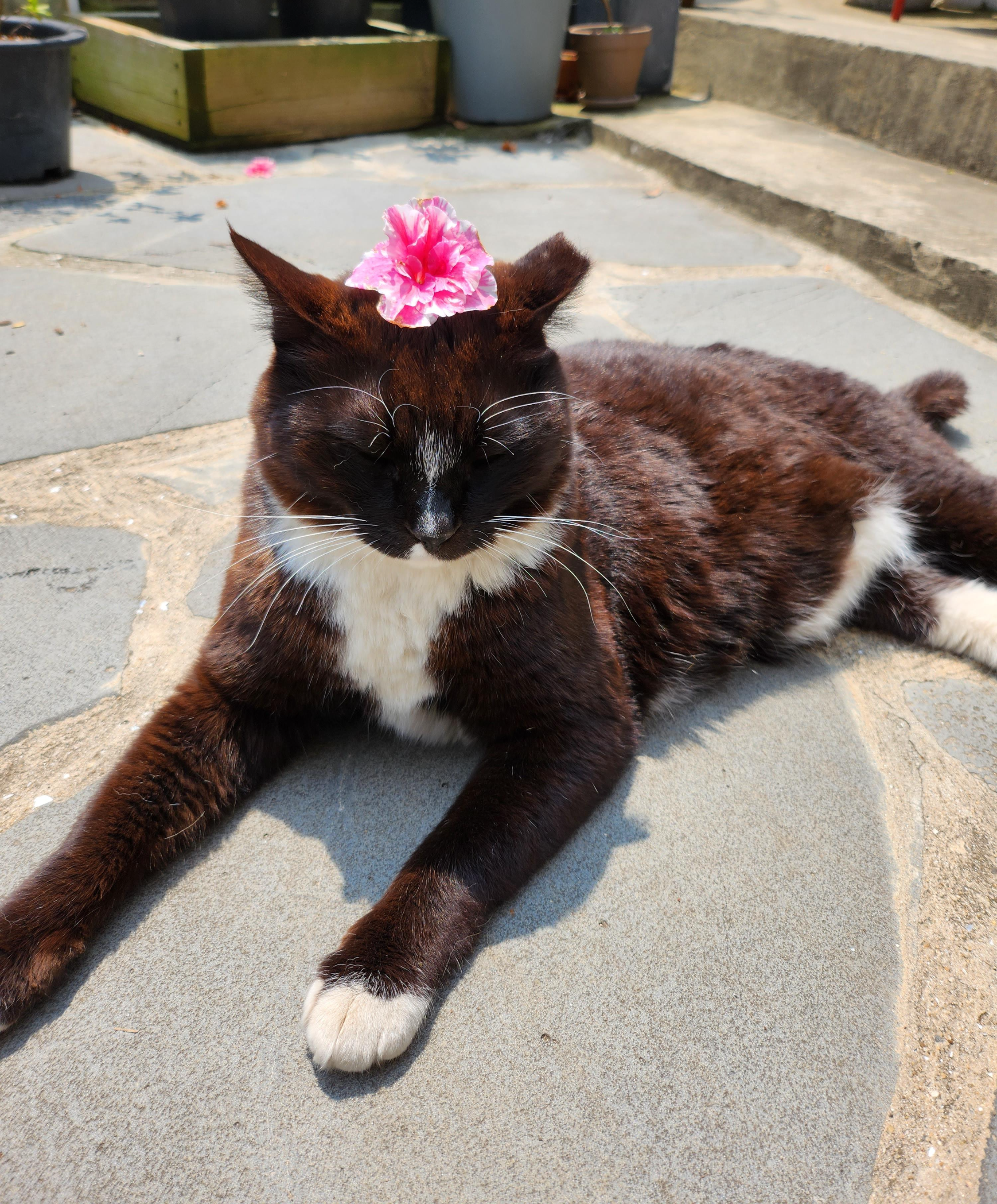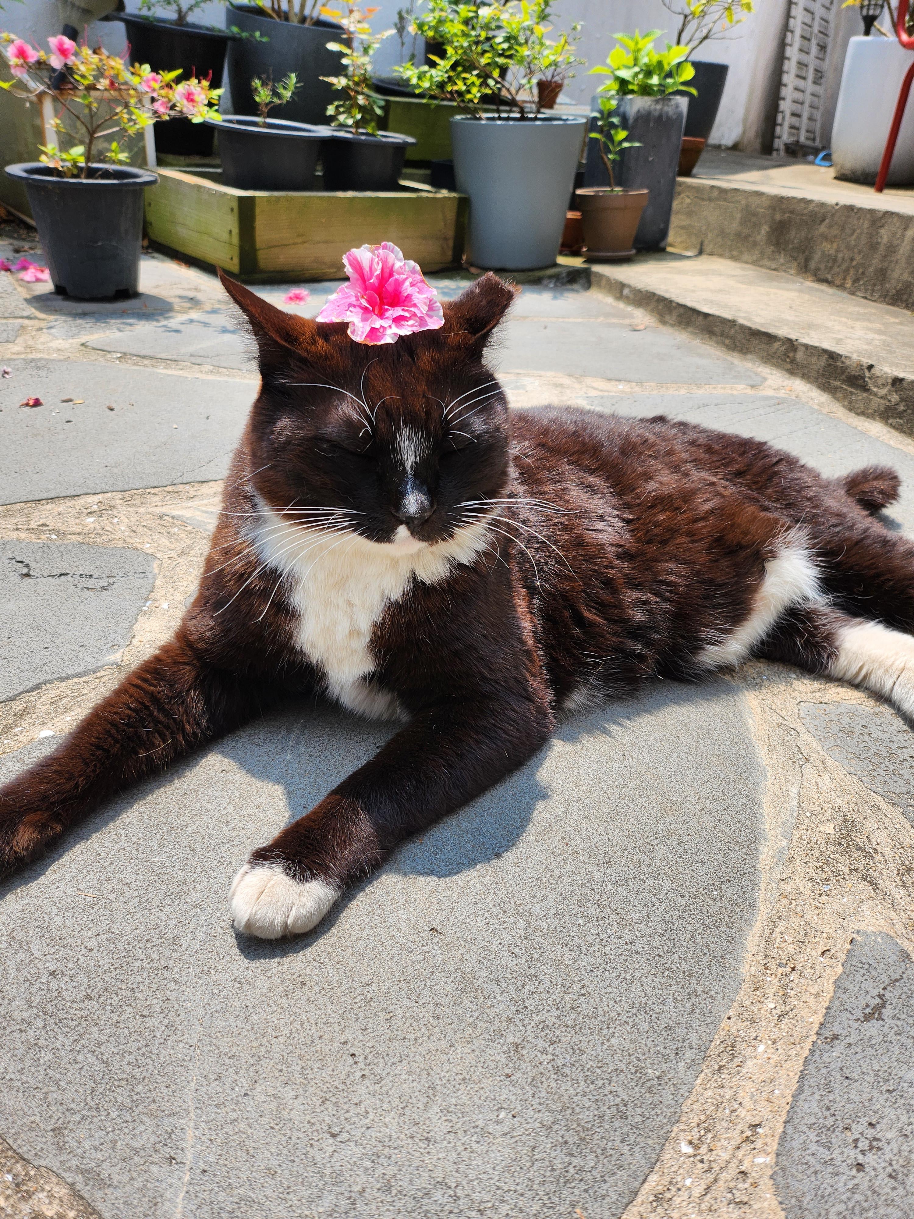 브릭스제주 카페 마당에서 6년째 밥을 먹고 있지만 아직도 경계심과 겁이 많은 탄광이는 내가 꽃을 내밀자 자고 있다가 벌떡 일어나서 경계 태새를 취한다.