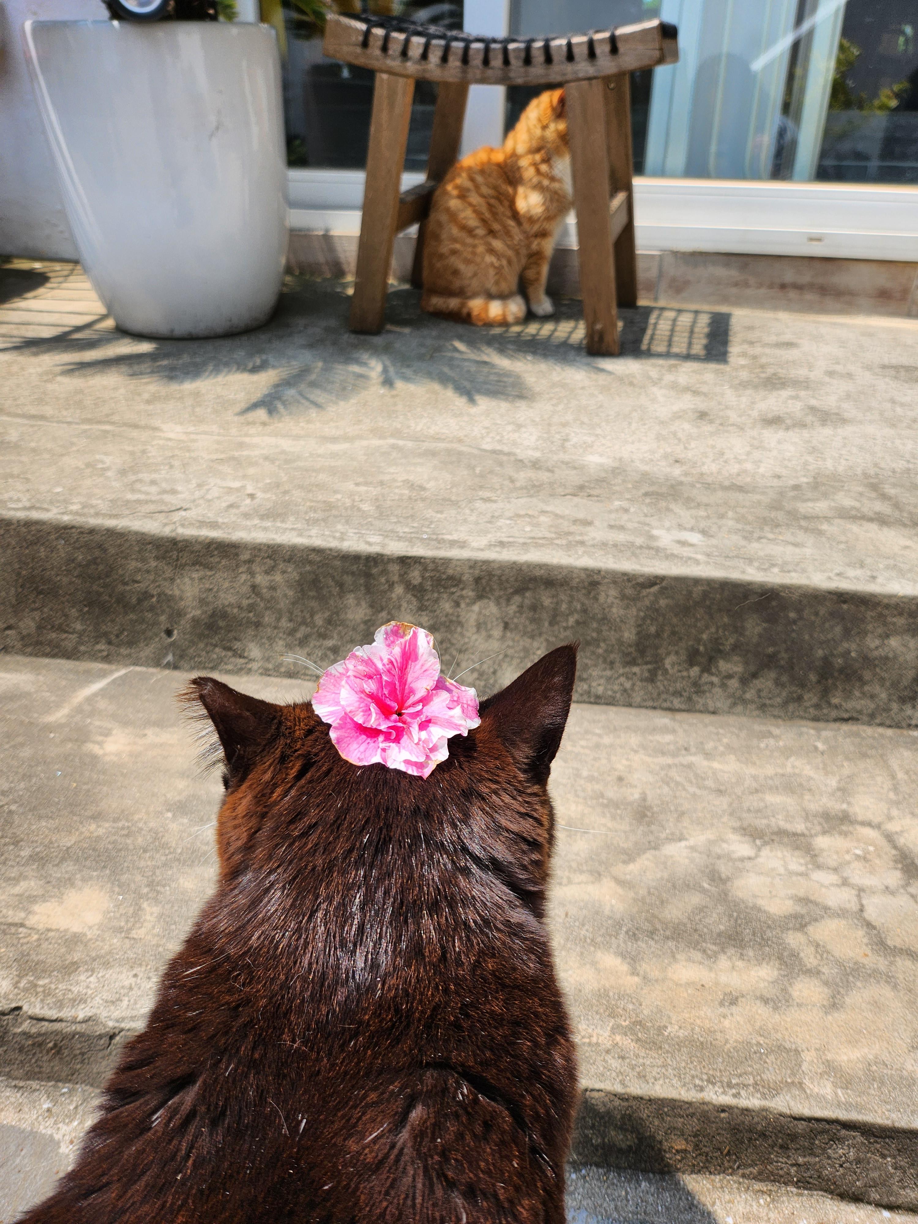 밤에 다녀간 고양이가 화분을 넘어뜨렸는지 철쭉 화분이 쓰러지고 꽃 몇송이가 바닥에 떨어져있어서 마당에 있는 고양이들에게 줘보기로 했다.