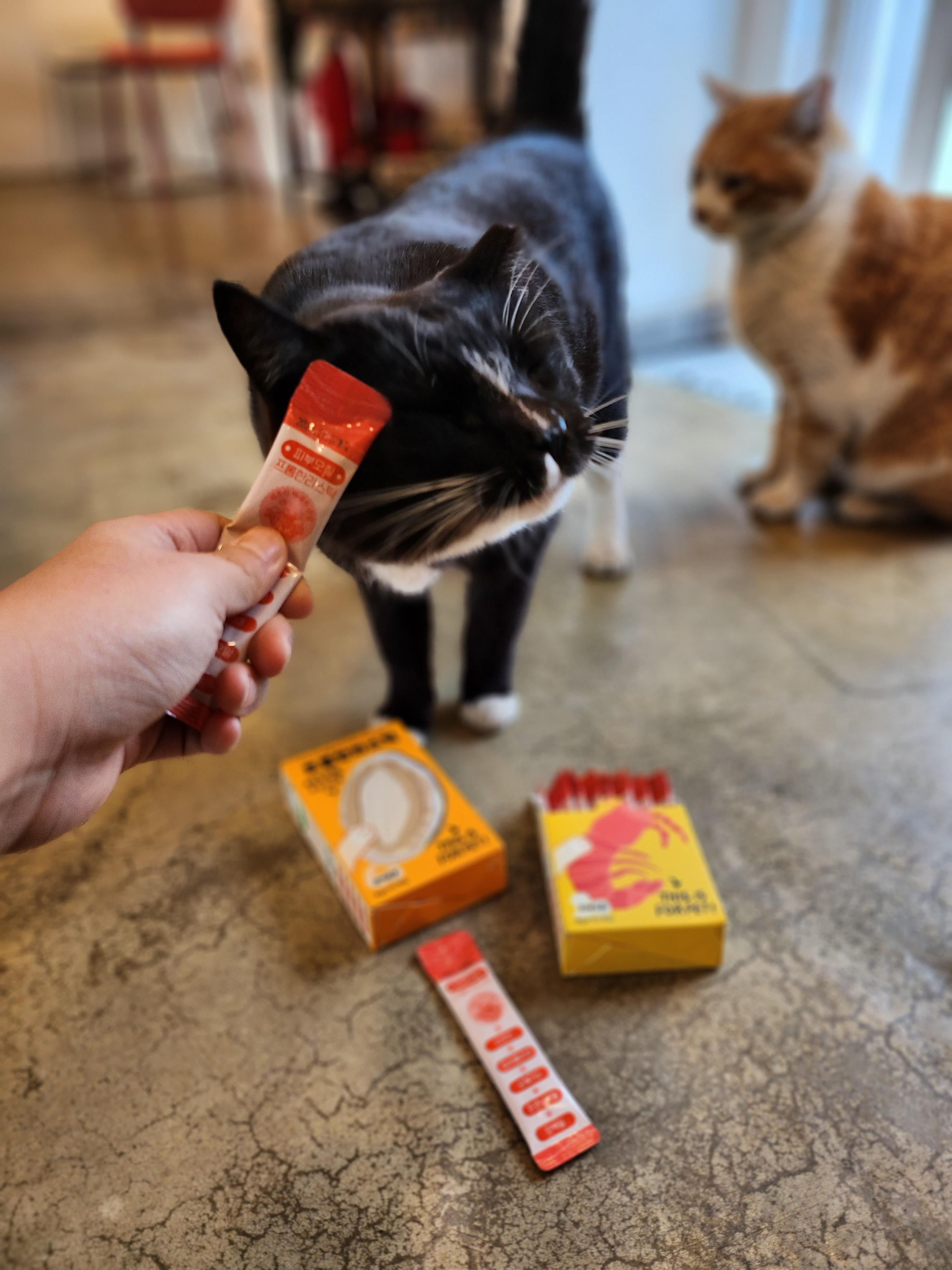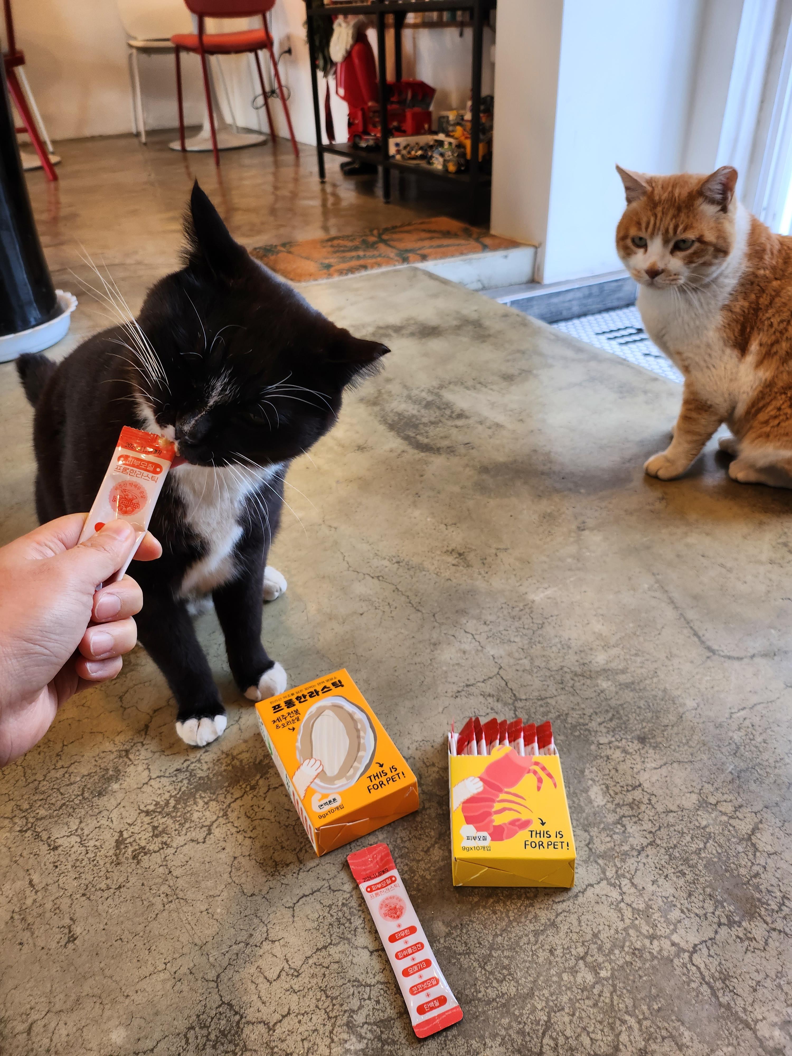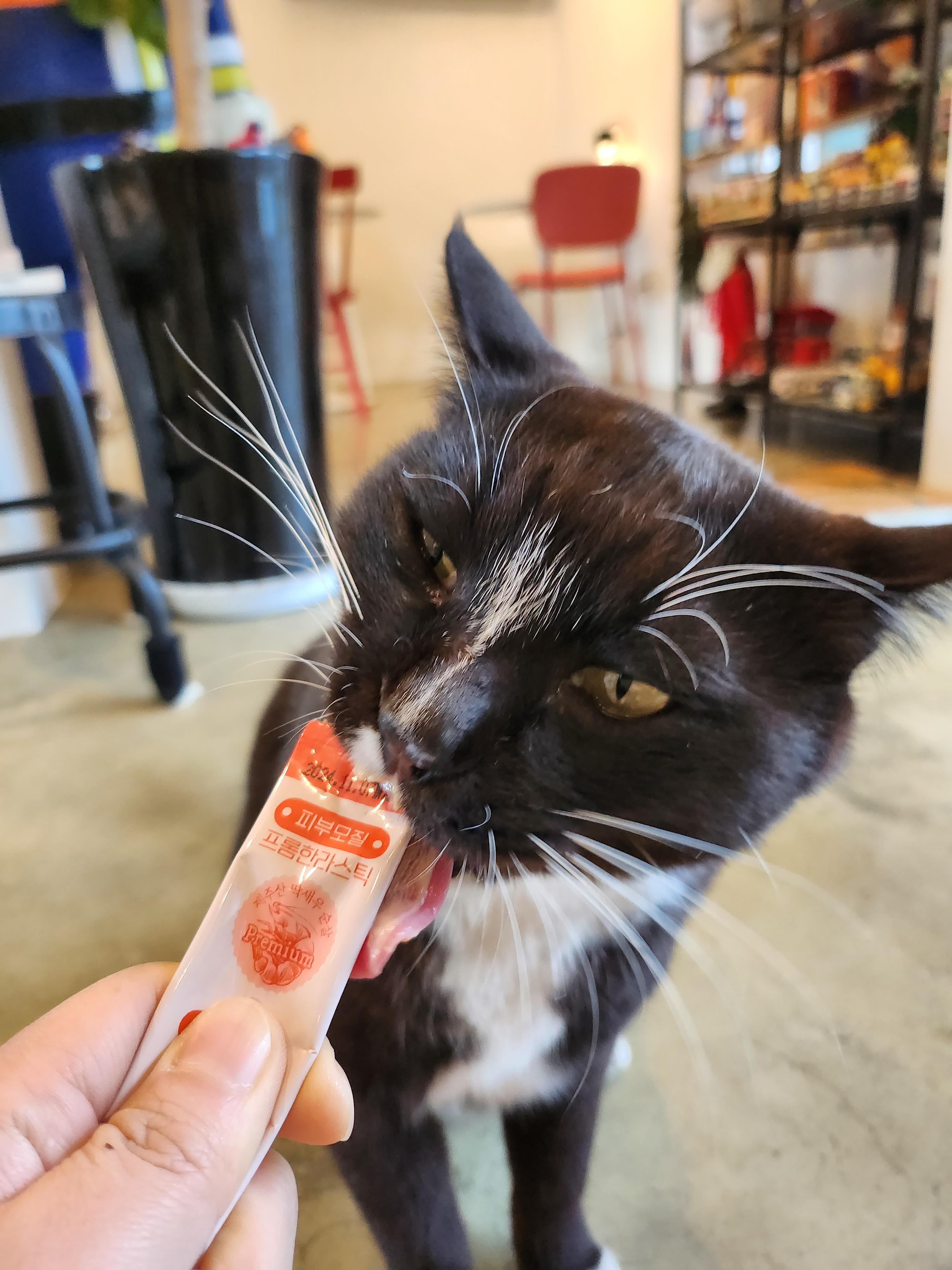 대부분 고양이와 함께 살고 있거나 고양이를 좋아하는 분들이라 고양이 간식을 사가지고 오시기도 하고, 가게에서 판매하는 고양이 간식을 사서 선물로 다시 주시기도 한다.