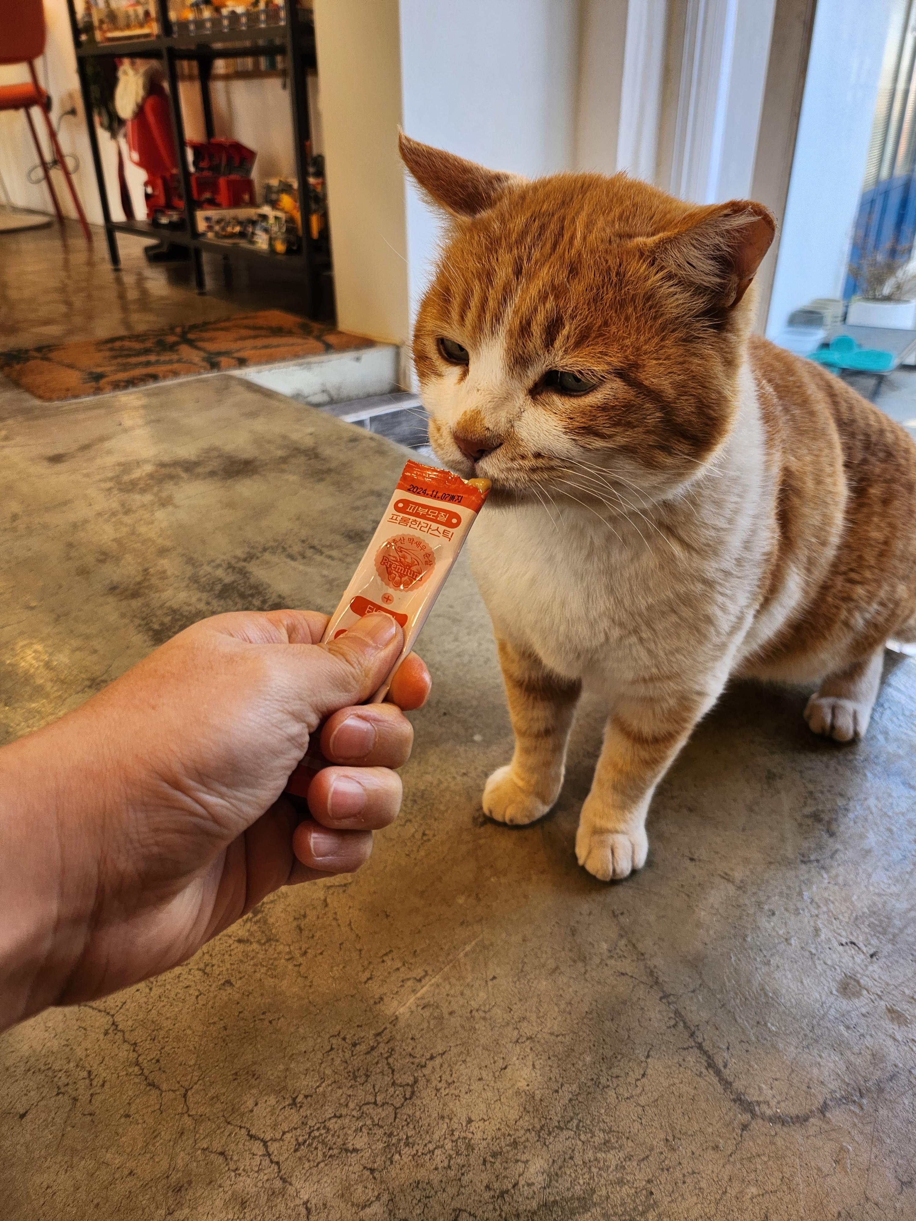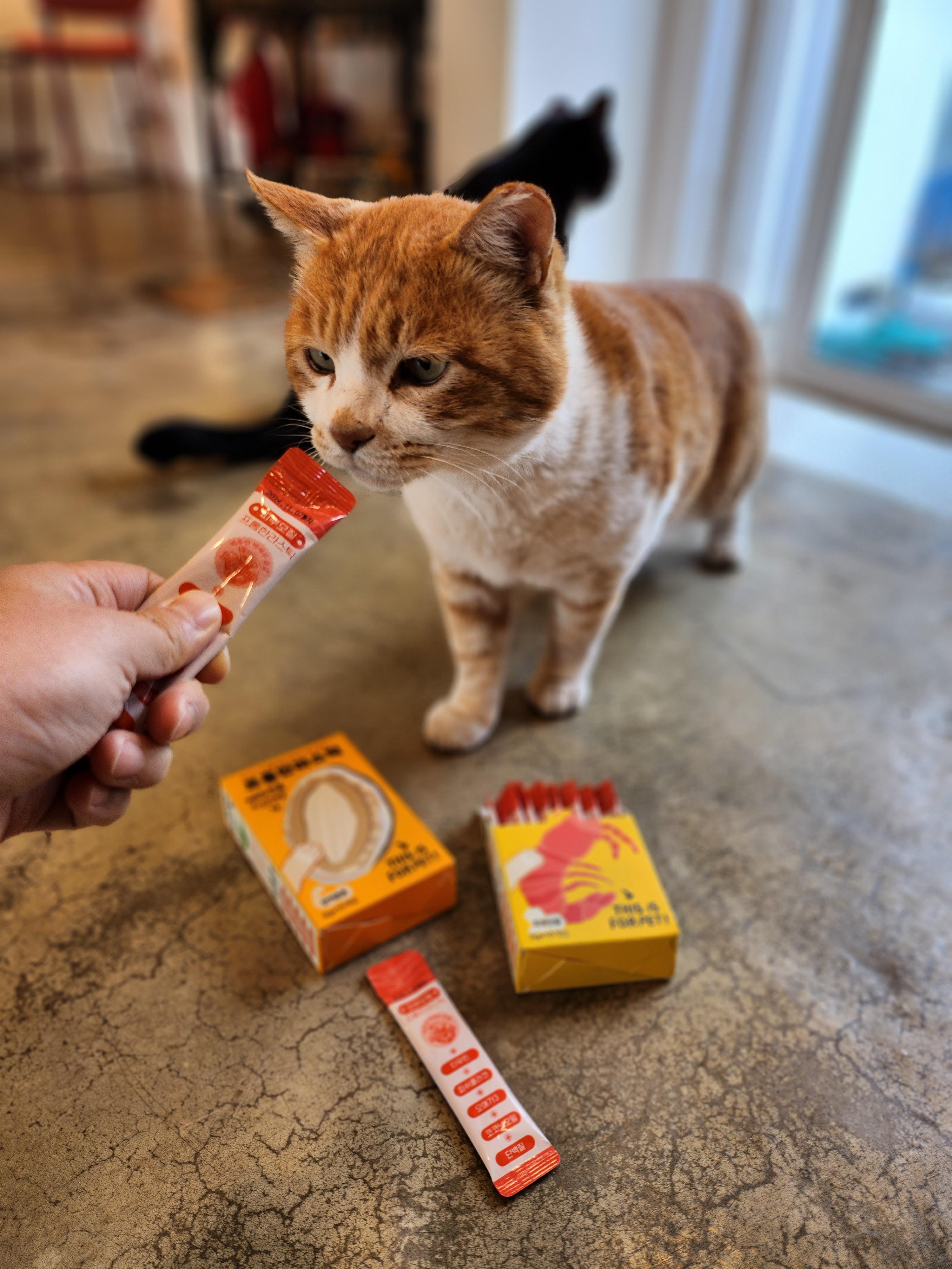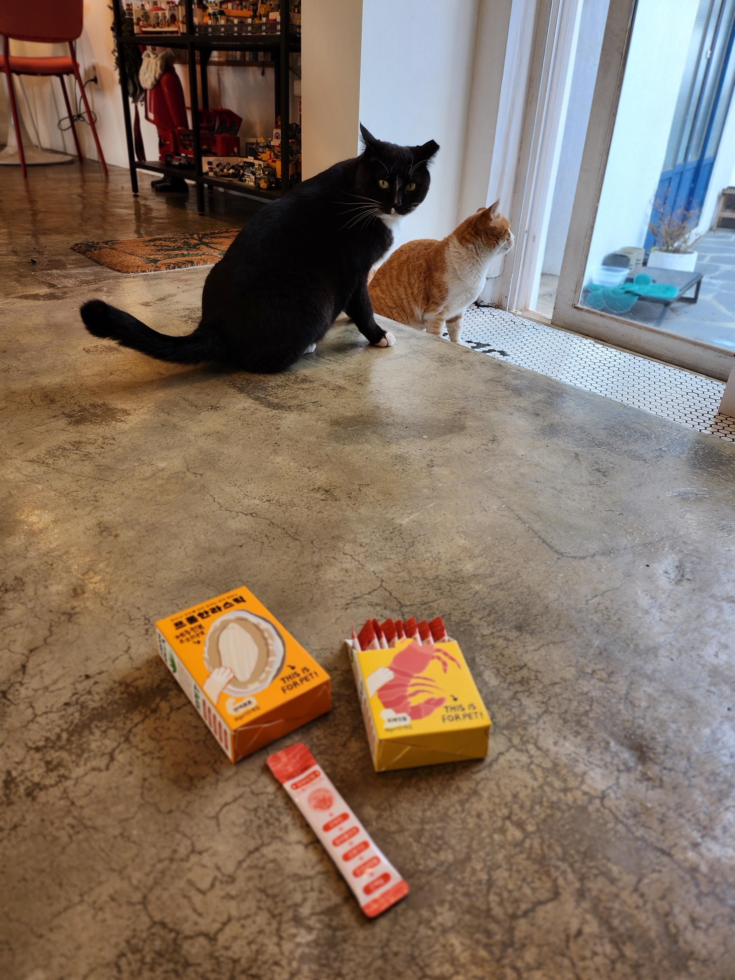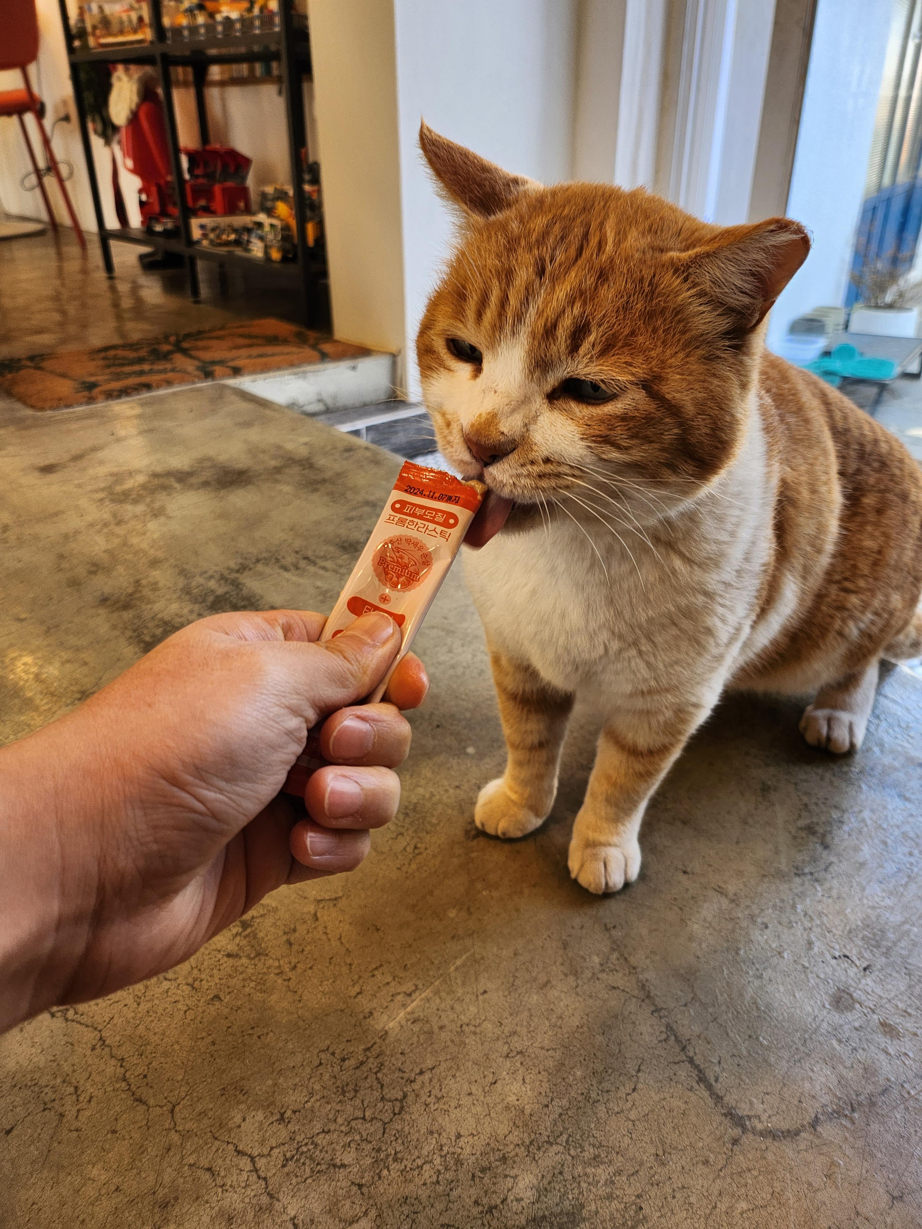 대부분 고양이와 함께 살고 있거나 고양이를 좋아하는 분들이라 고양이 간식을 사가지고 오시기도 하고, 가게에서 판매하는 고양이 간식을 사서 선물로 다시 주시기도 한다.