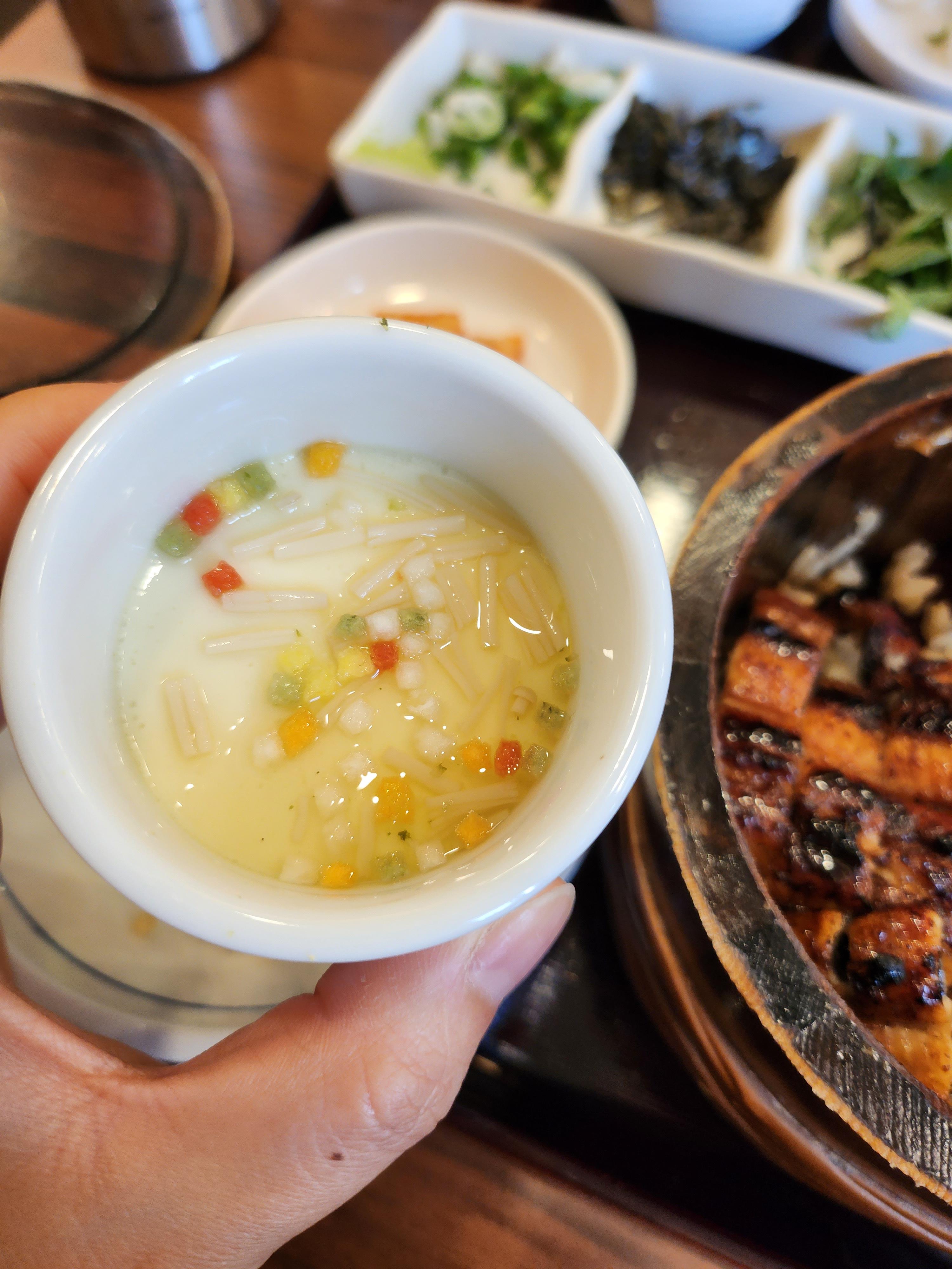 쟁반에 국과 장어덮밥, 김치, 다시물, 차완무시, 덮밥과 함께 먹을 재료들이 제공되었다.