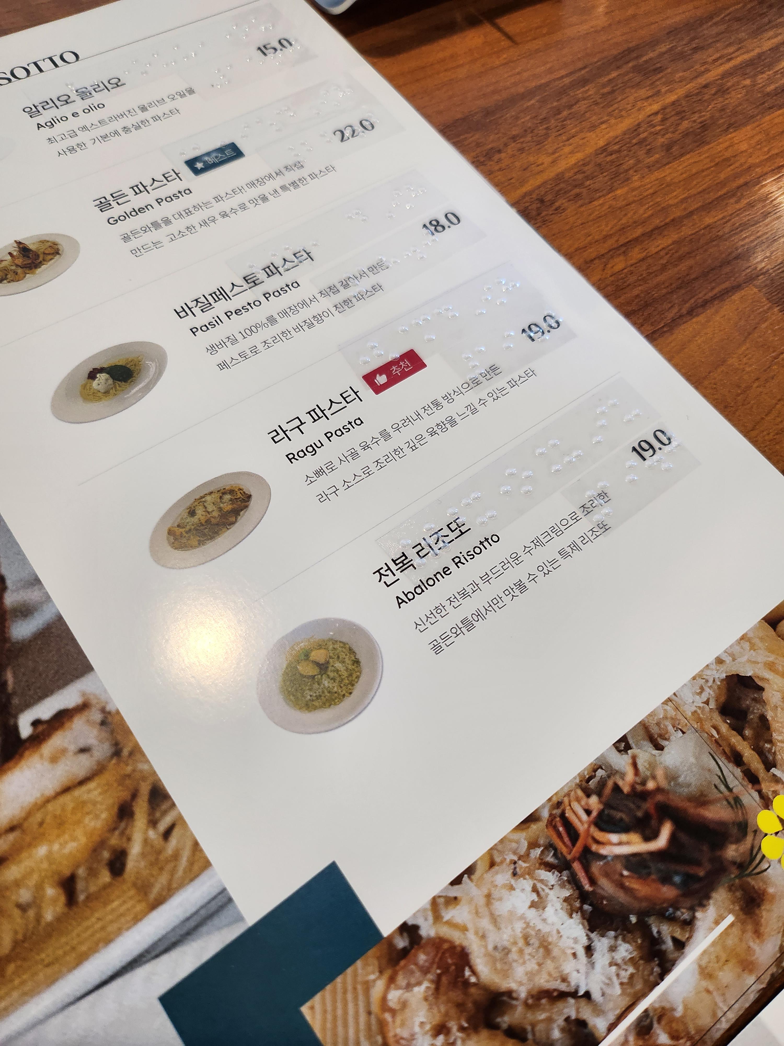 인원이 많아서 메뉴판을 2개 주셨나? 했더니 메뉴판 1개는 무려 점자 처리가 되어있더라고요. 이런 디테일 너무 좋아요. 우리나라는 장애인에 대한 배려가 아직 부족한데, 개인 업장에서 이렇게까지 배려를 한다는게 조금 감동스럽더라고요.