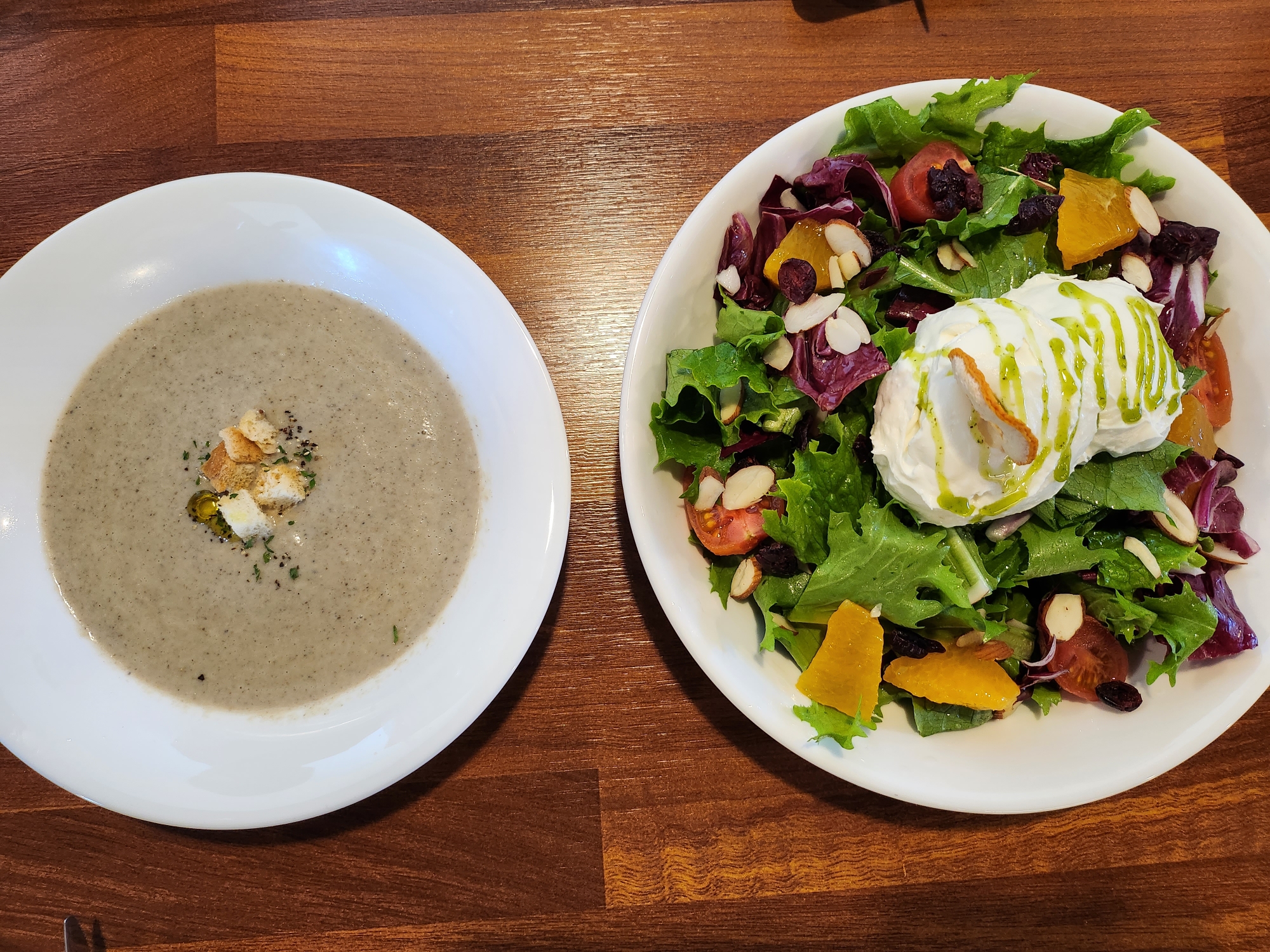 오늘의 스프와 리코타 치즈 샐러드, 알리오 올리오, 바질 페스토 파스타를 주문했어요.
