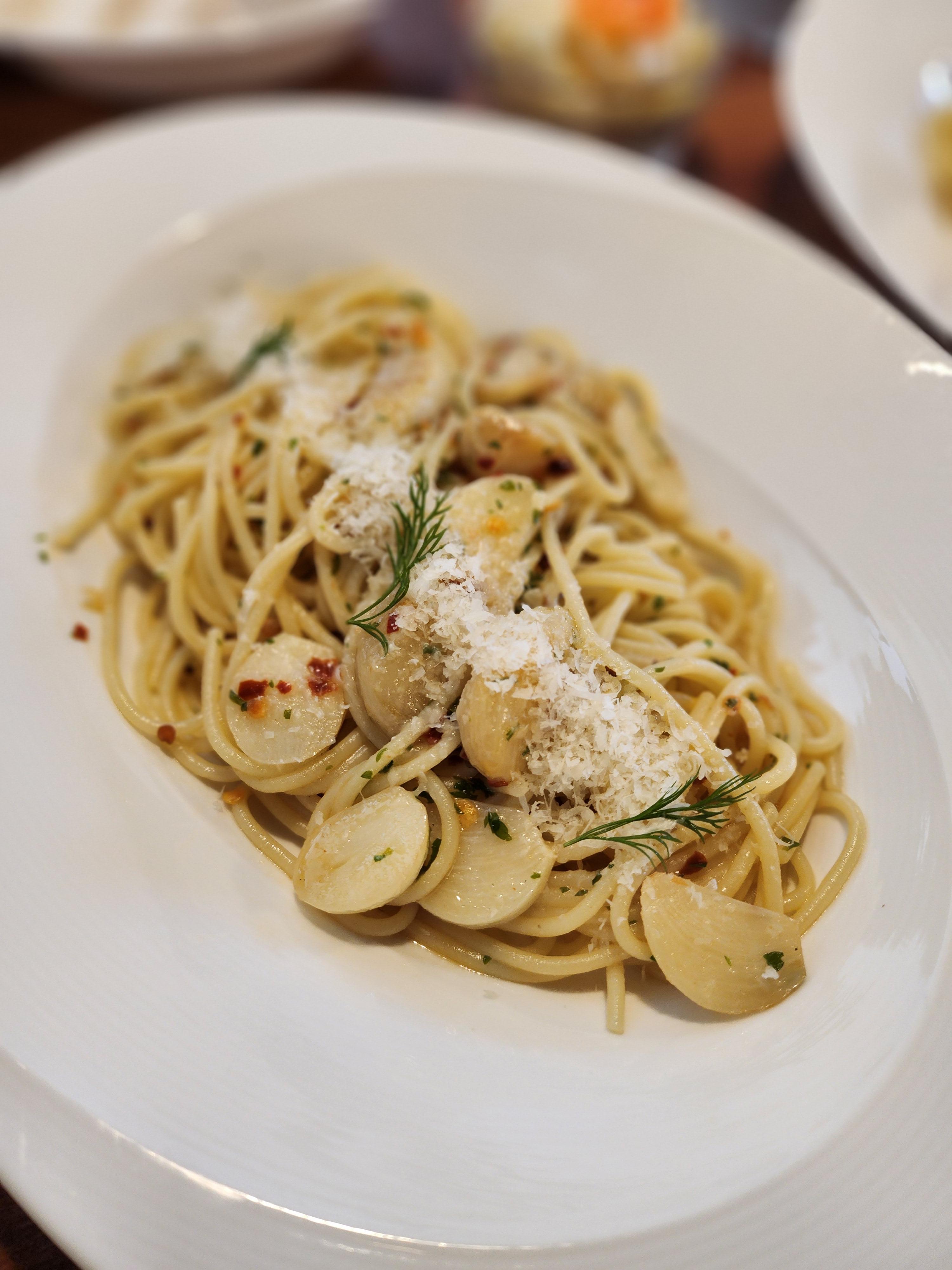 최고급 버진 올리브 오일과 마늘을 듬뿍 넣은 알리오 올리오 파스타.