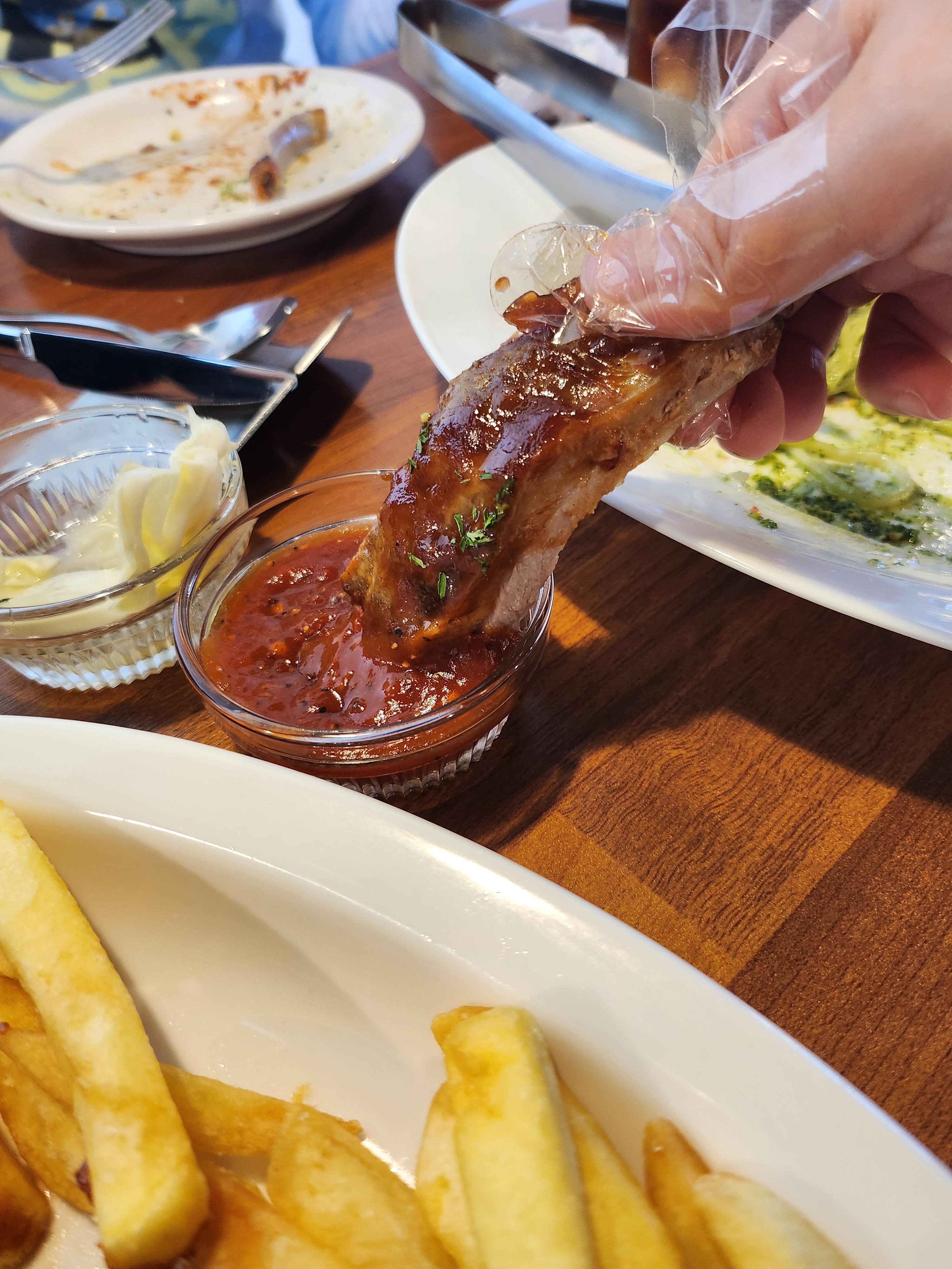 그리고 폭립 등장! 크~ 빛깔부터 아주 자극적이고 맛있게 생겼네요 ㅎㅎ 조리가 잘 되어있어서 나이프를 대기만 했는데도 스르륵 컷팅이 되는 이 느낌! 손가락 비닐장갑을 주셔서 맘편히 손으로 잡고 맛있게 먹었어요.