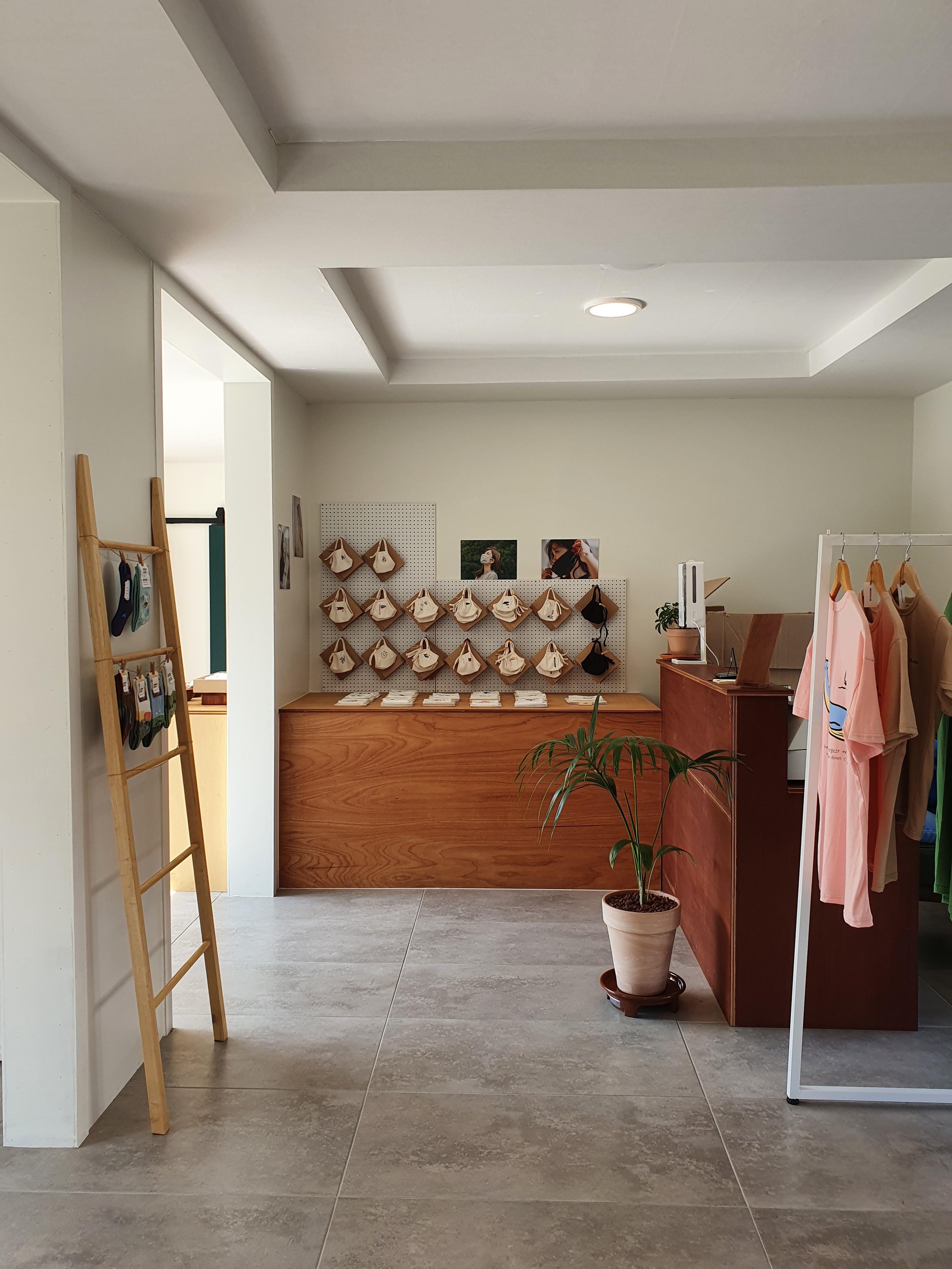 오가닉 마스크와 티셔츠, 양말등이 진열되어 있었다.