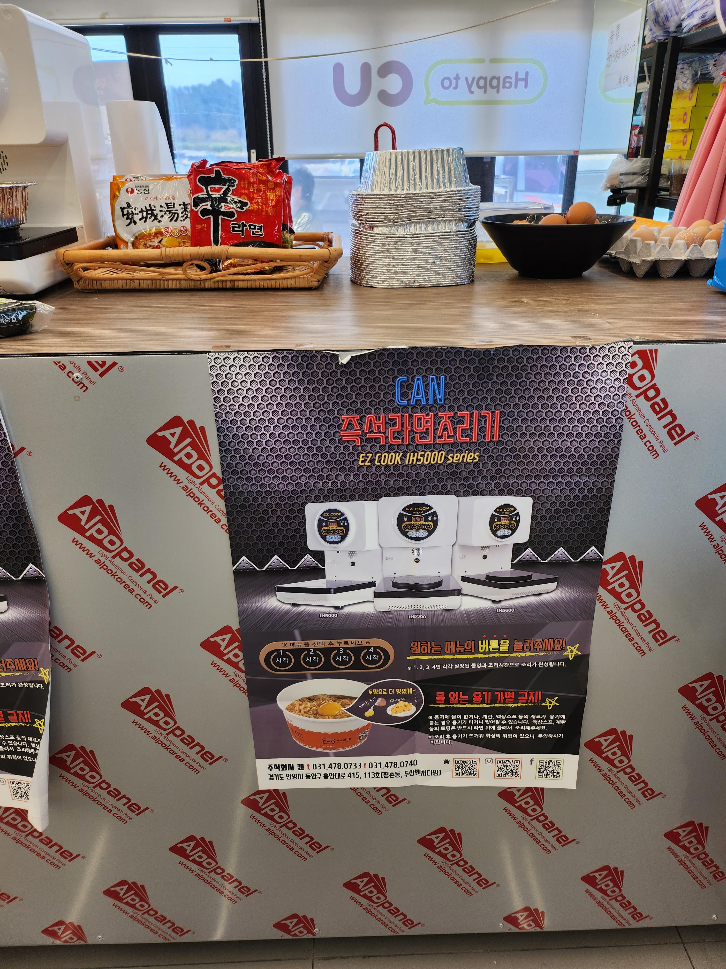 따란~! 이것이 바로 주방용품계의 제니, 이국주씨가 극찬했던 즉석라면 제조기이다. CU편의점 안에 있기는 하지만 사업자가 달라서 따로 결제 후 이용해야한다.