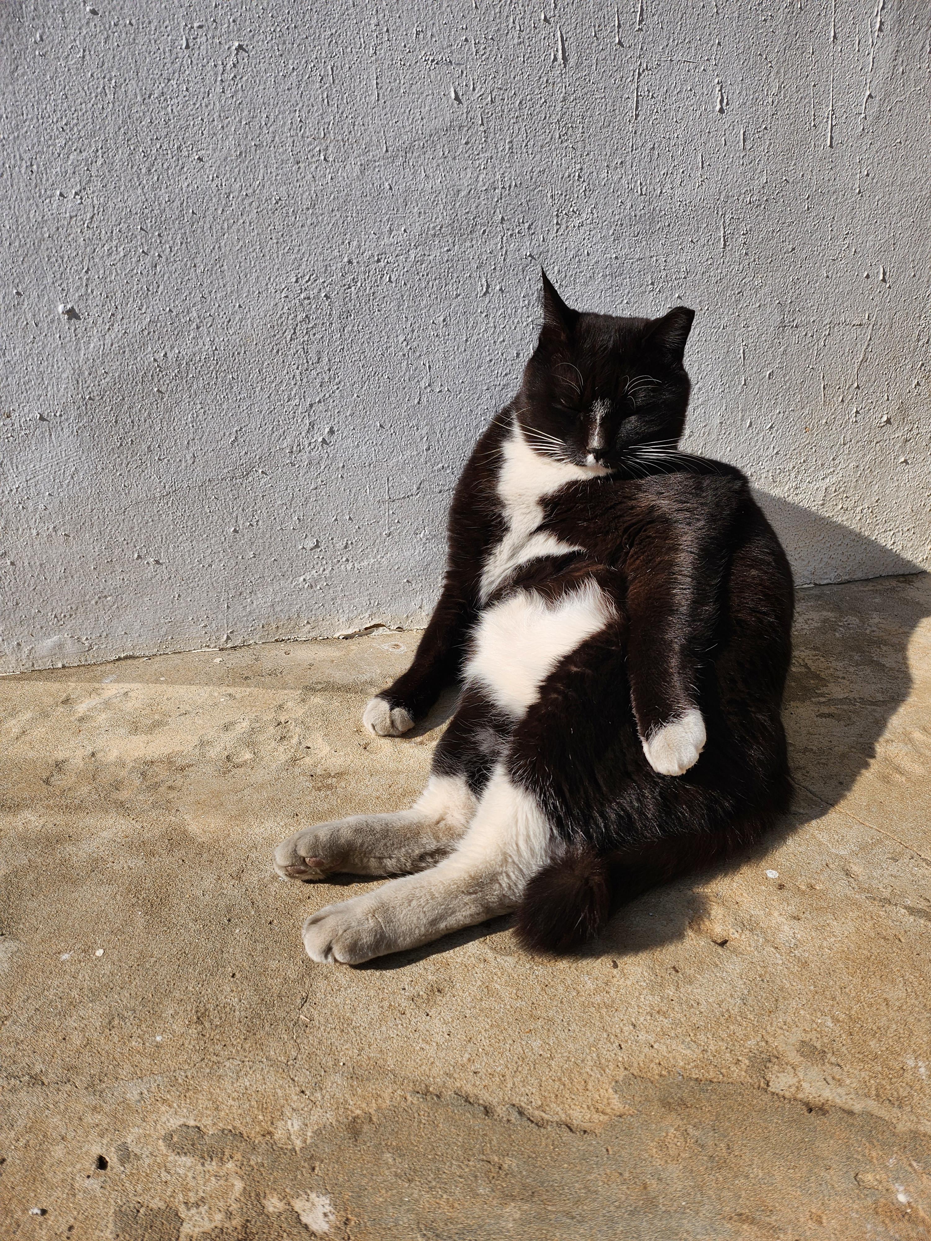 김녕치즈마을의 마당엔 왕이 있다. 치즈 무늬 고양이들 속 유일한 턱시도인 필통씨. 점점 몸집을 키워가더니 이제는 누구도 함부로 덤빌 수 없는 피지컬을 가졌고 하지만 마음은 또 평화주의자