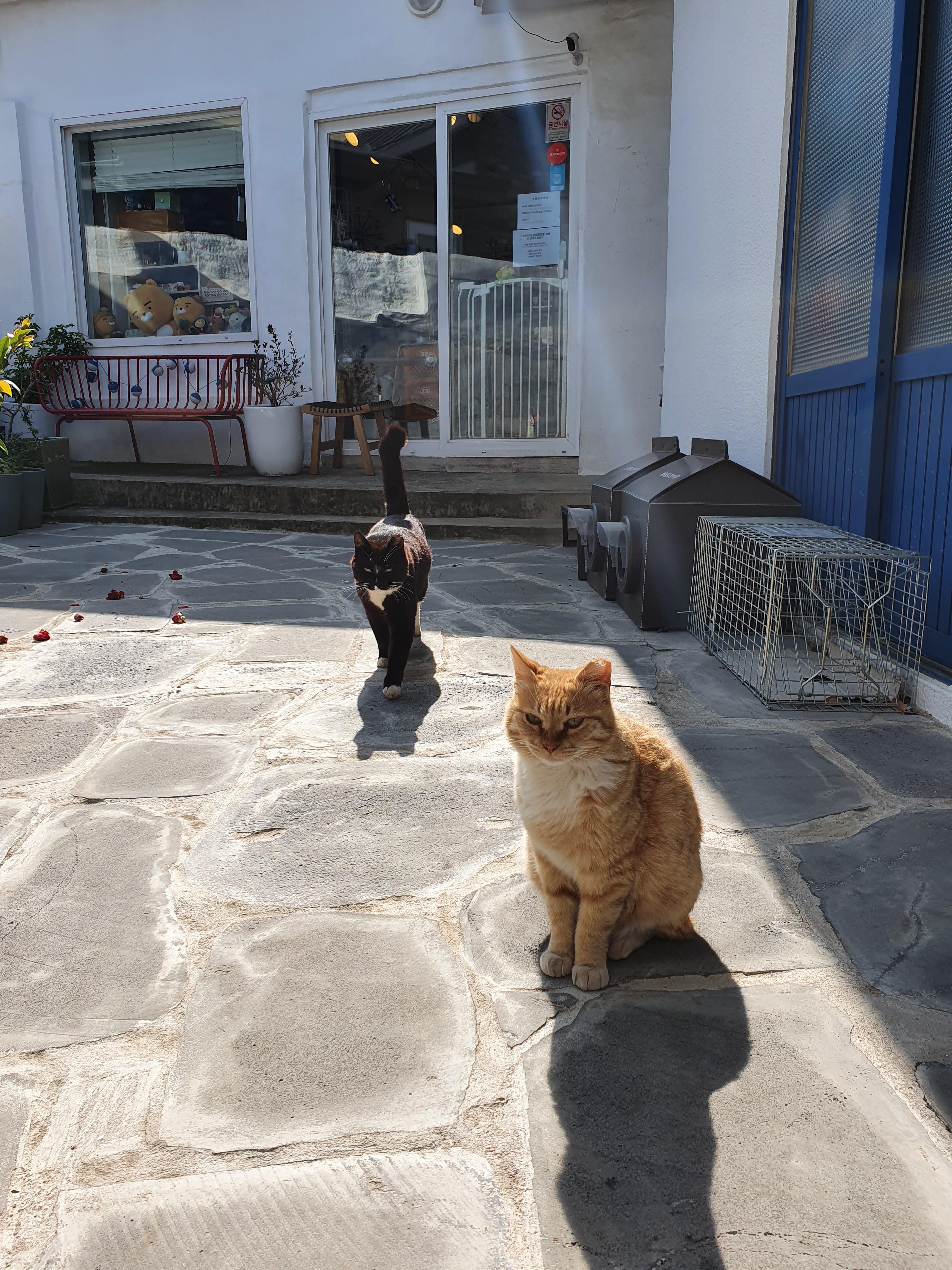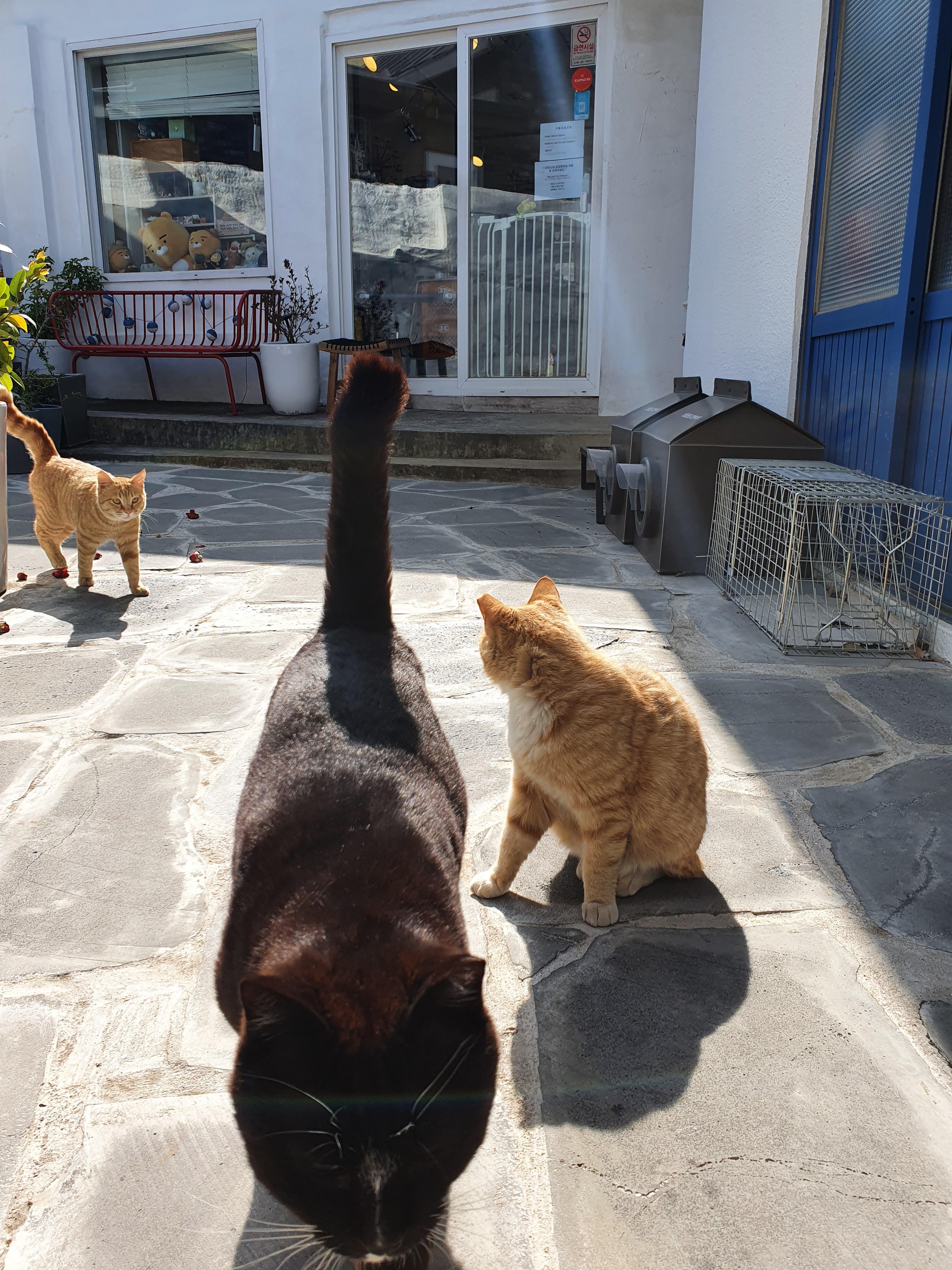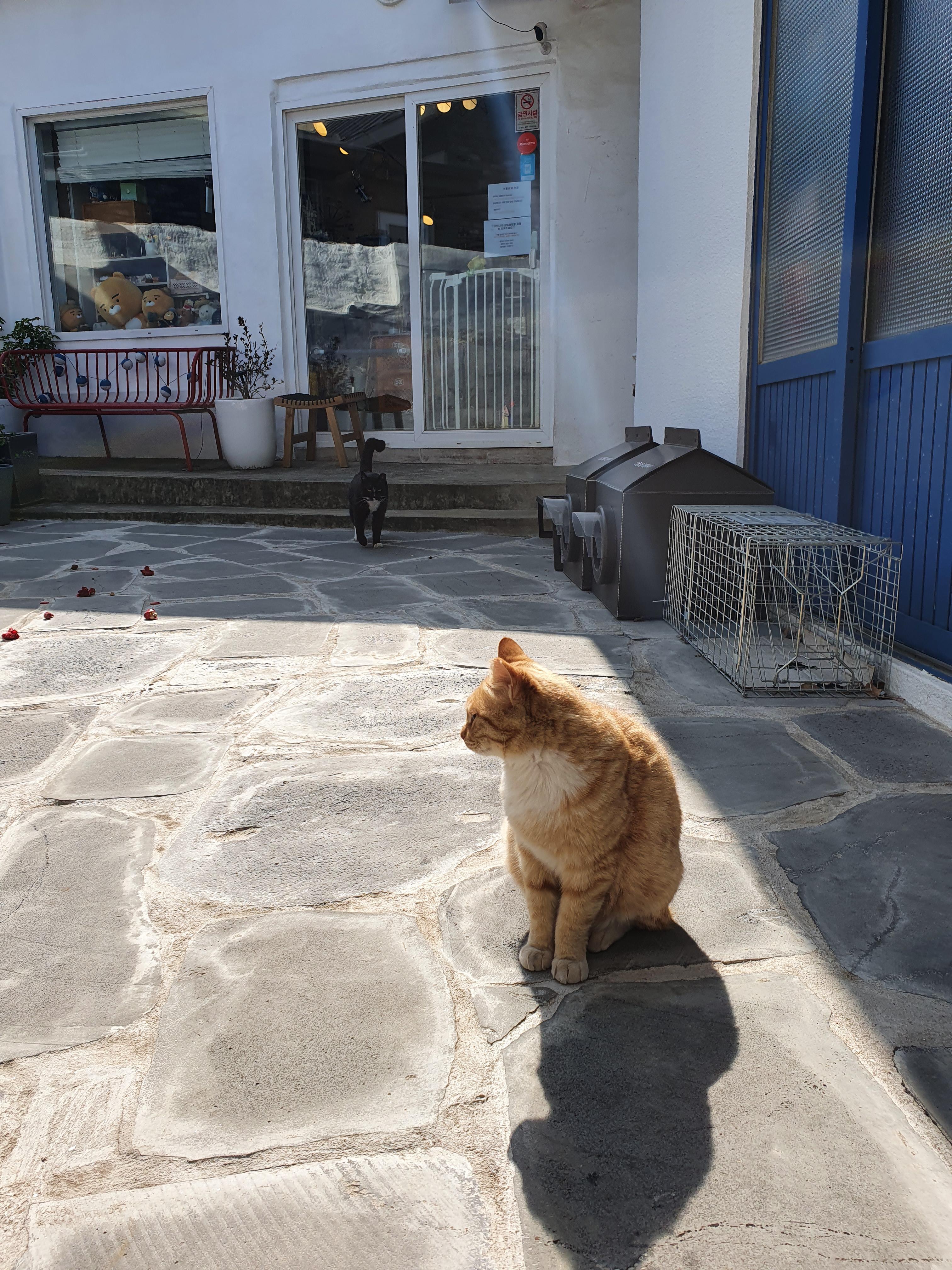 창밖을 바라보던 중 치즈 고양이들이 돌담 위에 하나둘 귀엽게 앉아있었다 어디서나 안정적인 자세의 고양이들 탄광이가 갑자기 지붕 위로 시선을 옮겼고 필통씨가 나타났다! 지붕 위에서 돌담