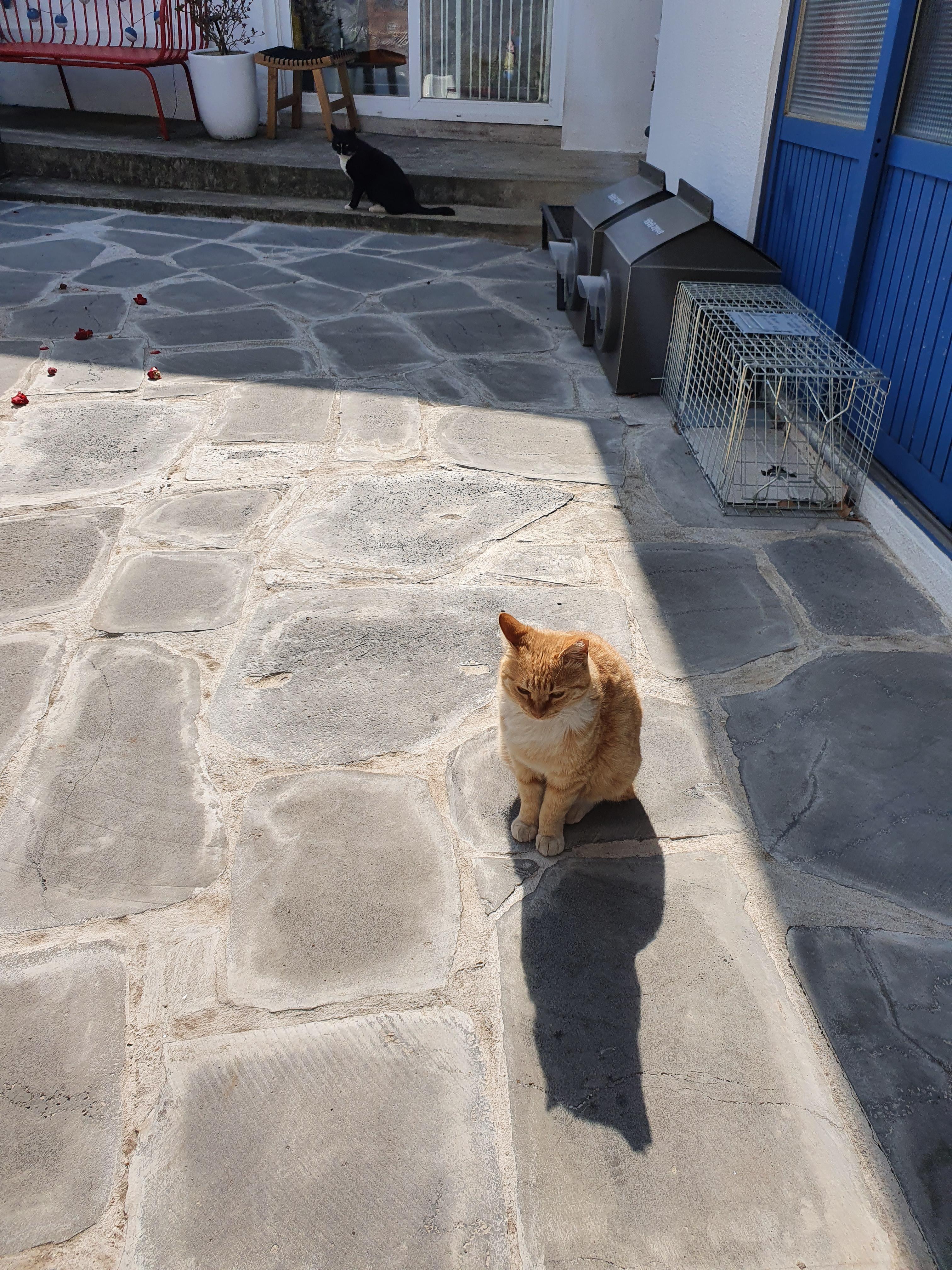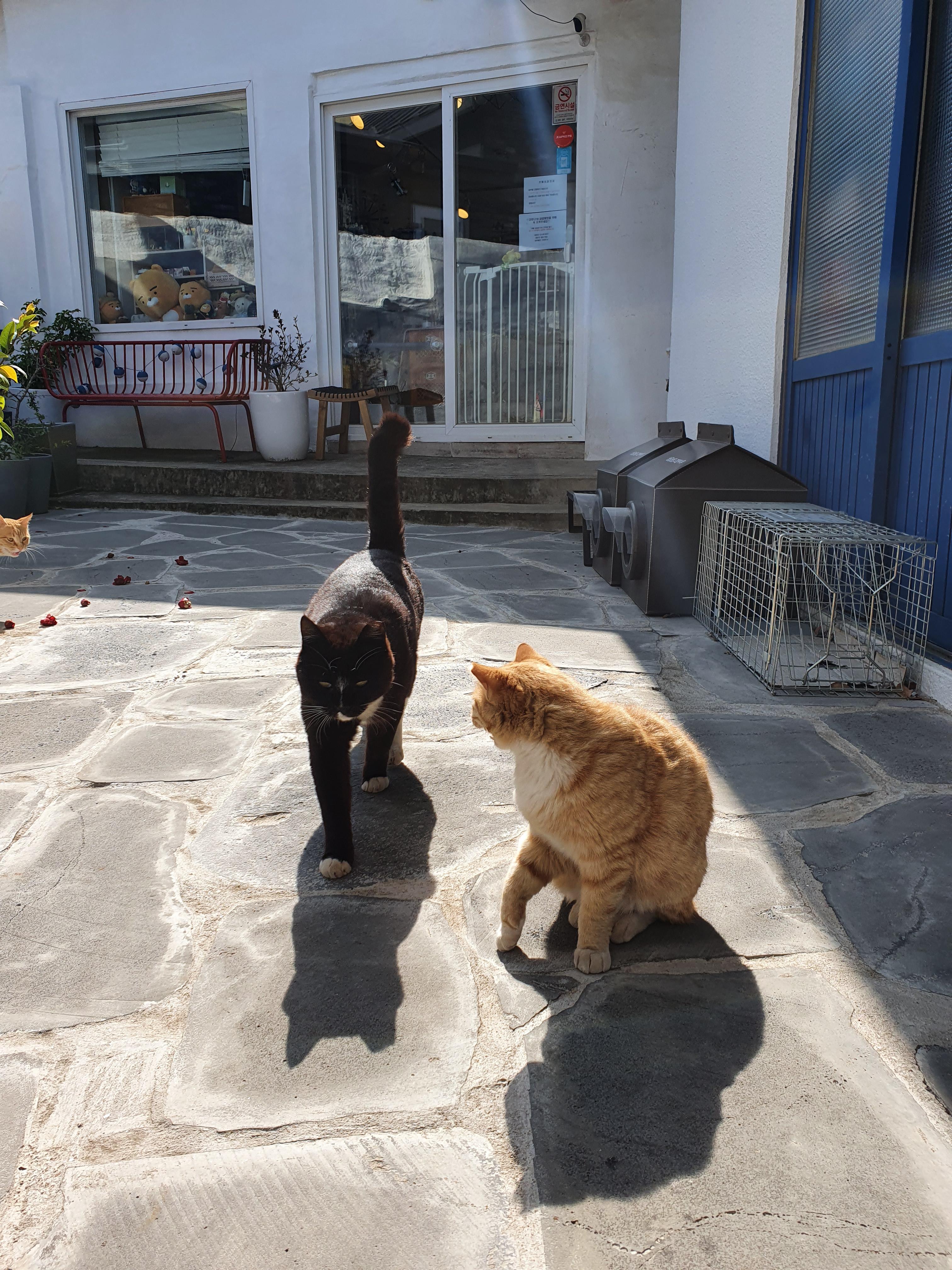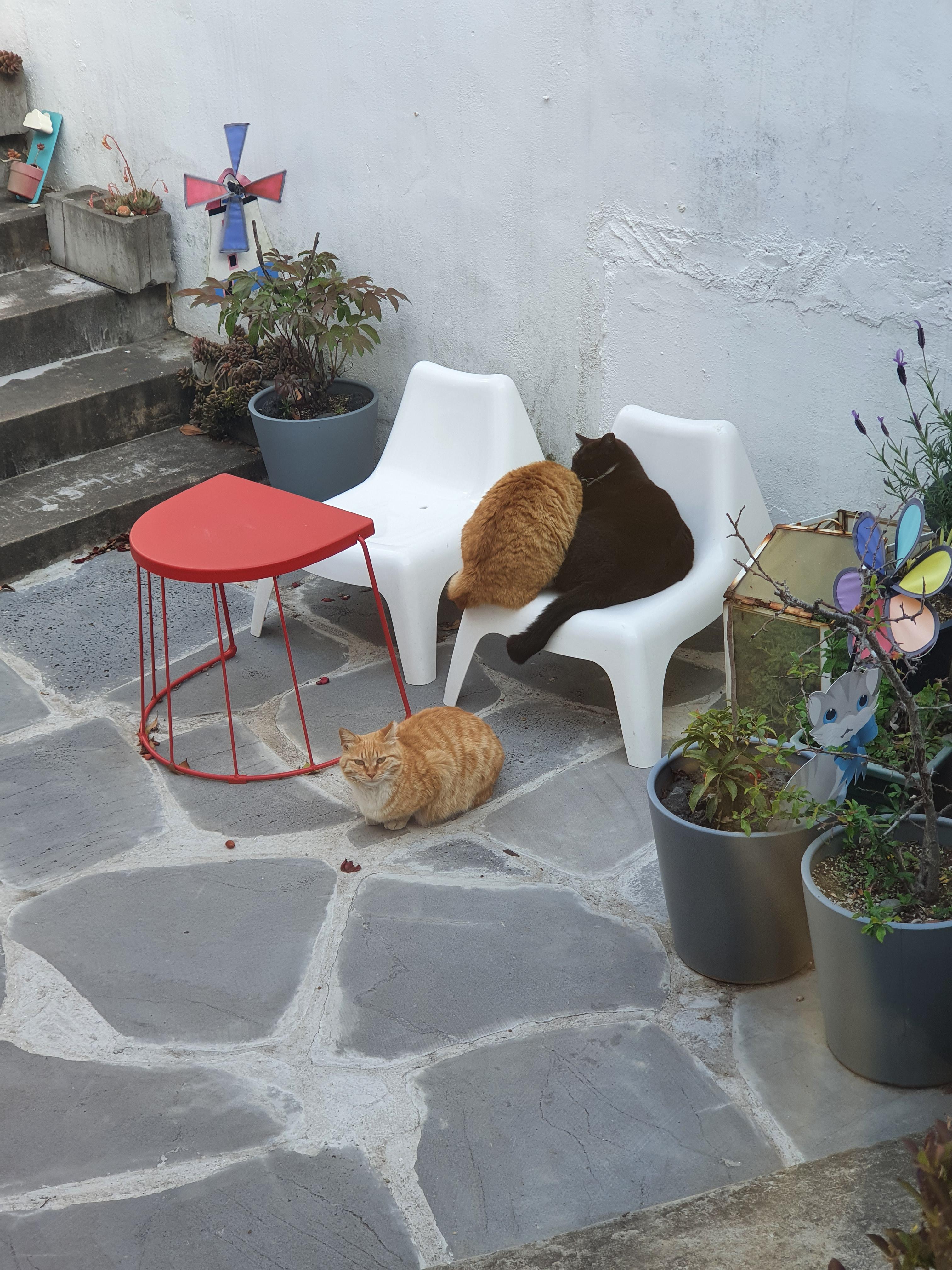 창밖을 바라보던 중 치즈 고양이들이 돌담 위에 하나둘 귀엽게 앉아있었다 어디서나 안정적인 자세의 고양이들 탄광이가 갑자기 지붕 위로 시선을 옮겼고 필통씨가 나타났다! 지붕 위에서 돌담