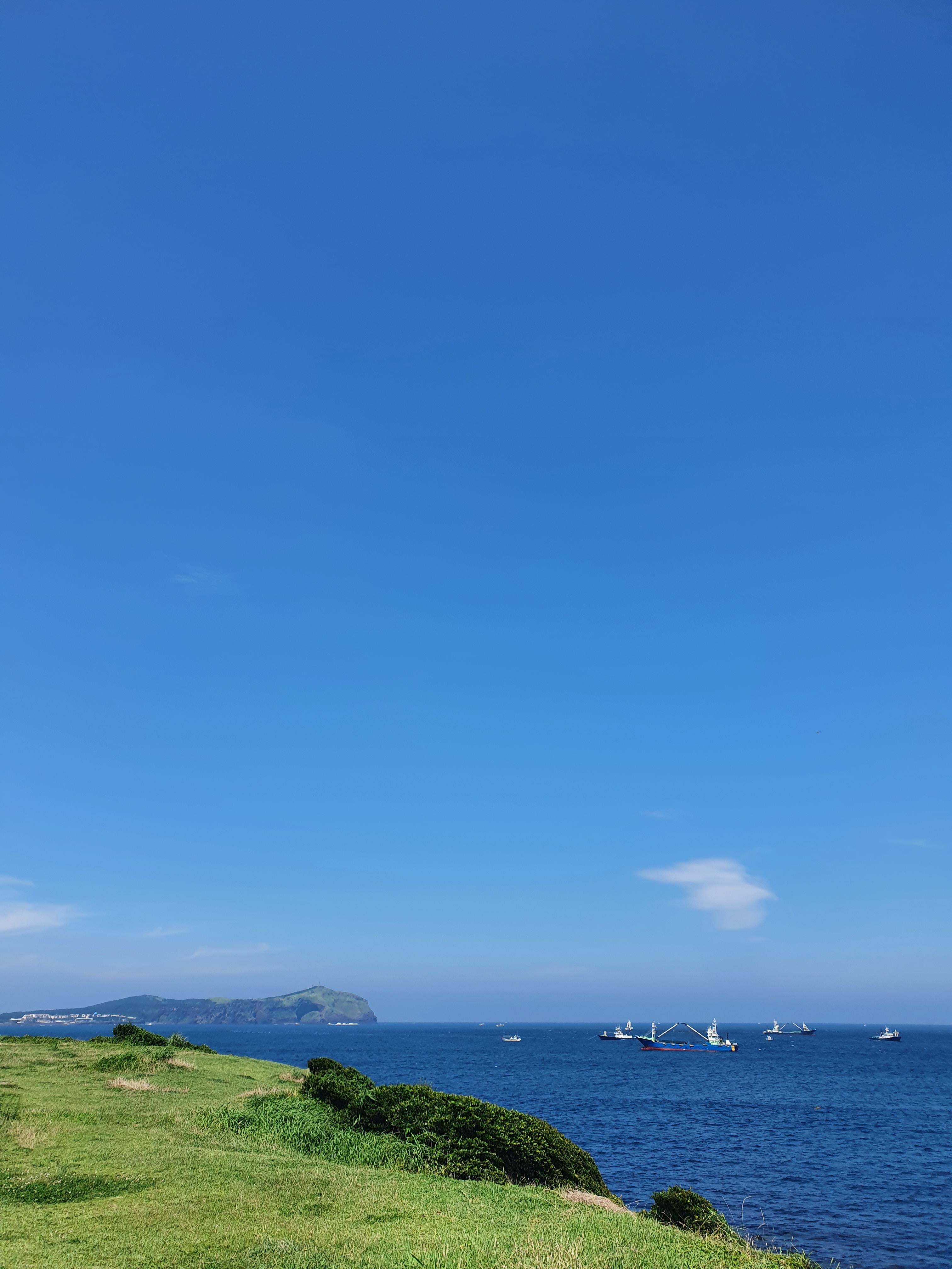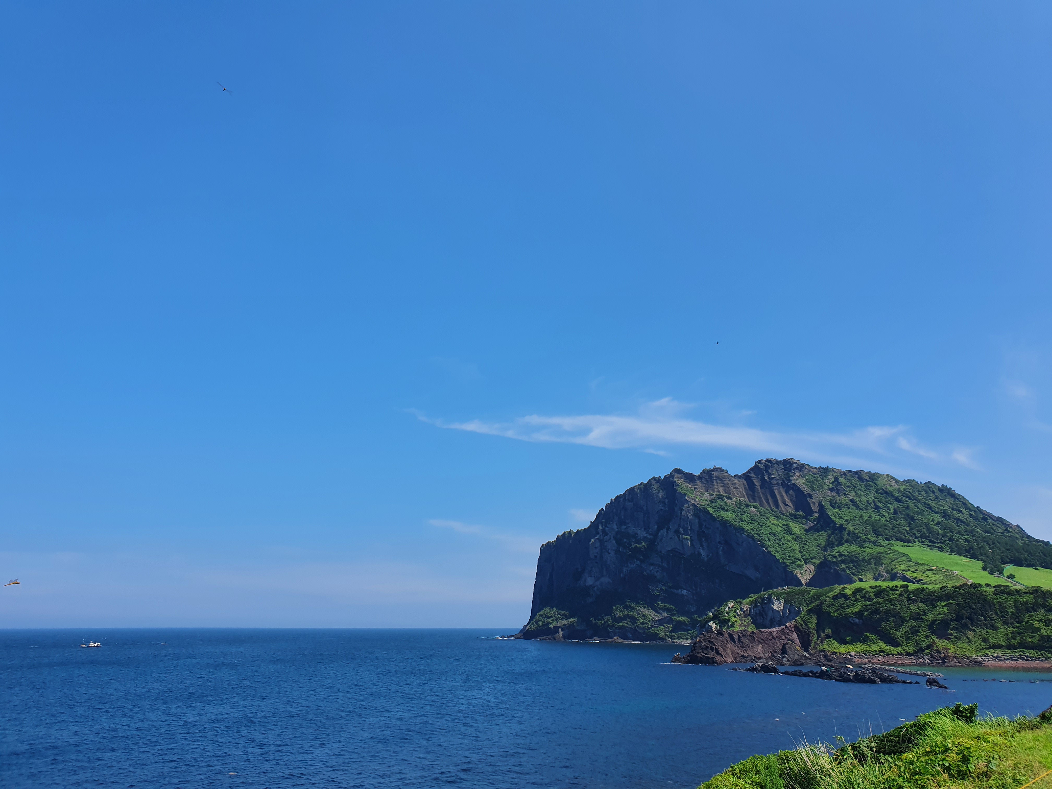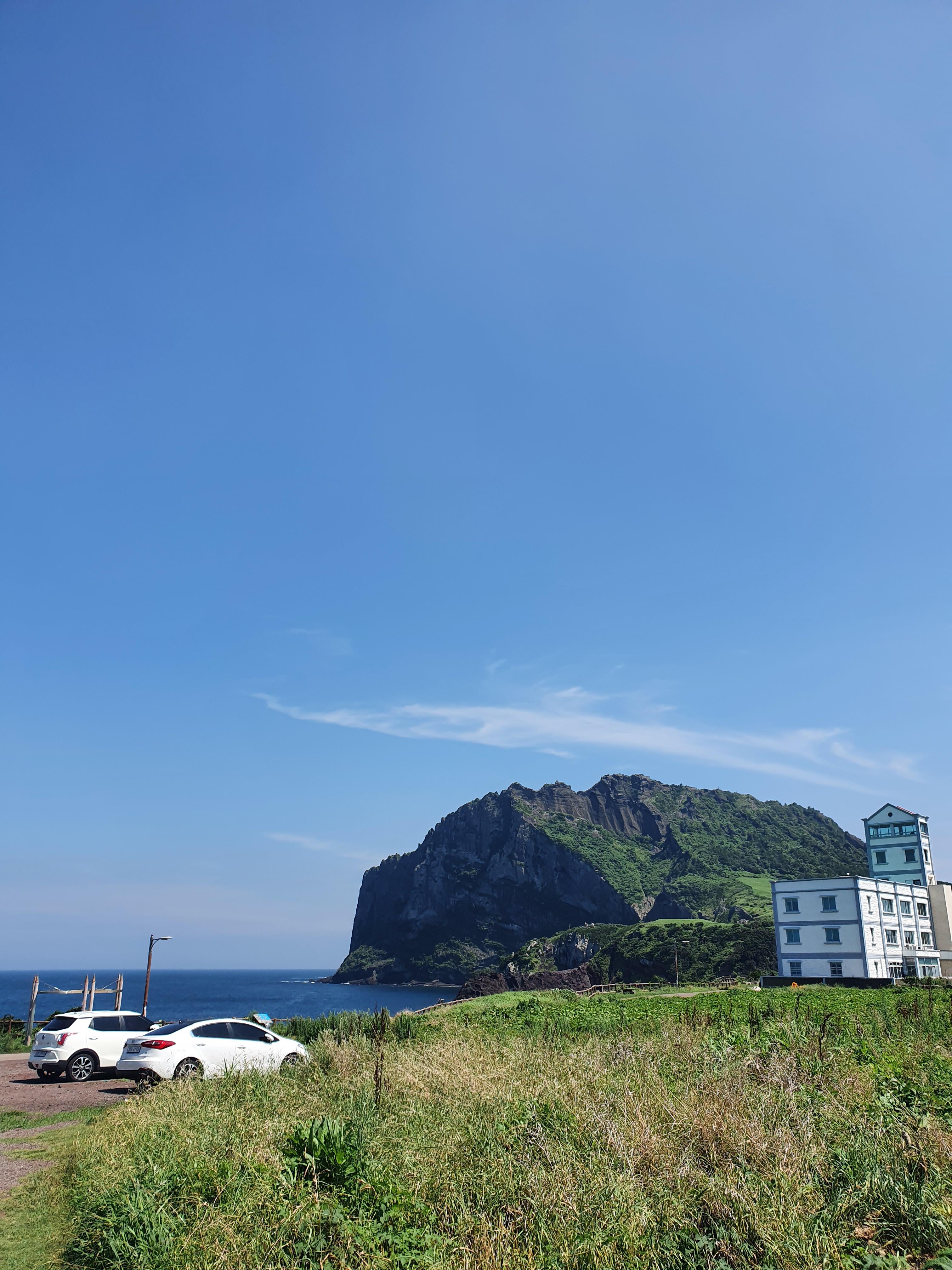 바로 뒤로는 성산일출봉과 깊은 바다가 보이는,