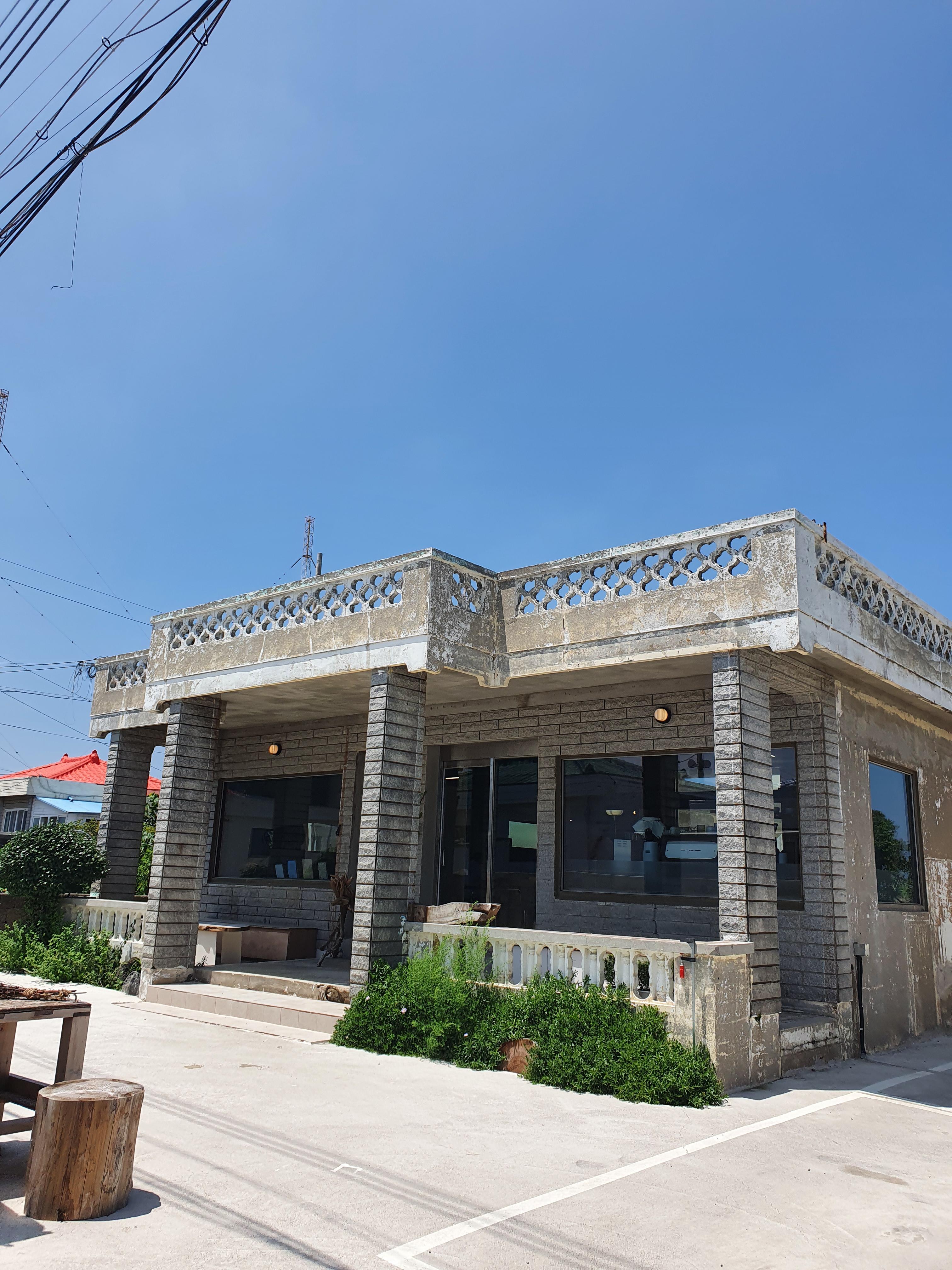 바다 반대 방향의 마을 입구로 들어오시면 회색 건물의 나무아래가 있습니다. :)