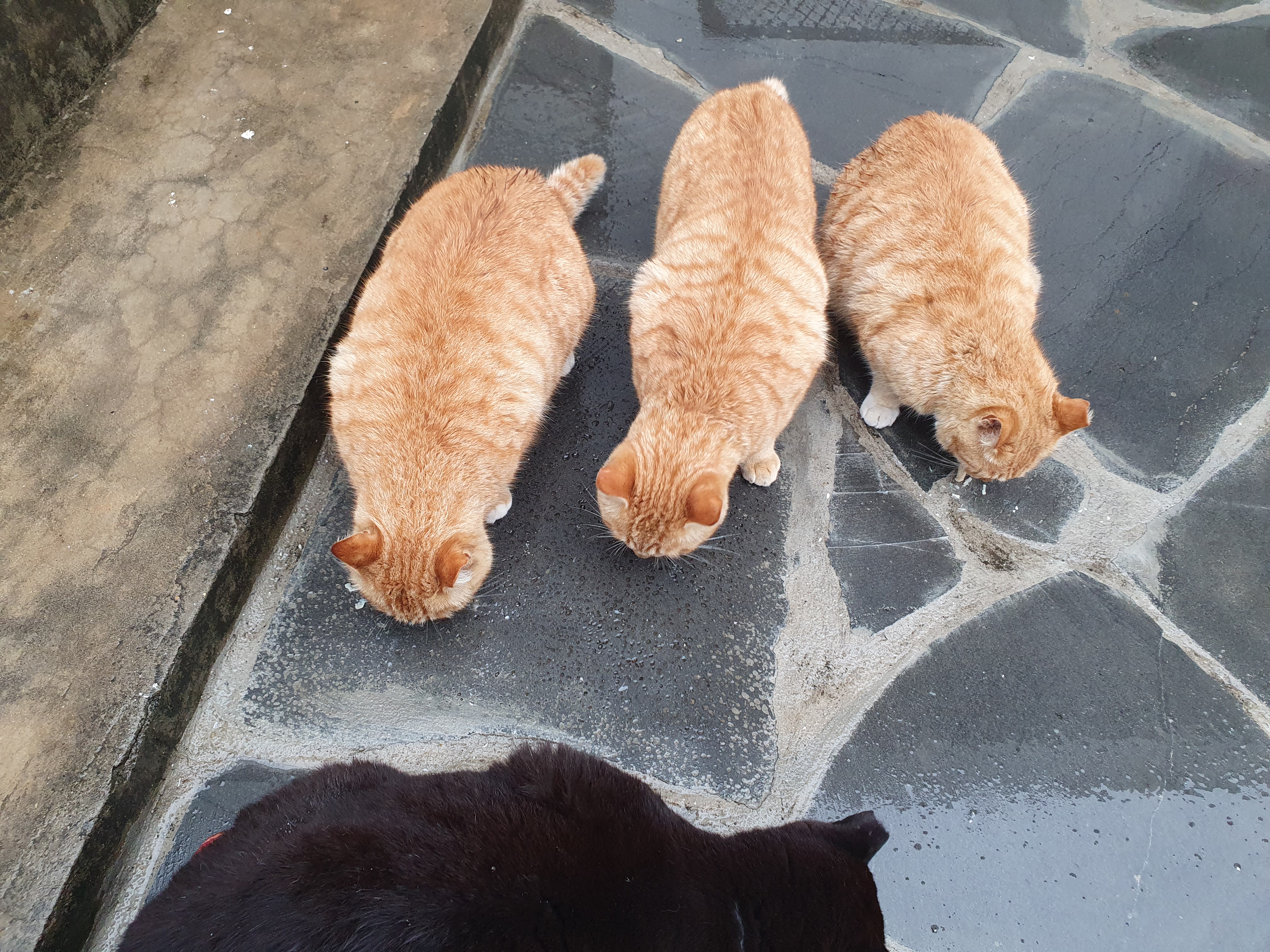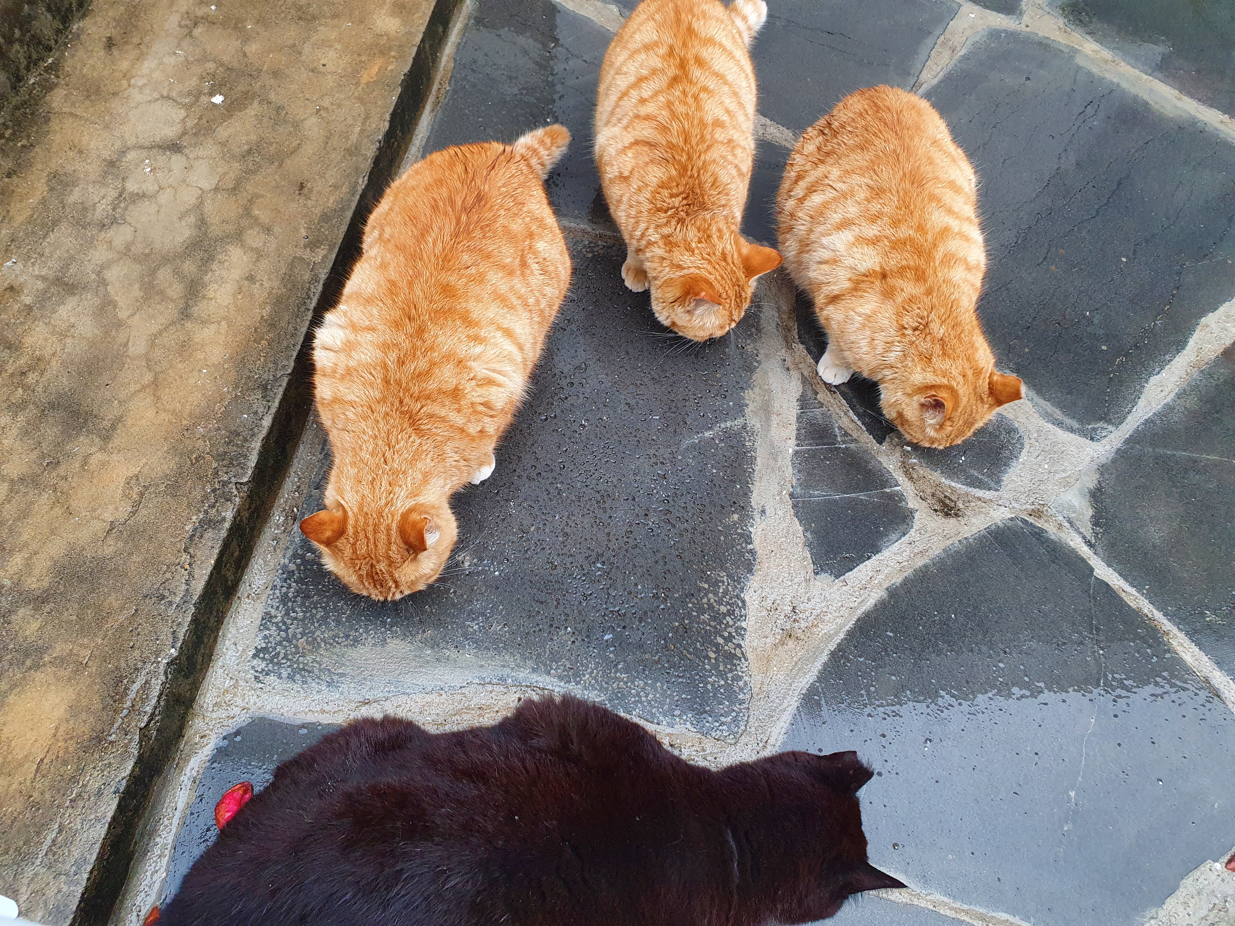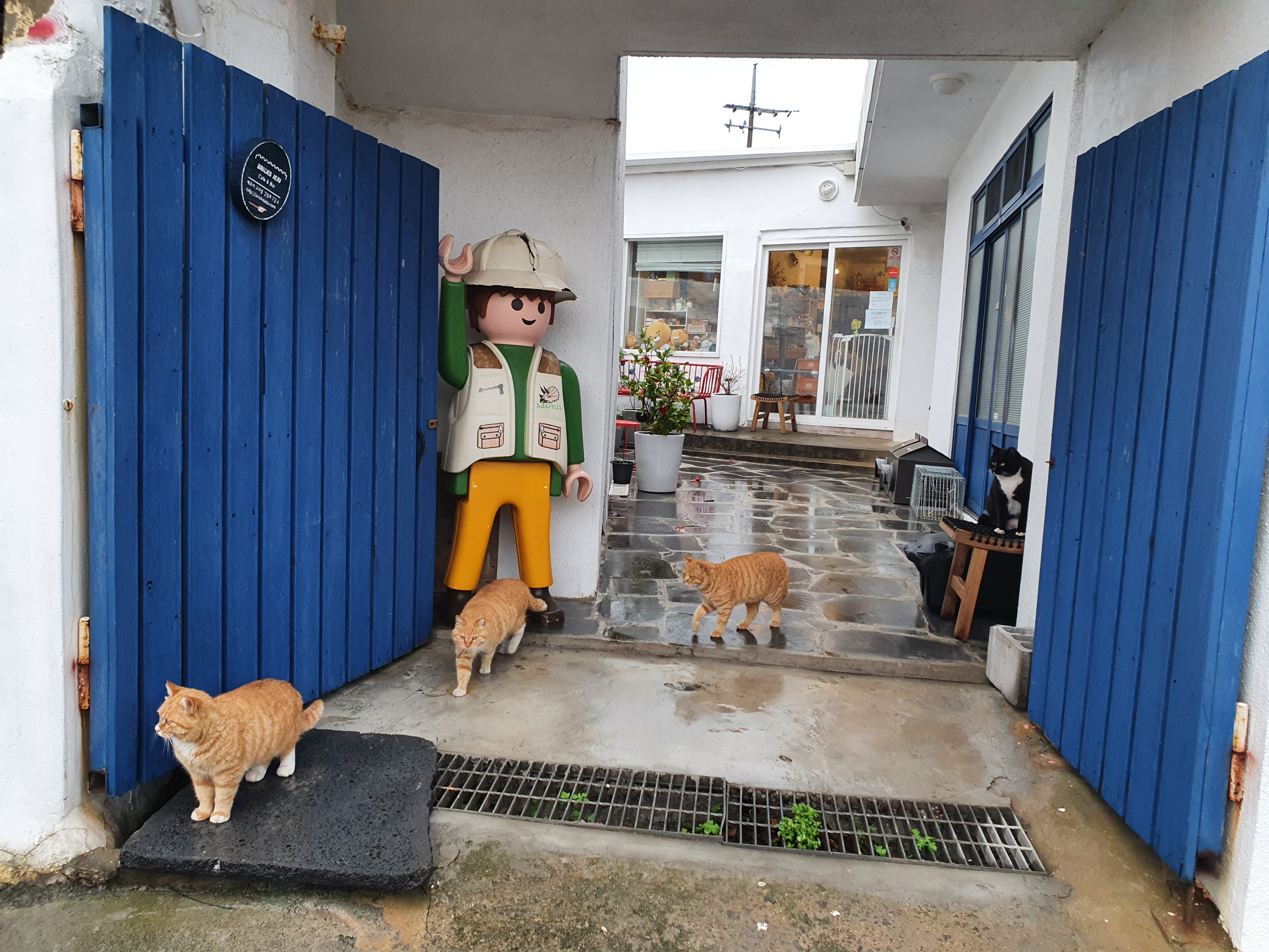 카페 입구로 우르르 들어오는 고양이들이