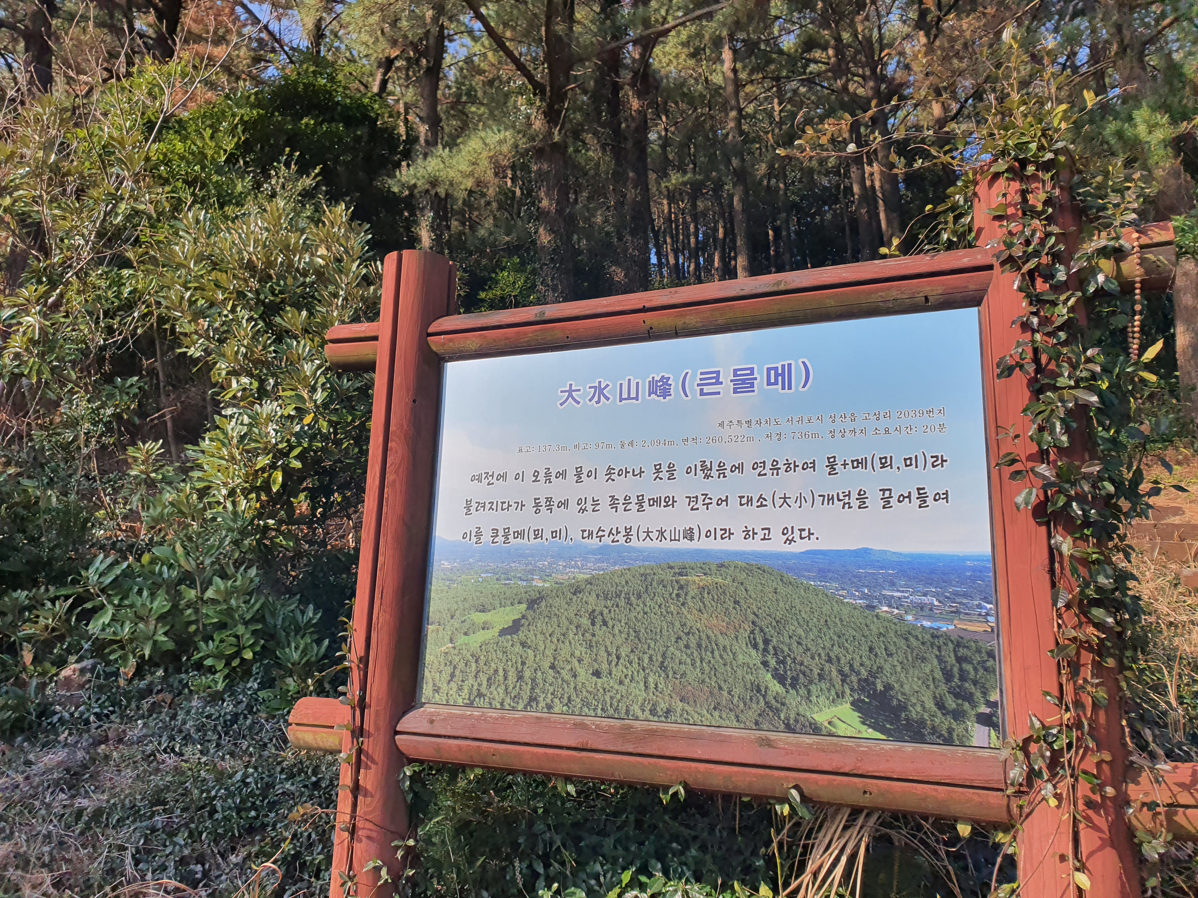 예전에 이 오름에 물이 솟아나 못을 이뤘음에 연유하여 물+메(뫼,미)라
