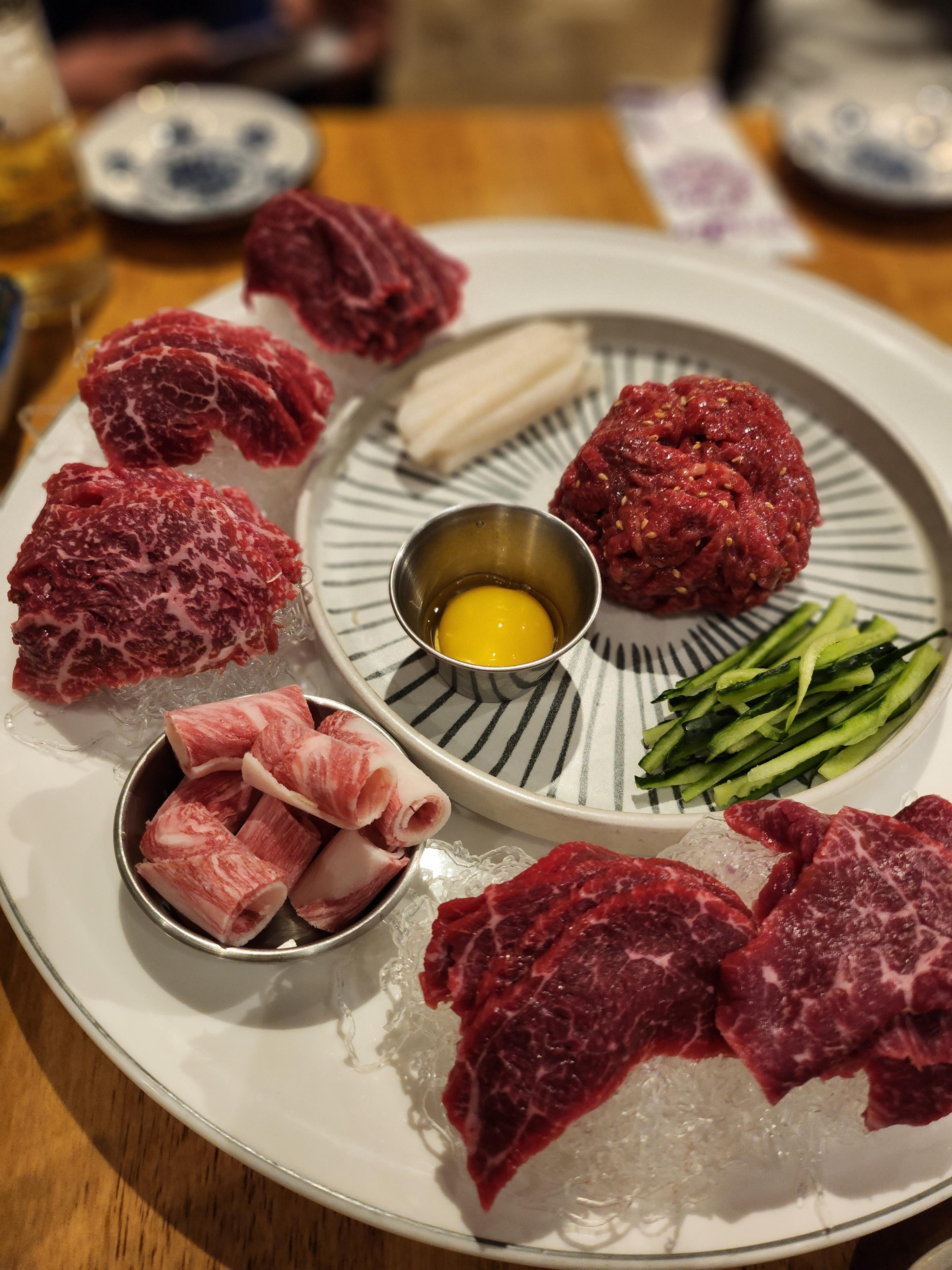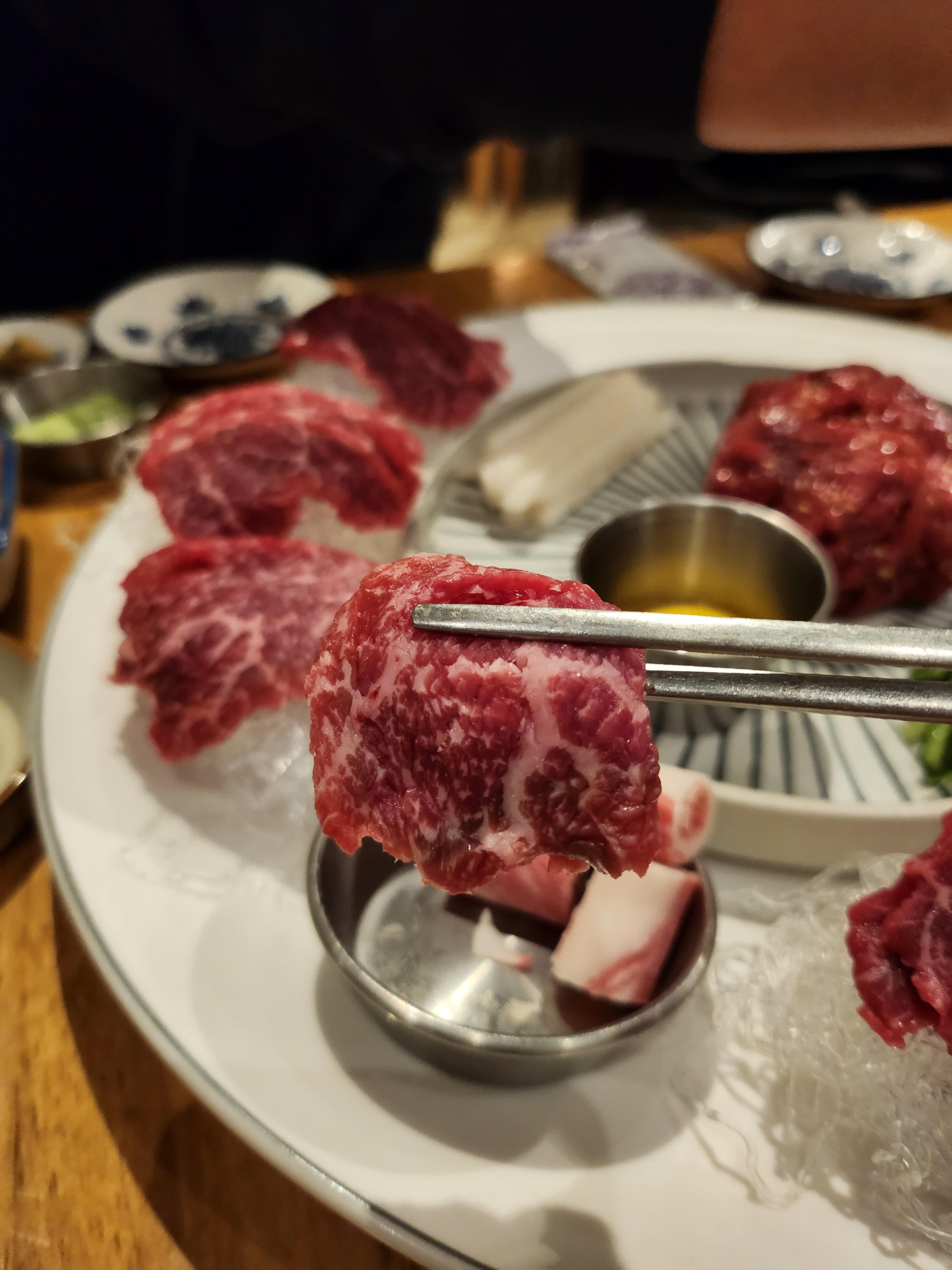 찰진 육사시미는 입에 넣으면 쫙 달라붙는데 식감이 아주 좋다. 테이블에 놓여진 소금과 후추, 기름장에 콕 찍어 먹거나, 함께 제공되는 고추냉이를 살짝 얹어서 먹으면 맛이 배가 된다.