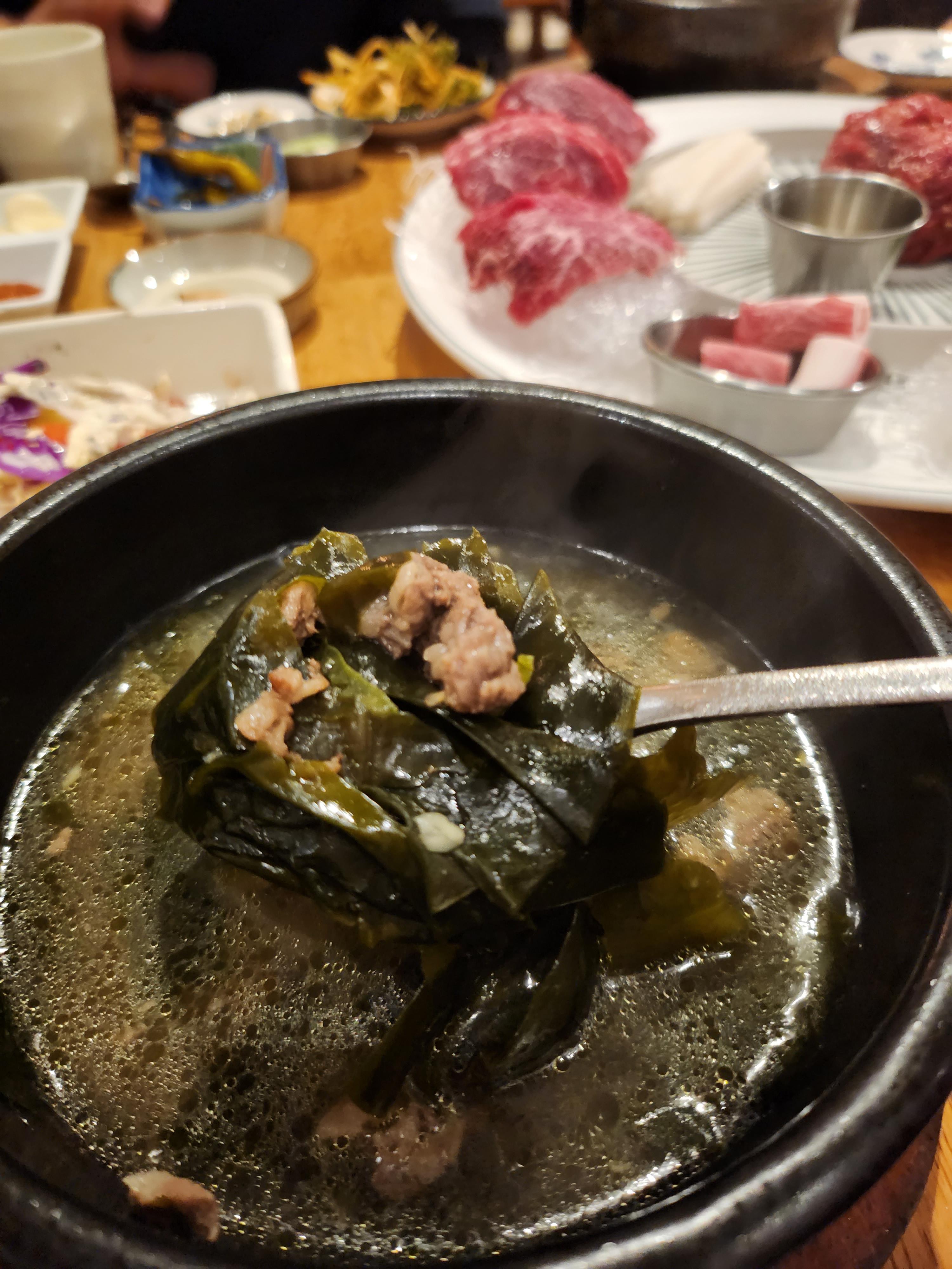 대 사이즈를 주문해서 그런지 평소와 다르게 미역국이 나왔는데, 여기도 소고기가 듬뿍 들어있어서 공깃밥에 미역국 한그릇만 먹어도 든든할 것 같다. 고소하고 깊은 맛. 역시 고기가 좋으니 미역국도 맛이 좋다.