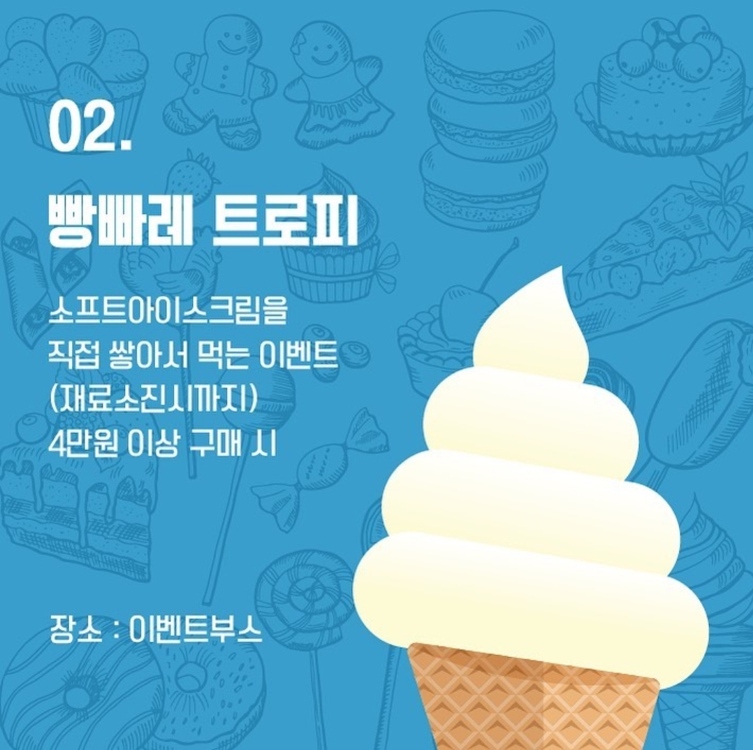 저는 줄을 서다가 줄이 너무 길고, 빵 크레인 이벤트는 작은 시판 과자봉지를 뽑는 것이고 빵빠레 트로피 이벤트는 소프트 아이스크림을 직접 쌓아서 먹는 이벤트인데 그나마도 기계 고장으로 크레인 이벤트로 대체되더라고요. 보통 이런 이벤트에서는 빵집 상품권을 주거나 하는데 시에서 별로 투자를 안한건지 이벤트 상품이 정말 너무 별로라 그냥 안받고 나왔습니다.
