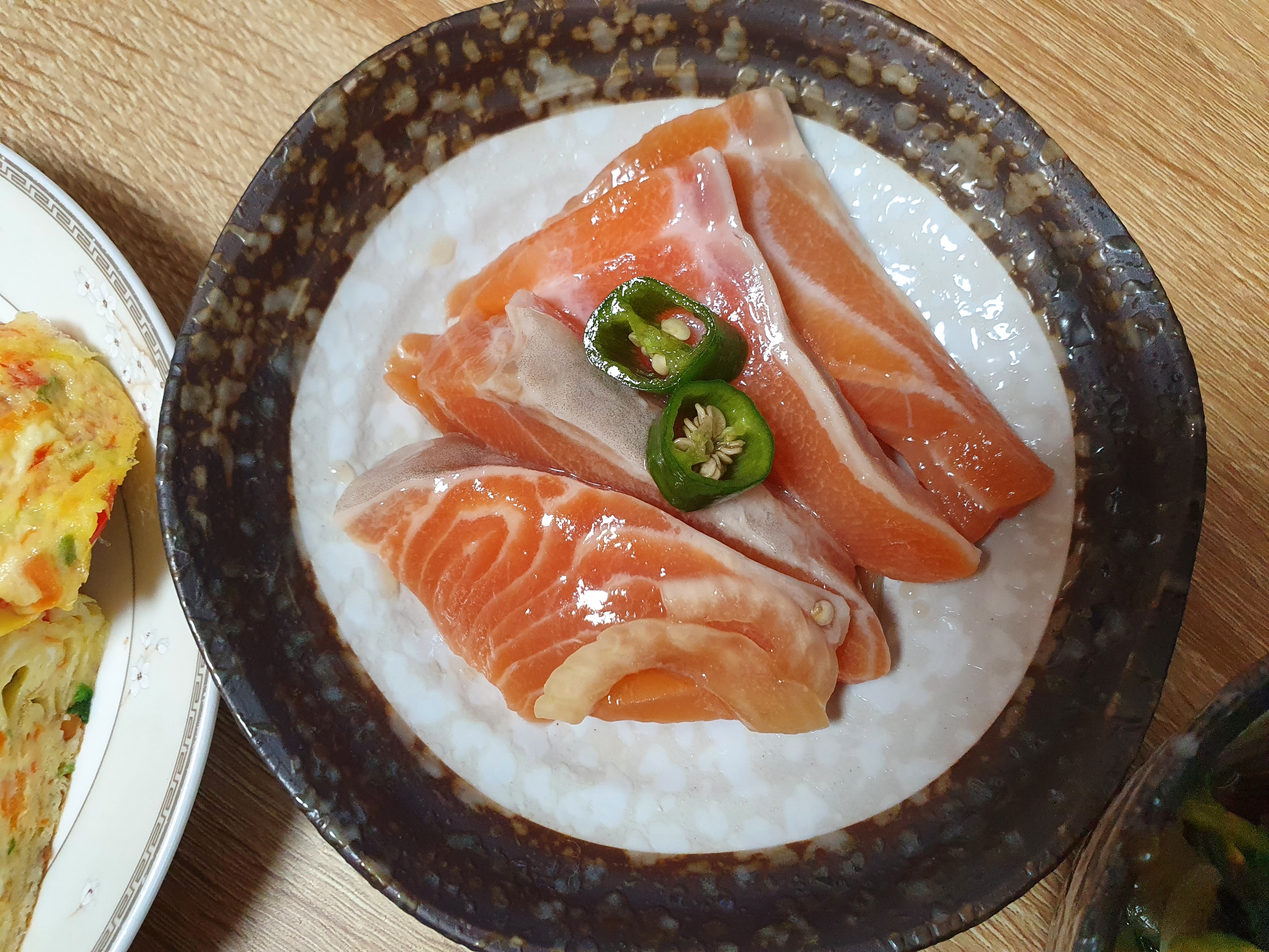 연어와 양파 그리고 고추냉이를 함께 올려먹으면