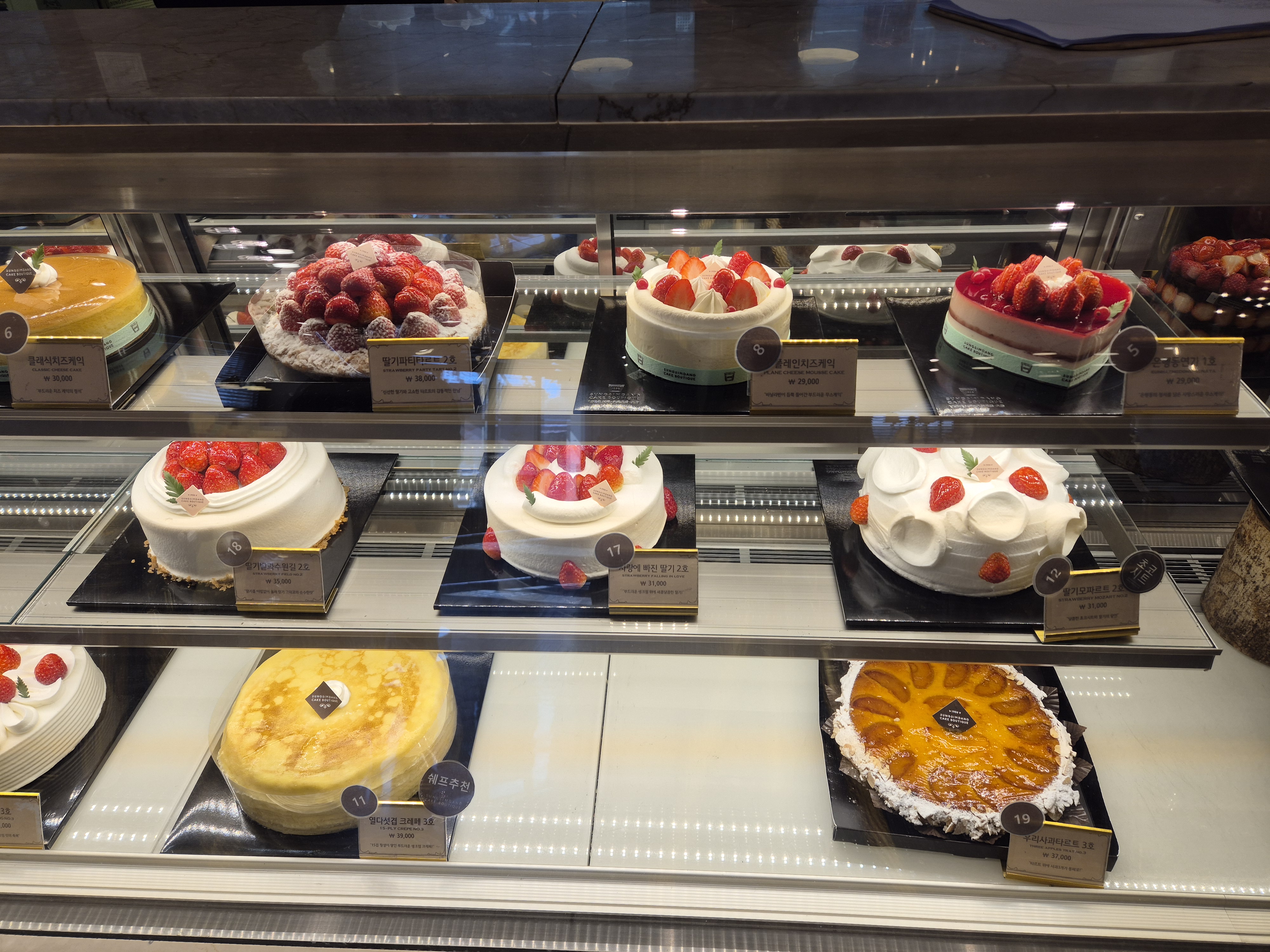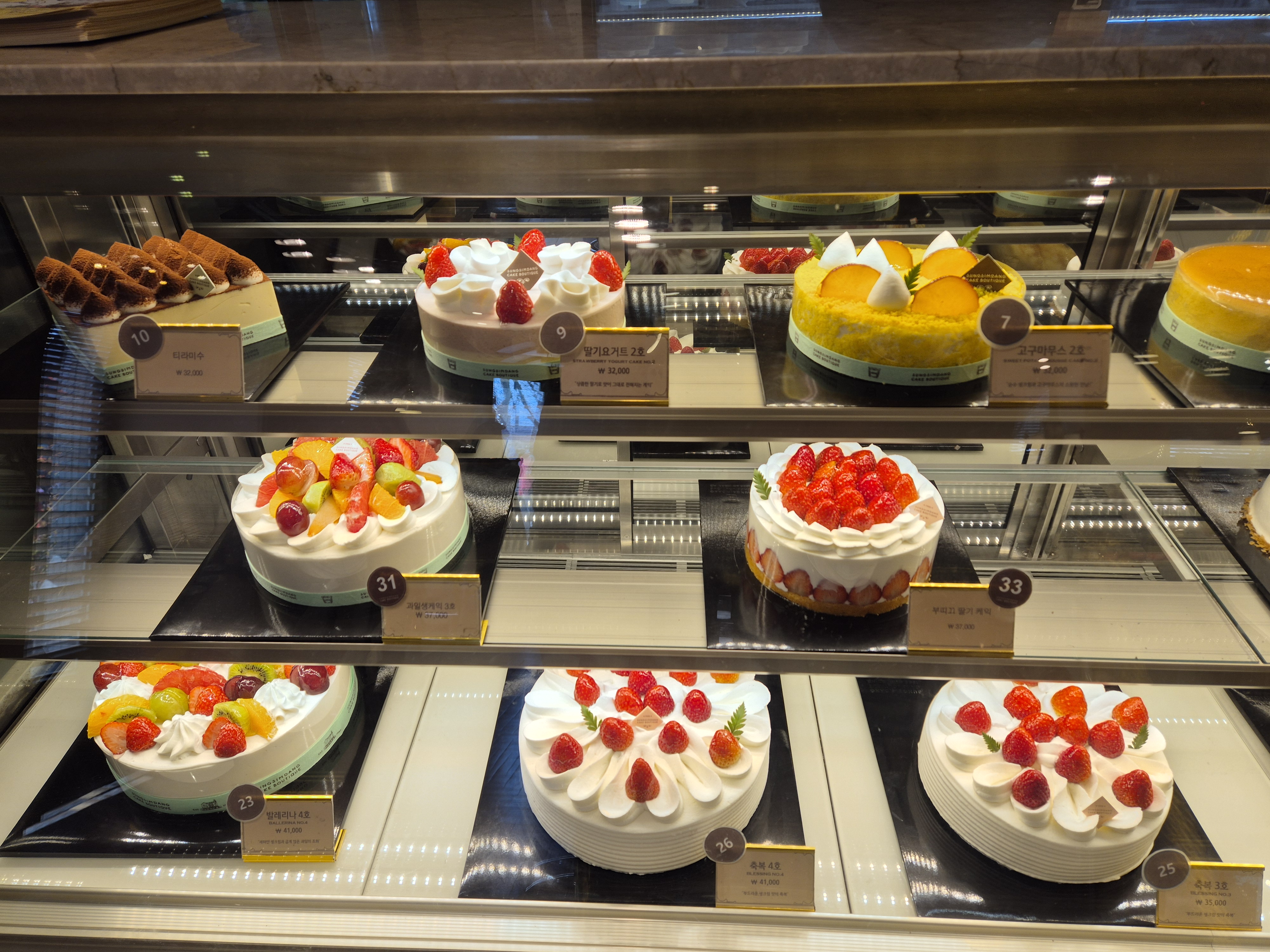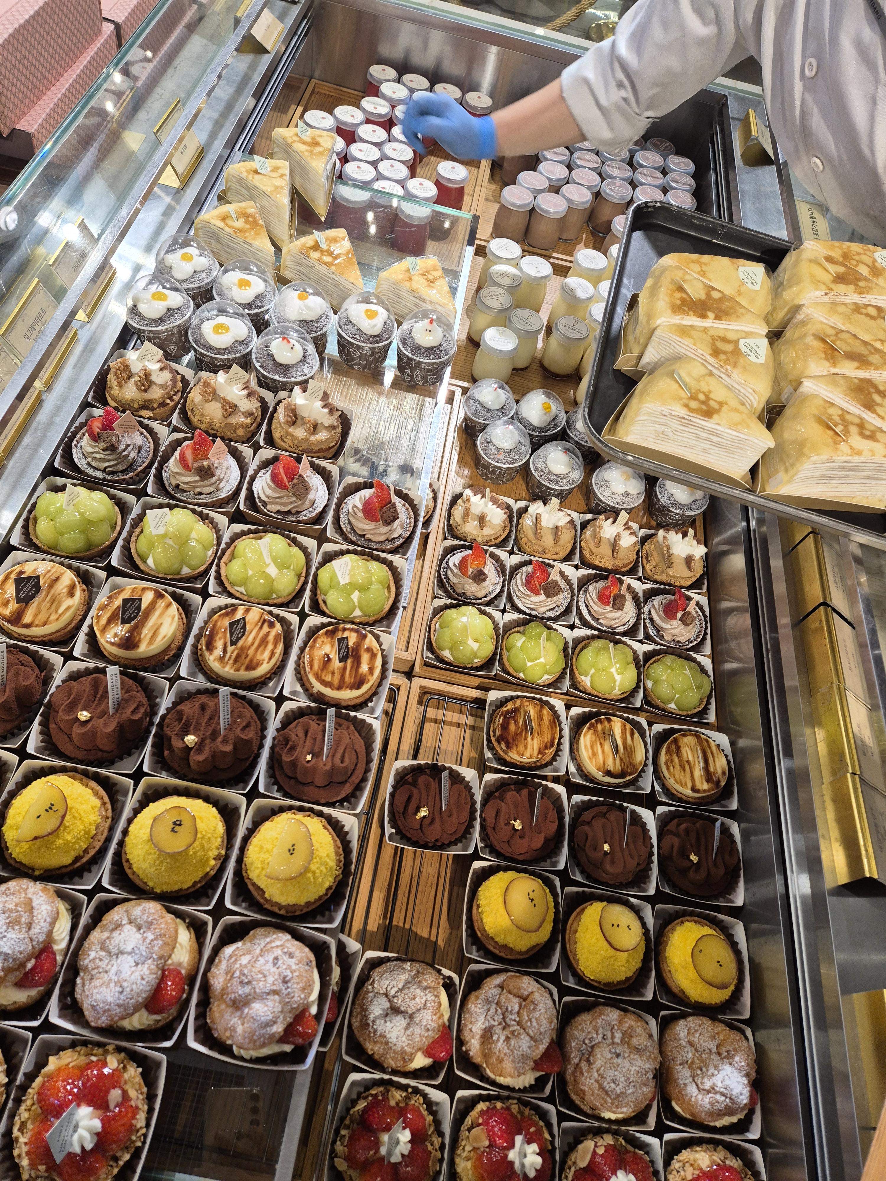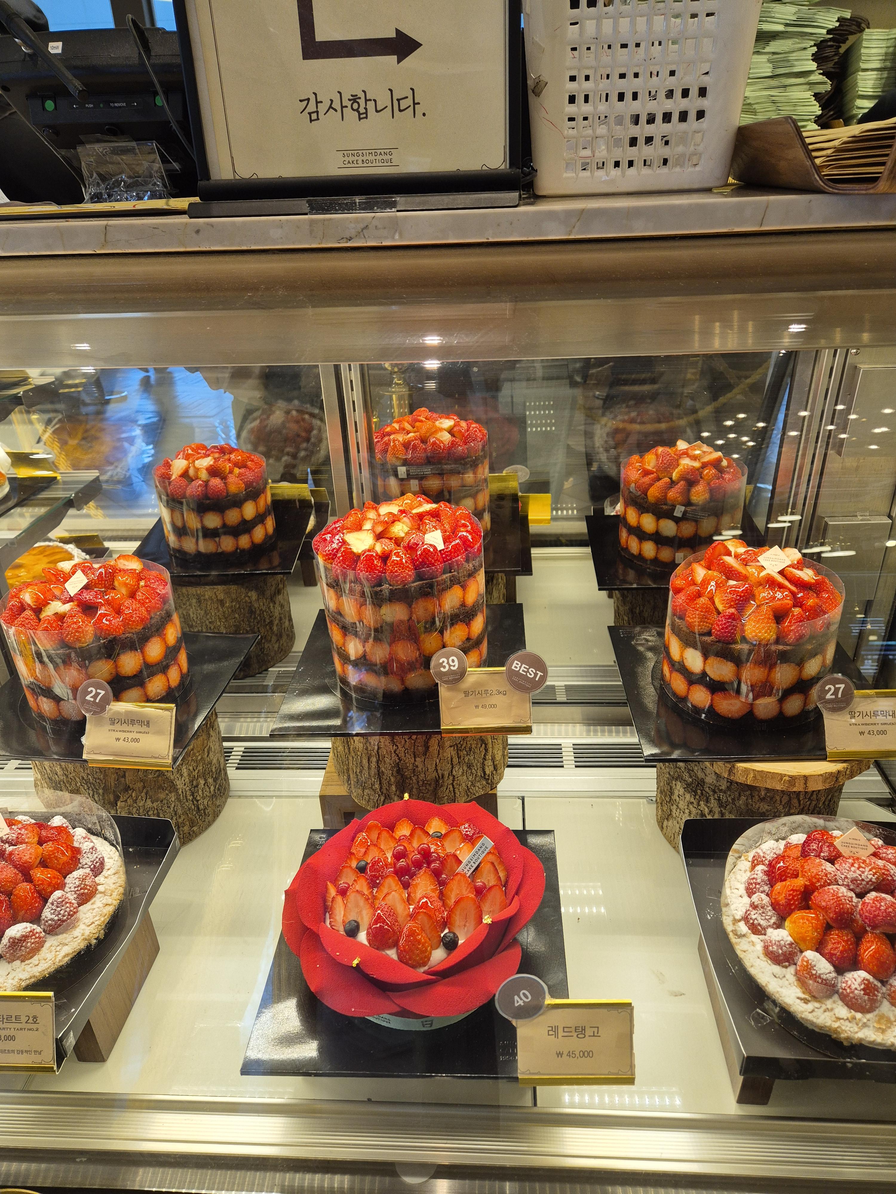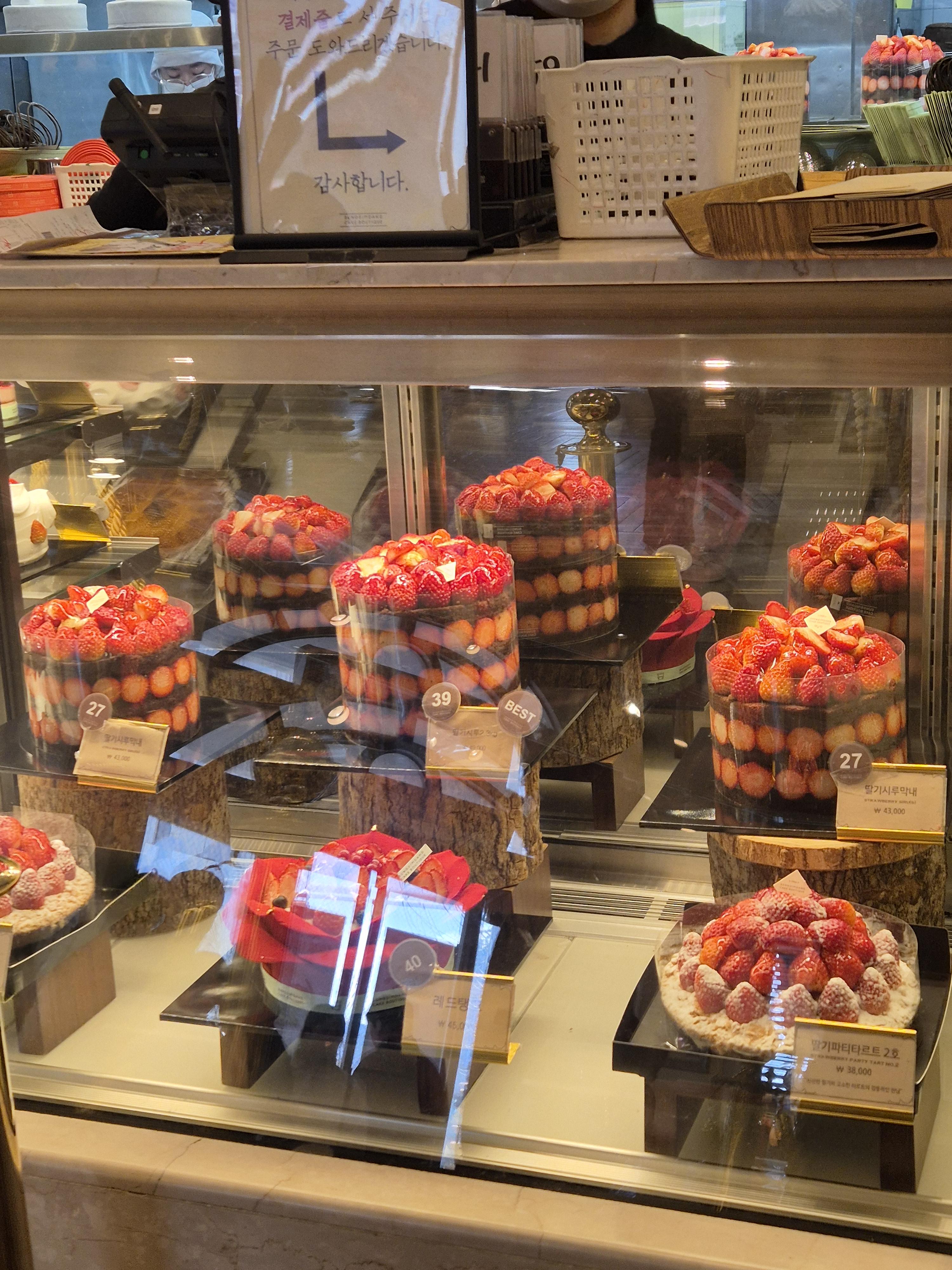 이 외에도 생크림 딸기 케이크, 딸기무스 케이크, 아는 사람만 먹는다는 크레이프 케이크, 치즈케이크, 고구마케이크, 티라미스, 생과일 케이크까지 다양하게 진열되어 있었어요.