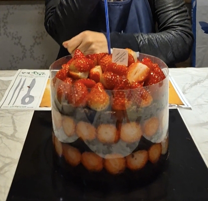 딸기 시루의 등장으로 생일 파티는 모두가 행복하게 마무리되었는데요, 저도 너무 즐거워서 케이크 사진을 제대로 못 찍었네요 하하.. 케이크와 딸기를 잡고 있는 저 필름지를 벗겨내면 모양을 제대로 유지하기가 힘듭니다. 초코 시크가 워낙 부드럽고 딸기는 무겁기 때문이지요. 커팅할 때 다 흘러내린다고 생각하시면 돼요. 하지만 시트를 너무 단단하게 만들면 맛이 따로 놀기 때문에 어쩔 수 없는 선택이었던 것 같아요. 딸기시루를 사서 멀리 이동한다고 하면 필름지 주변 남는 공간을 완충제로 채워 가시면 조금 더 안전하게 이동할 수 있을 것 같습니다.