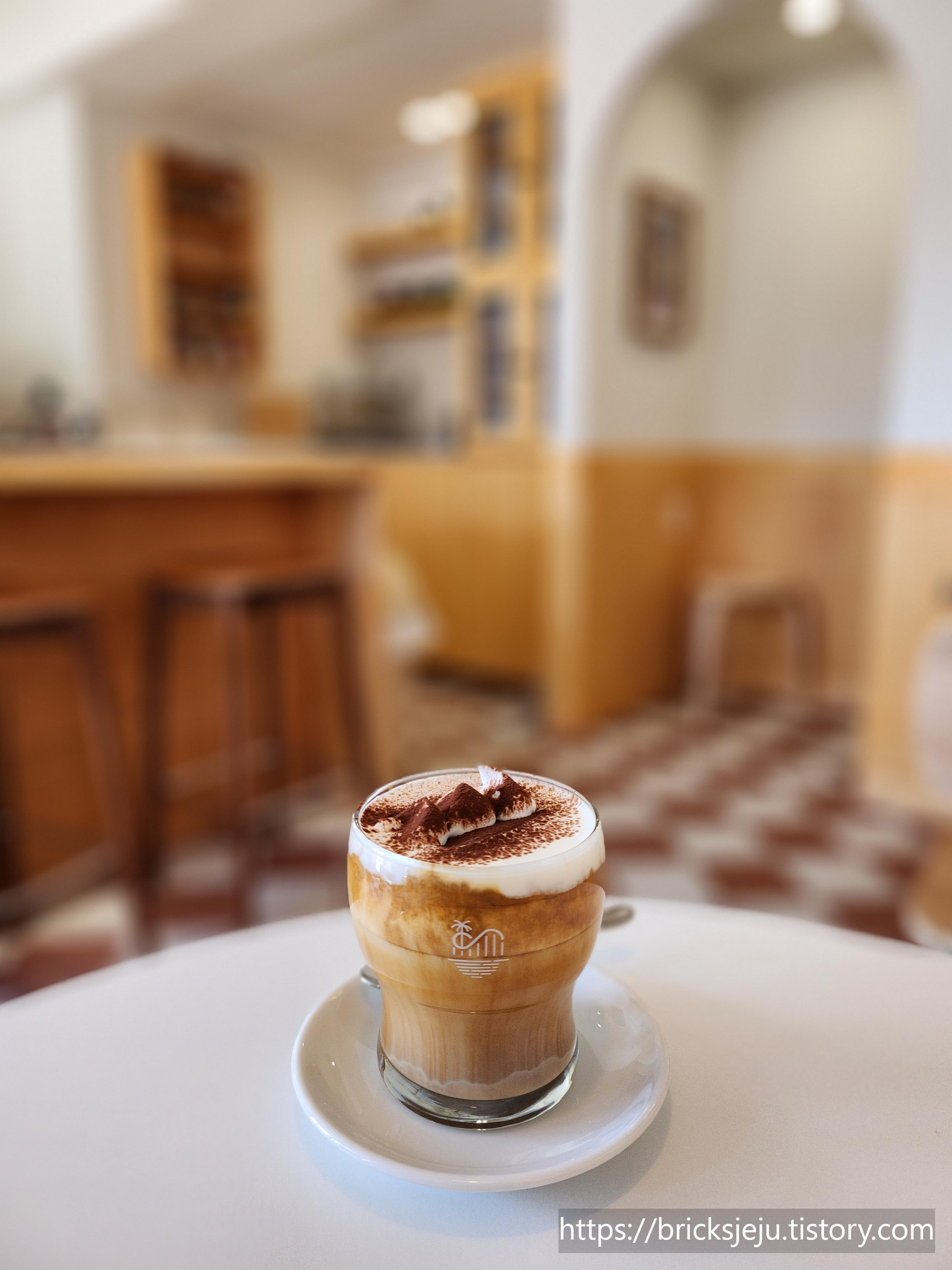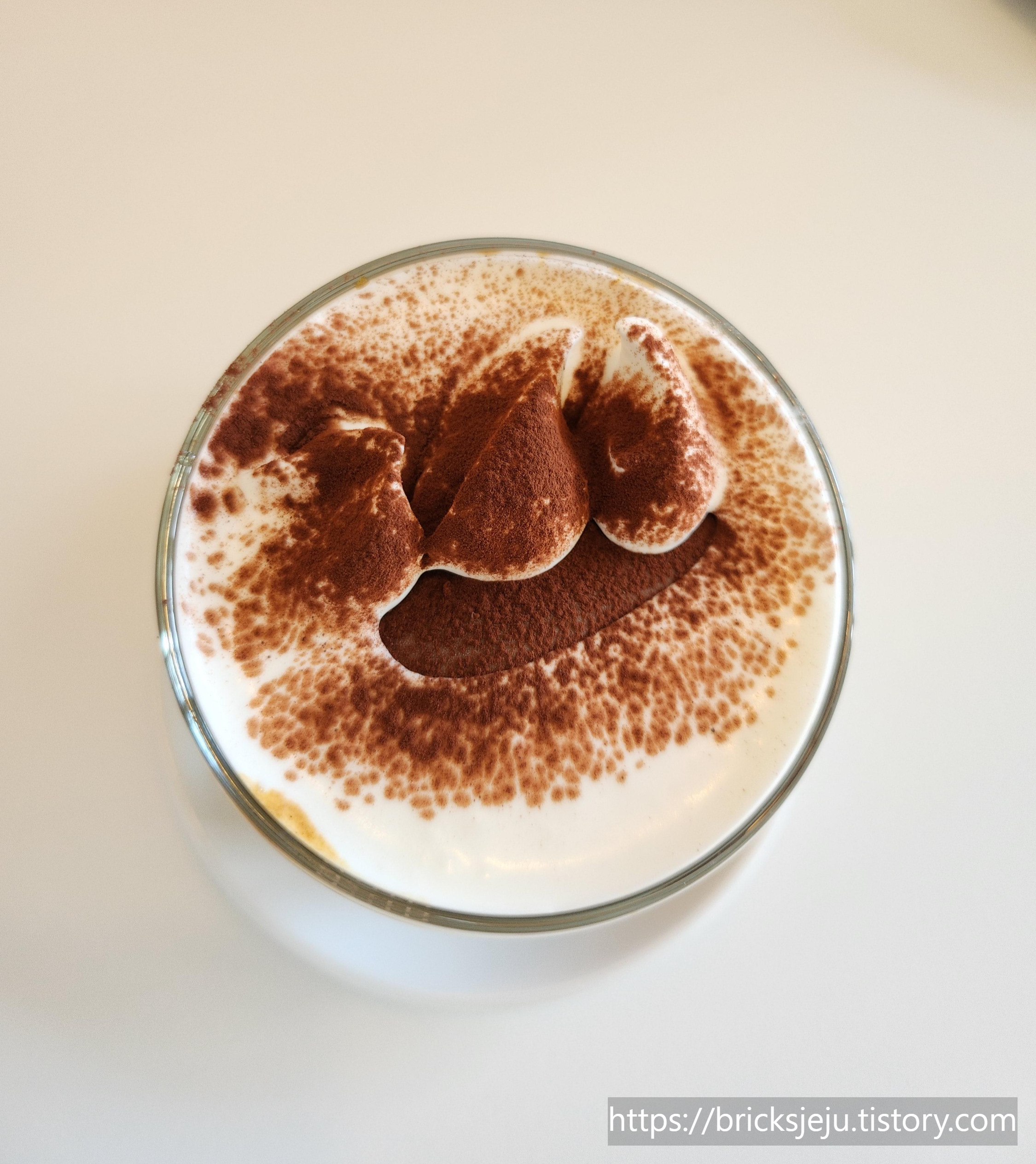 정성들여 예쁘게 크림을 올리고 코코아 파우더 팡팡 뿌린 크림 라떼.