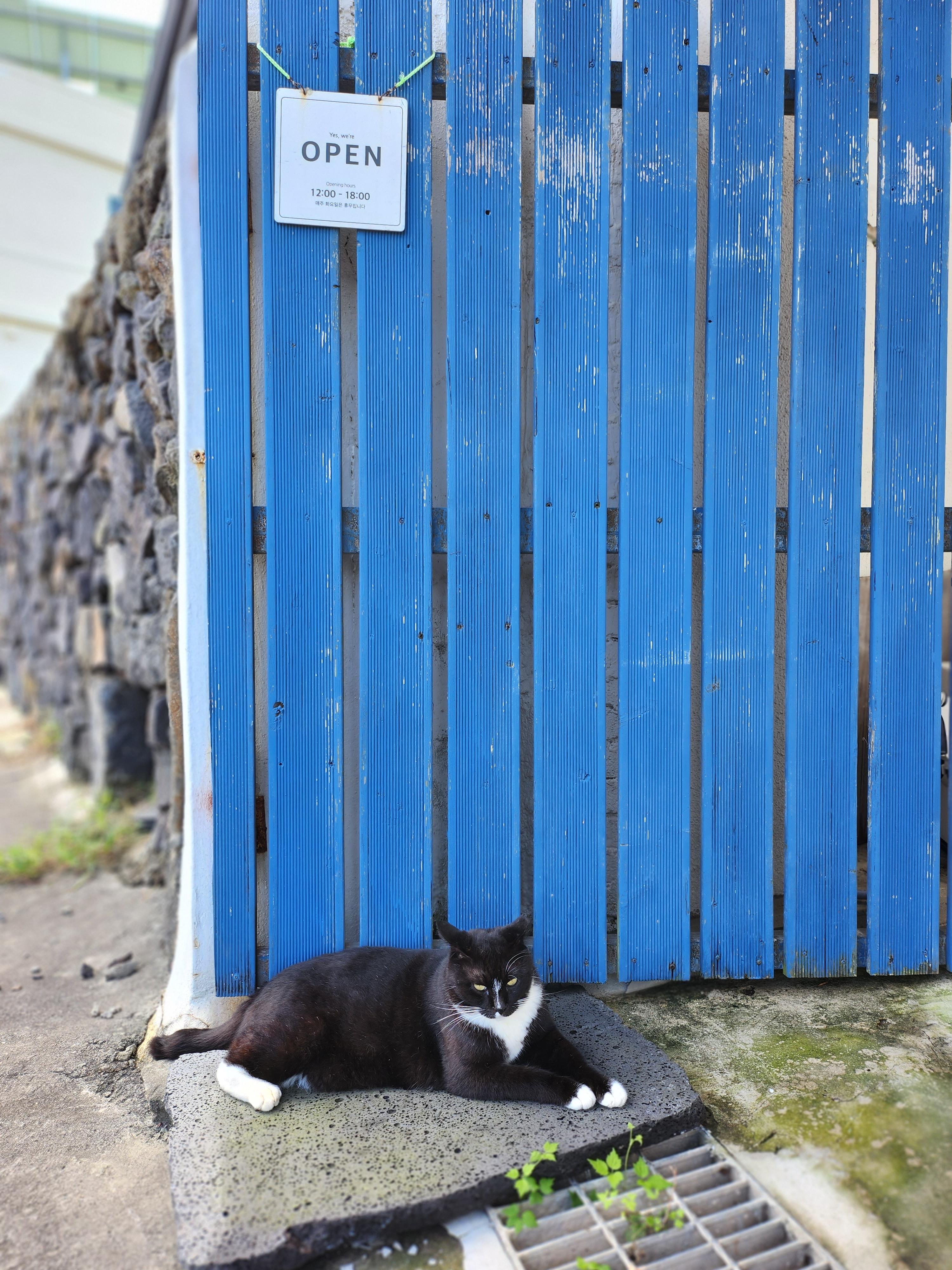 아무데나 앉지 않는 고양이답게, 판석 위에 앉아 카페 오픈을 도와주는 오늘의 오픈 요정 필통씨