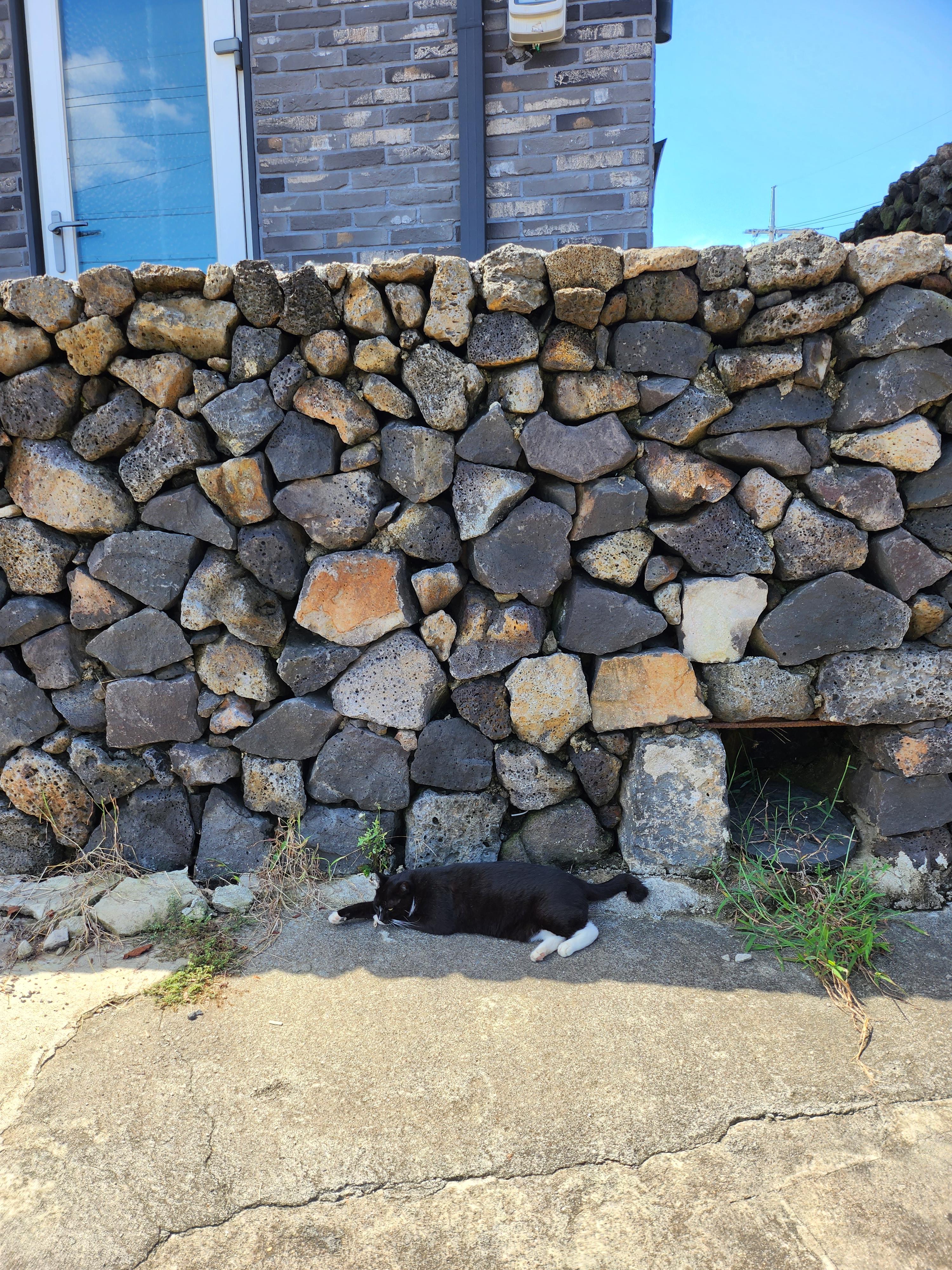제주도 돌담 위에 자리잡은 고양이